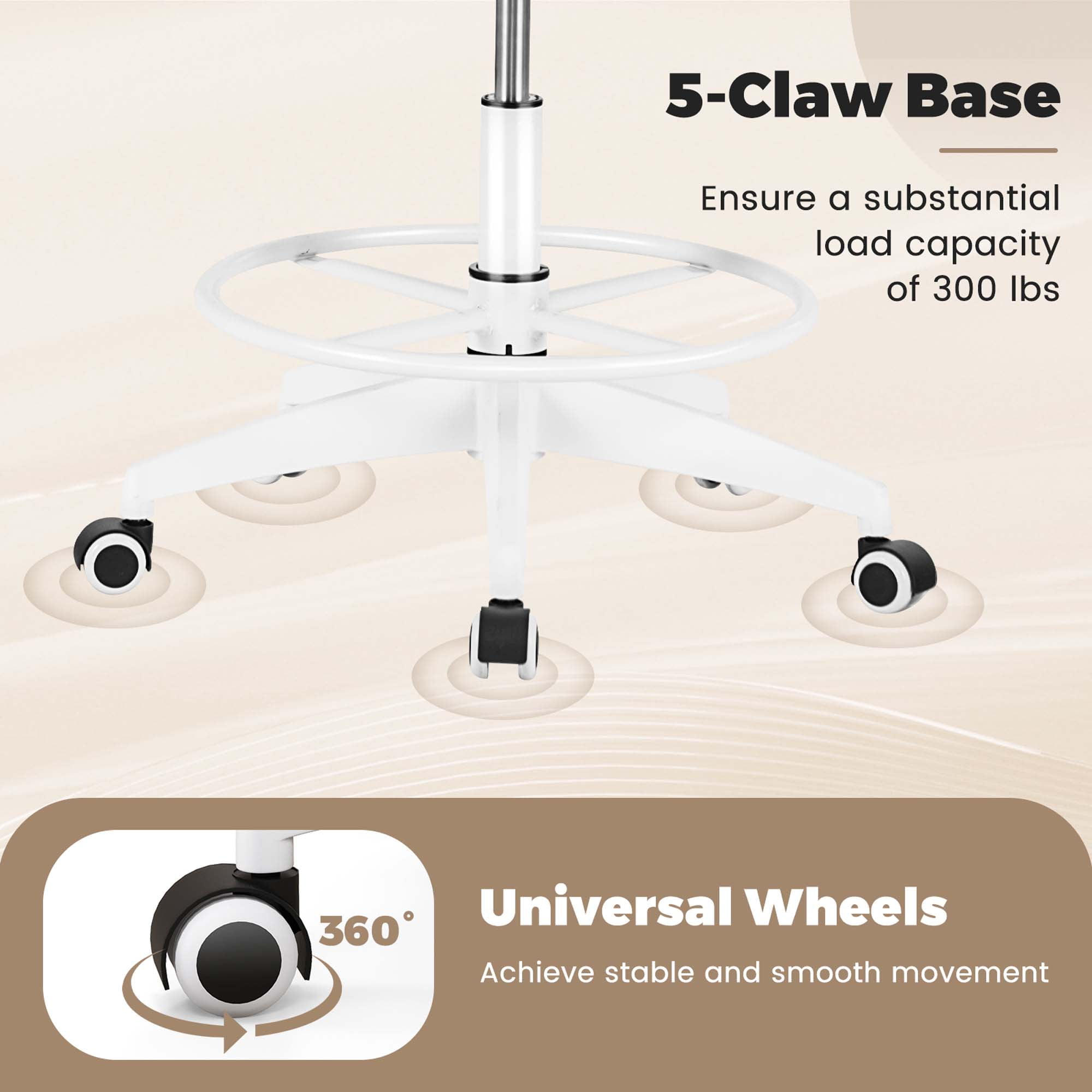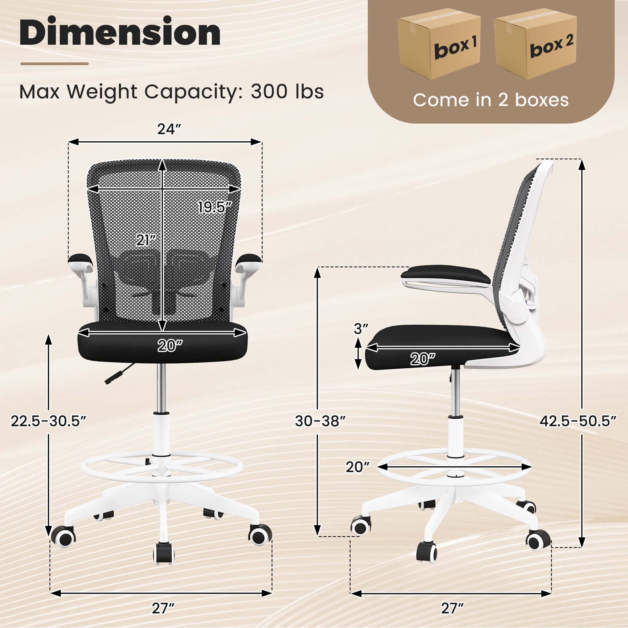Embrace exceptional comfort and support with the adjustable lumbar support of the drafting chair. Its S-shaped backrest and 2″ adjustable lumbar support ensures proper posture and alleviate backaches. The task chair’s skin-friendly and long-lasting mesh fabric and thick sponge padding offer a cozy touch and ideal durability. Enjoy flexibility with its swivel seat and 22.5″-30.5″ adjustable seat height, catering to your specific needs. The 7.5″-13″ adjustable footrest ring reduces strain on your lower body, perfect for drafting tables or sit-to-stand desks. Flip-up padded armrests provide extra space or cozy arm support while working. With a stable 5-claw base and smooth universal wheels, this drafting chair ensures stability and effortless mobility. Experience the perfect blend of stability, comfort, and convenience with this versatile drafting chair. Feature With an adjustment lever, it is easy to adjust the adjustable seat height The 360° swivel seat is supported by the stable gas rod and 5-claw base Adjustable footrest ring can be easily controlled by the adjustment knob Designed with an S-shaped backrest that will adapt to your body curves Adjustable lumbar support offers ergonomic support to reduce discomfort Thanks to high-density sponge, the thick padding is elastic to offer soft touch Features the dense mesh fabric, which allows for optimal breathability 90° flip-up armrests provide more flexibility and allow you to save more space Padded surface of armrests is comfortable and can better rest your arms The flexible office chair will ensure a substantial load capacity of 300 lbs Comes with the universal wheels to achieve stable and smooth movement Specification Color: Black & White Material: Mesh Fabric, Sponge, PP Overall Dimension: 27″ x 27″ x 42.5″-50.5″ (L x W x H) Size of Backrest: 19.5″ x 21″ (L x H) Size of Seat: 20″ x 20″ (L x W) Thickness of Seat: 3″ Height of Seat: 22.5″-30.5″ Height of Armrests: 30″-38″ Outer Spacing of Armrests: 24″ Diameter of Footrest Ring: 20″ Height of Footrest Ring: 7.5″-13″ Adjustable Range of Seat Height: 8″ Adjustable Range of Lumbar Support: 2″ Max Weight Capacity: 300 lbs Net Weight: 28.5 lbs Package Includes: 1 x Drafting Chair 1 x User Guide