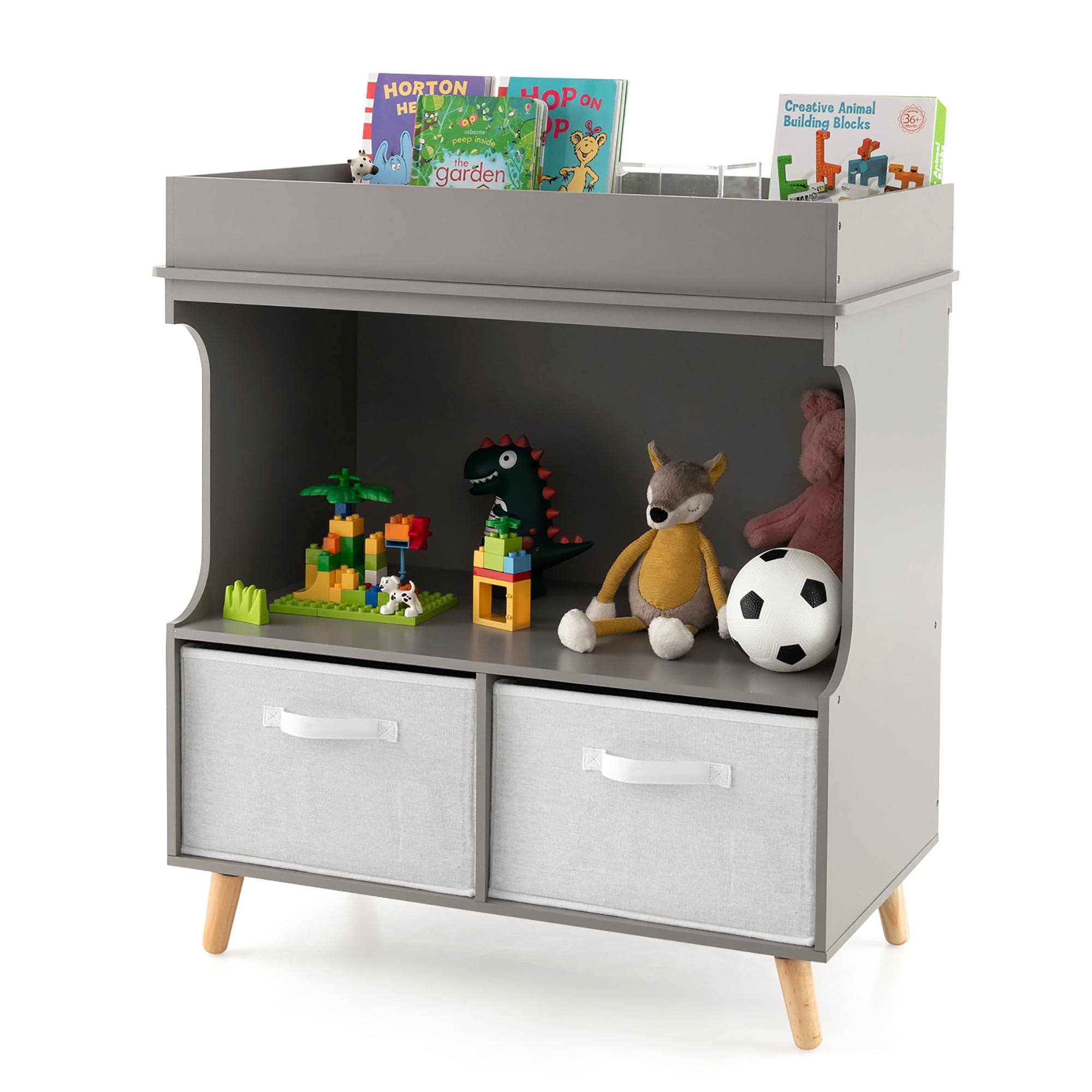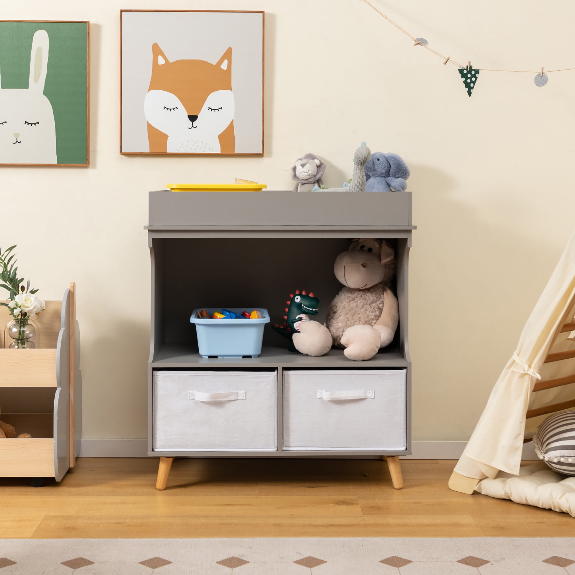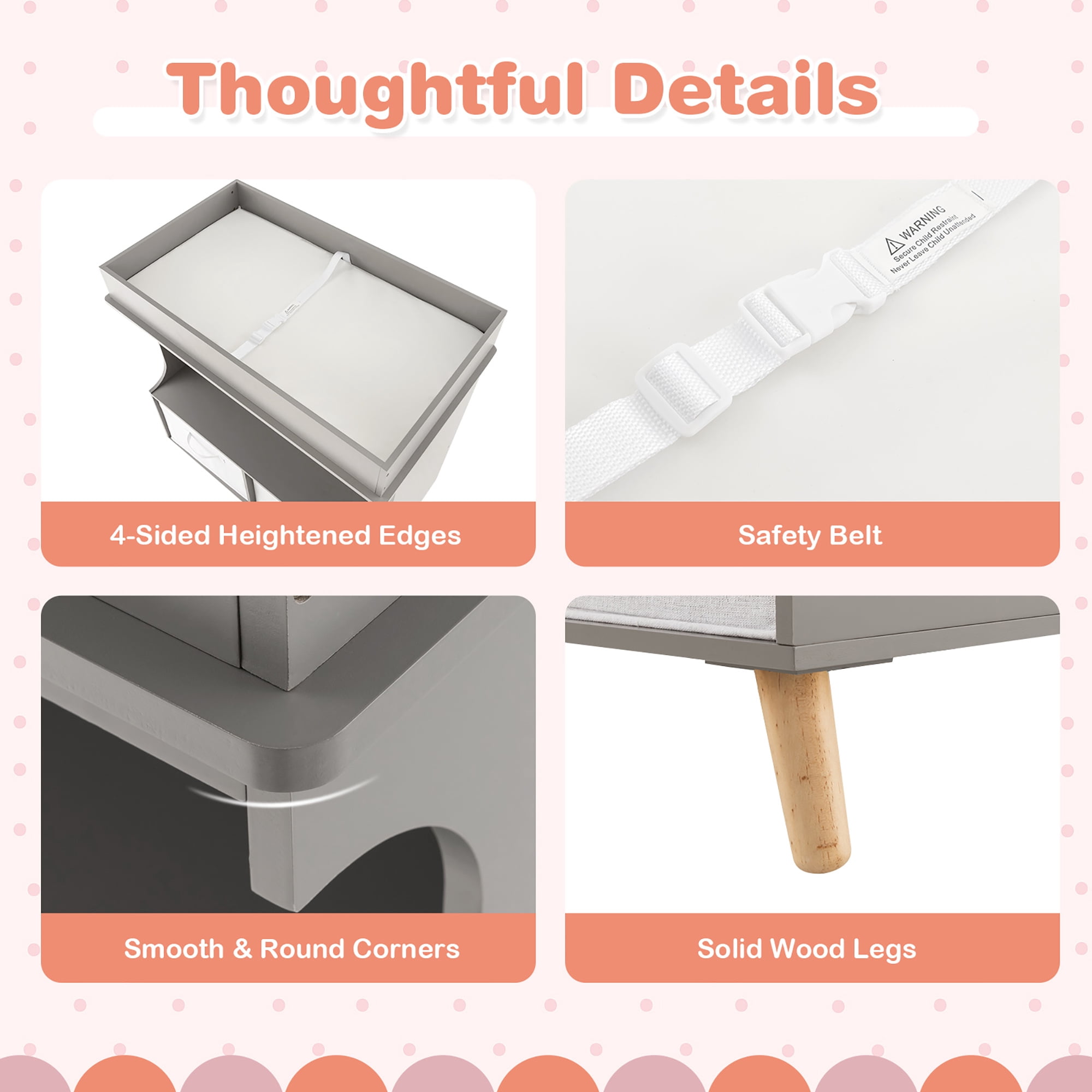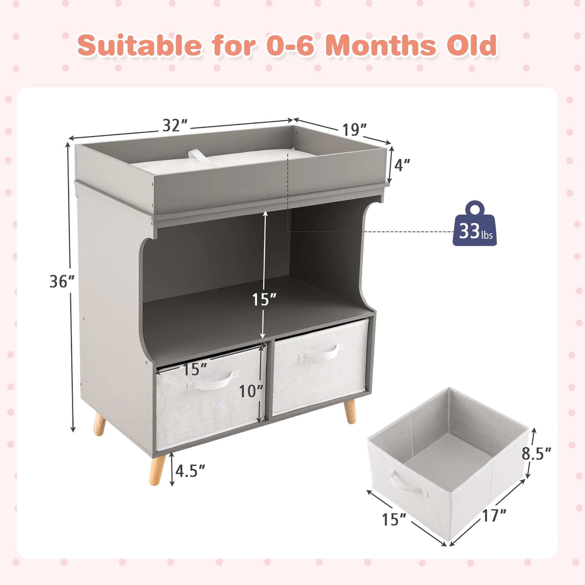 Make every parent’s life more convenient with this changing table dresser! With the proper height design, this changing table can avoid backache caused by bending over to change diapers or clothes. The waterproof changing pad with soft sponge filling is comfortable for the baby to lie down and easy to clean. Besides, the safety belt and 4-side raised fence keep your baby safe. What’s more, the diaper changing table has a large changing area and open compartments & drawers to store a variety of baby supplies. When your baby grows up, you can remove the pad to use this changing table as a dresser, storage cabinet and more. Feature Large storage space for diapers, clothes, towels and other baby items Can be used as a baby changing table, dresser, storage cabinet, etc 2 removable and foldable fabric drawers add convenience Changing pad with a safety belt and waterproof surface Raised fence protects baby and items from falling Ideal height, no more bending over to change diapers Spacious countertop for storage when not in use Solid wood legs offer strong support and stability Suitable for 0-6 months old Specification Color: Grey Material: MDF, Pine, Sponge, PEVA, Terylene Cotton Product Dimension: 32” x 19” x 36” (L x W x H) Drawer Dimension: 17” x 15” x 8.5” (L x W x H) Changing Pad Dimension: 31” x 17” (L x W) Suitable Age: 0-6 Months Old Net Weight: 51 lbs Weight Capacity of Top: 33 lbs Weight Capacity of Each Shelf: 11 lbs Package Includes: 1 x Baby Changing Table Dresser 1 x User Guide