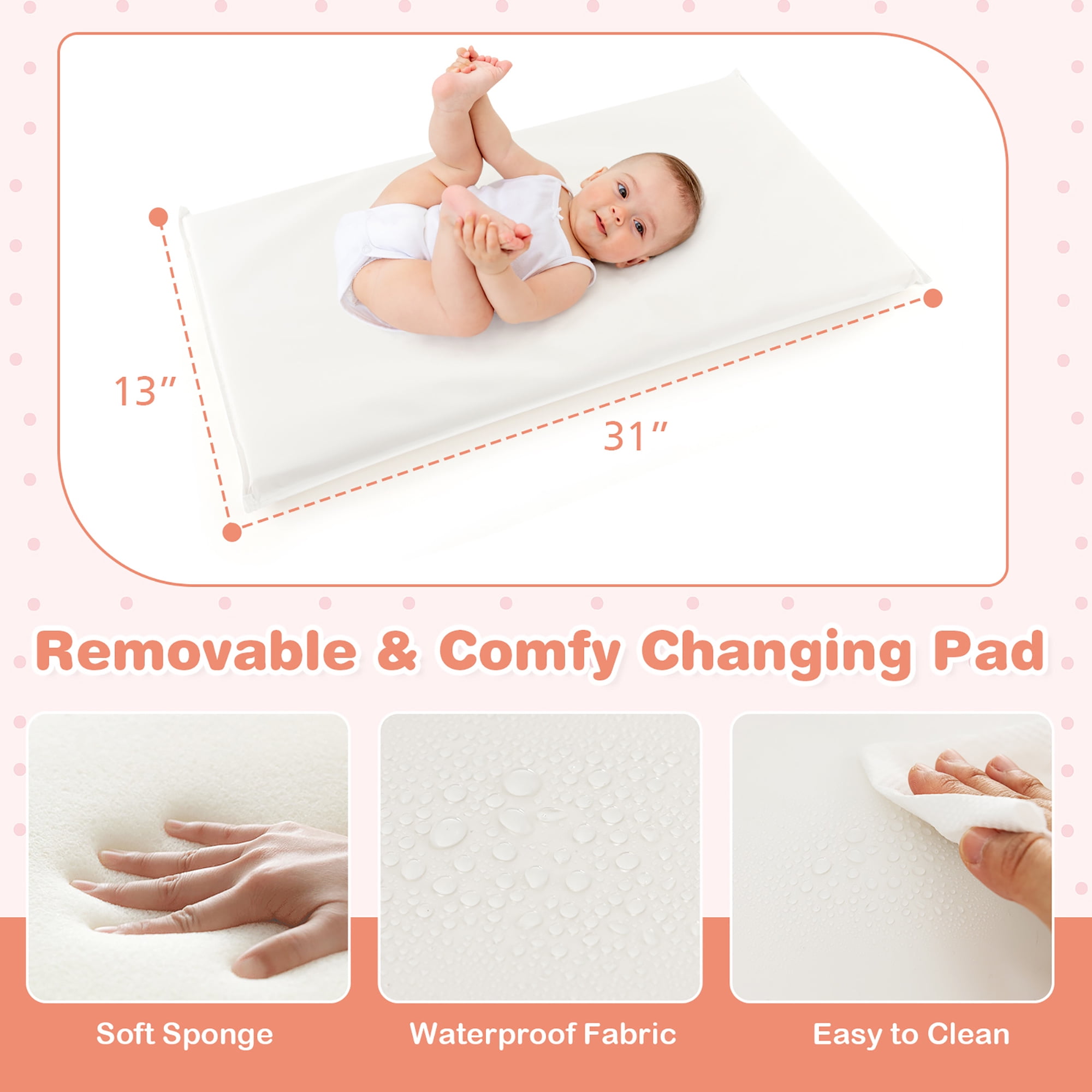 Multipurpose Nursery Center: This newborn nursery dresser can be used for changing diapers, changing clothes, massage & nursing, etc. In addition, you can remove the top changing pad to use the table as a storage dresser as your baby grows up. Sturdy & Well-made Changing Table: Crafted from premium MDF with double-sided sticker process and solid wood legs, this infant changing station is stable, strong, waterproof and sturdy. Multiple Storage Options: This changing table comes with a large middle storage compartment (31” L x 15” H), bottom 2 storage cubbies storage bins and 2 removable & foldable fabric drawers to store diapers, feeding bottles, wet tissues, clothes, towels, toys and more. Removable & Comfy Changing Pad: The changing table is equipped with a 31” x 17” changing pad filled with soft sponge to offer ultimate comfort for your baby. Besides, the anti-tear & waterproof fabric ensures both long-term use and easy cleaning. Proper Height & Thoughtful Details: This changing table is designed with an ideal height of 36” for parents to change diapers without bending over, helping reduce waist pain and protect the spine. Moreover, 4-sided heightened edges and the safety belt prevent the baby from falling.