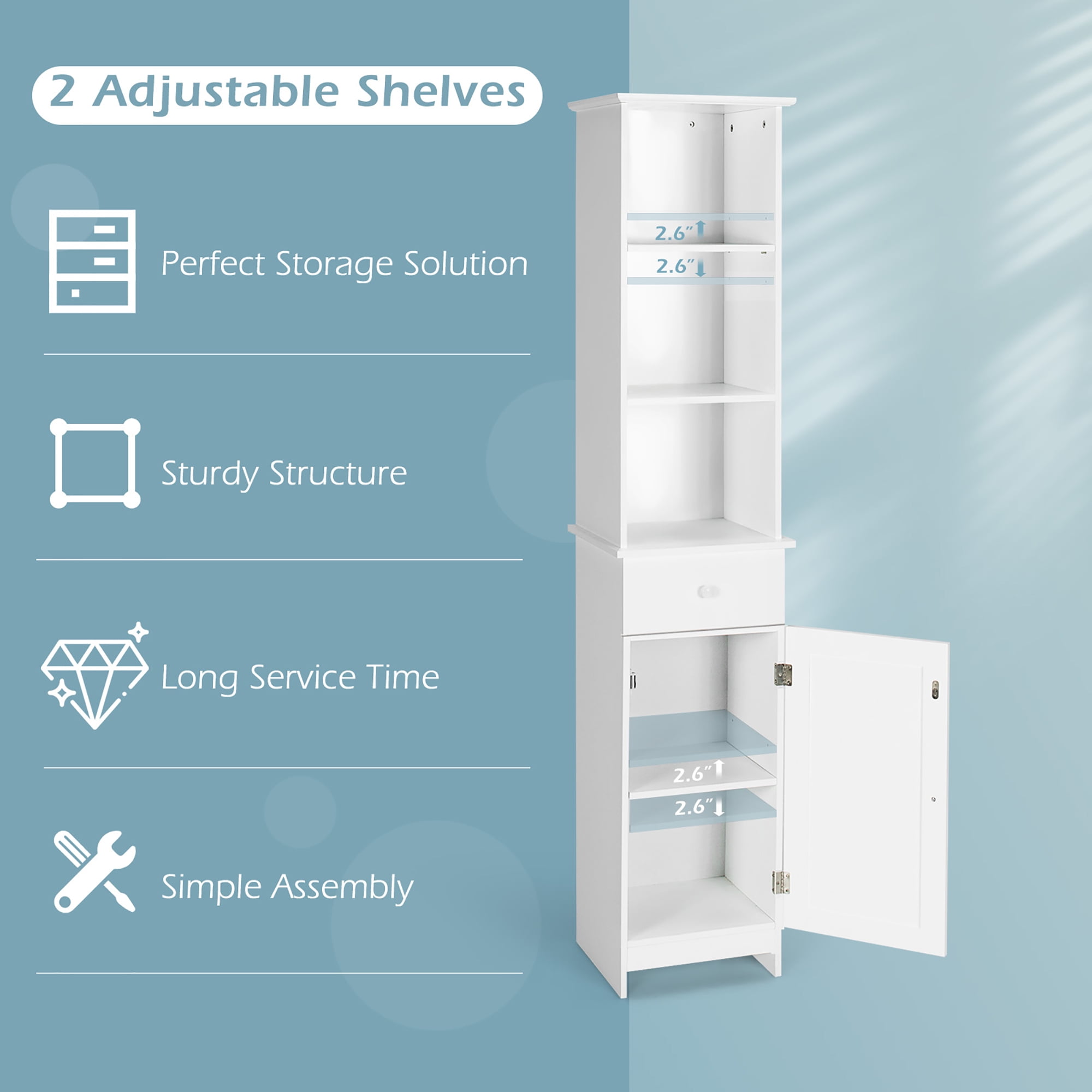 Organizer your essential with ease by using this bathroom tall cabinet! You can put different items on this bathroom cabinet to make them in order. Meanwhile, there are 2 adjustable shelves, which allows you to adjust them into 3 levels respectively to fit items of different heights. Considering the environment of the bathroom, this freestanding cabinet is made of sturdy MDF with waterproof surface to stand the test of time. And the 2 expansion bolts attach this bathroom linen cabinet to the wall for strong stability. What’s more, the vertical shape greatly saves your space so that you can put it at any corner for practicability. Feature Large storage space for various items storage and clutter reduction Accommodate items of different heights with 2 adjustable shelves Bring ample storage space while saving your home space with vertical shape Can be used for a long time because of its thick MDF Waterproof surface for easy maintenance Use 2 expansion bolts to attach the cabinet to the wall for stability and safety Widely use in the bathroom, living room, kitchen and other places Make a timeless addition to your home decoration Detailed instruction for easy installation Specification Color: White Material: MDF Overall Dimension: 13.5” x 12” x 64.5”(L x W x H) Inner Dimension of Drawer: 10” x 9” x 3.5” (L x W x H) Net Weight: 36 lbs Weight Capacity of Each Shelf: 22 lbs Weight Capacity of Drawer: 7 lbs Package Includes: 1 x Bathroom Tall Cabinet 1 x Instruction