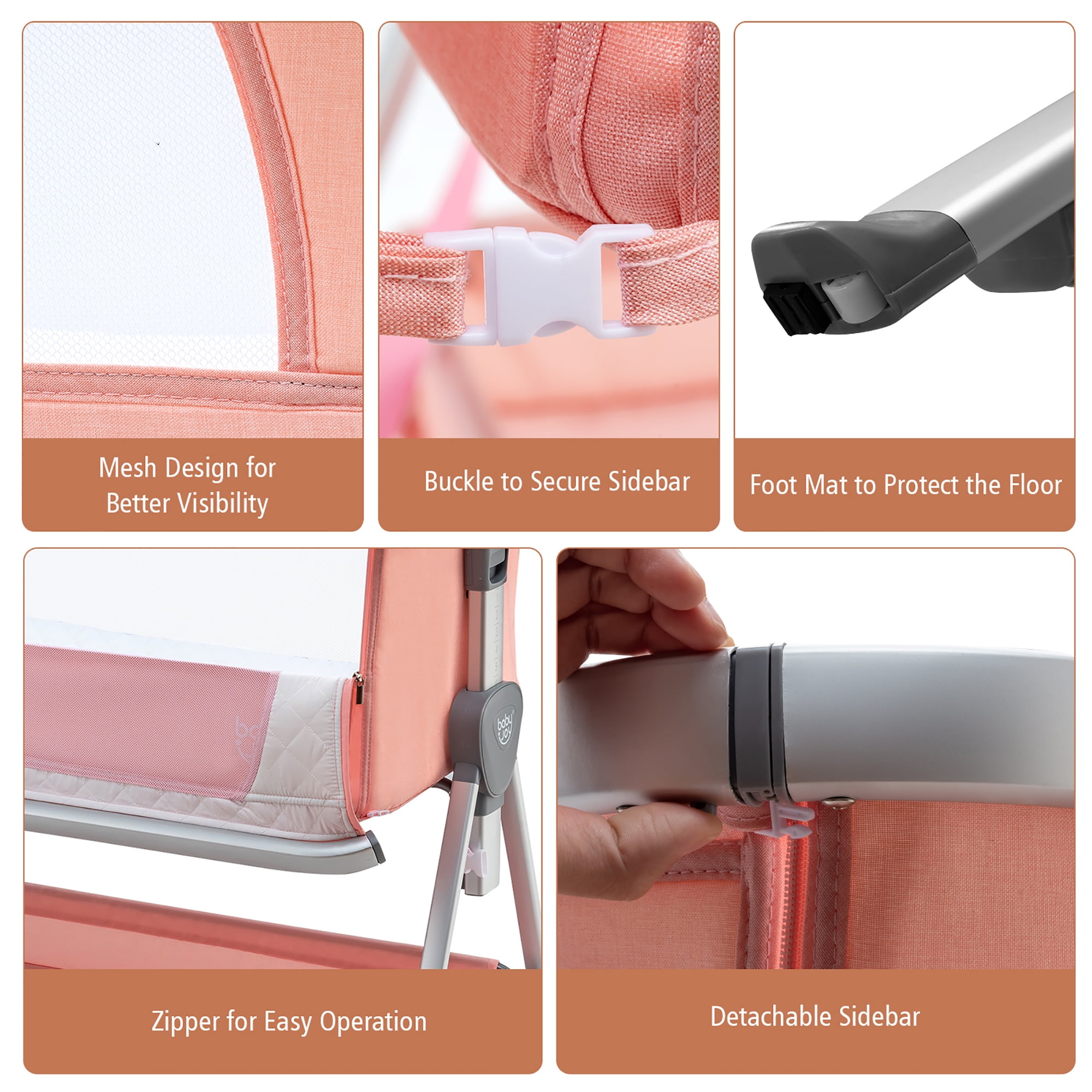 Our Costway unisex folding bedside crib comes with an ergonomic design that can provide your baby with great comfort. Composed of a strong aluminum alloy frame and high-quality soft fabric, our baby bedside bed can provide a comfortable and warm place for your baby to rest. The 7-level adjustable height is convenient for you to adjust according to your needs. In addition Flexible wheels at the bottom can help you move our baby crib easily. And the large storage basket at the bottom is convenient for you to store baby supplies or daily necessities. Feature A detachable sidebar and fix ed rope allow it to be easily attached to the parents’ bed Firm triangular structure and non-slip foot pads ensure high stability and baby’s safety Comfortable and detachable mattress protects baby’s spine Folding design for easy storage and carrying Strong and rust-resistant aluminum alloy frame ensures long service life 7-position adjustable height to meet your different needs Mesh on both sides provides good breathability and visibility Flex ible wheels make it easy to move Large storage basket is convenient for storing various daily necessities Specification Color: Peach Material: Aluminum Alloy + Linen + Mesh Product Dimension: 38.5” x 22” x 32.5” (L x W x H) Folding Dimension: 36.5” x 22.5” x 1” (L x W x H) Storage Basket Dimension: 36” x 13.5” x 4” (L x W x H) Adjustable Height: 28”/28.5”/29.5”/30.5”/31”/32”/32.5” Mattress Dimension: 32.5” x 19” x 1.5” (L x W x H) Product Weight: 17.5 lbs Max imum Weight: 20 lbs Applicable Age: 0-6 Months Package includes: 1 x Bedside Crib 1 x Safety Strap 1 x Instruction