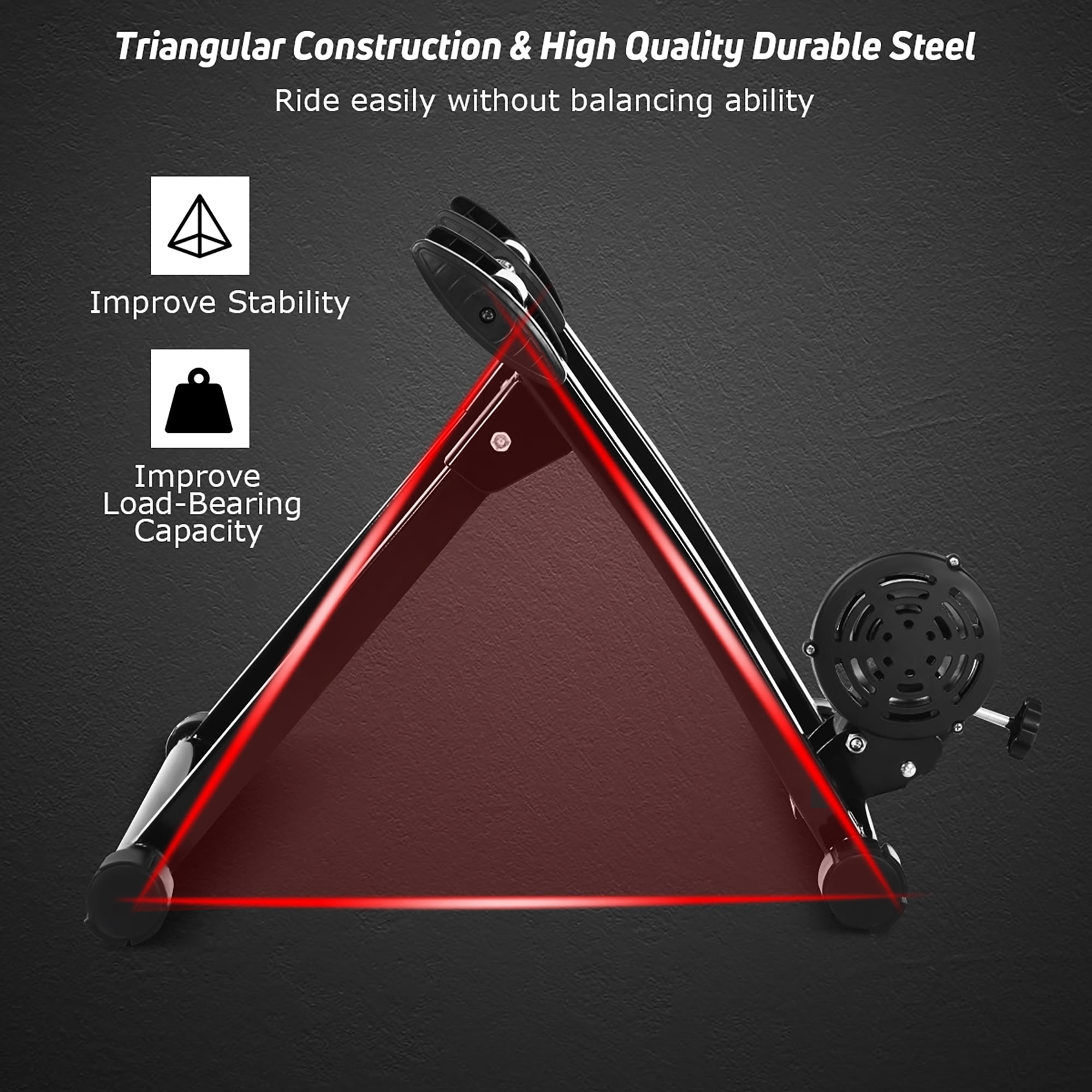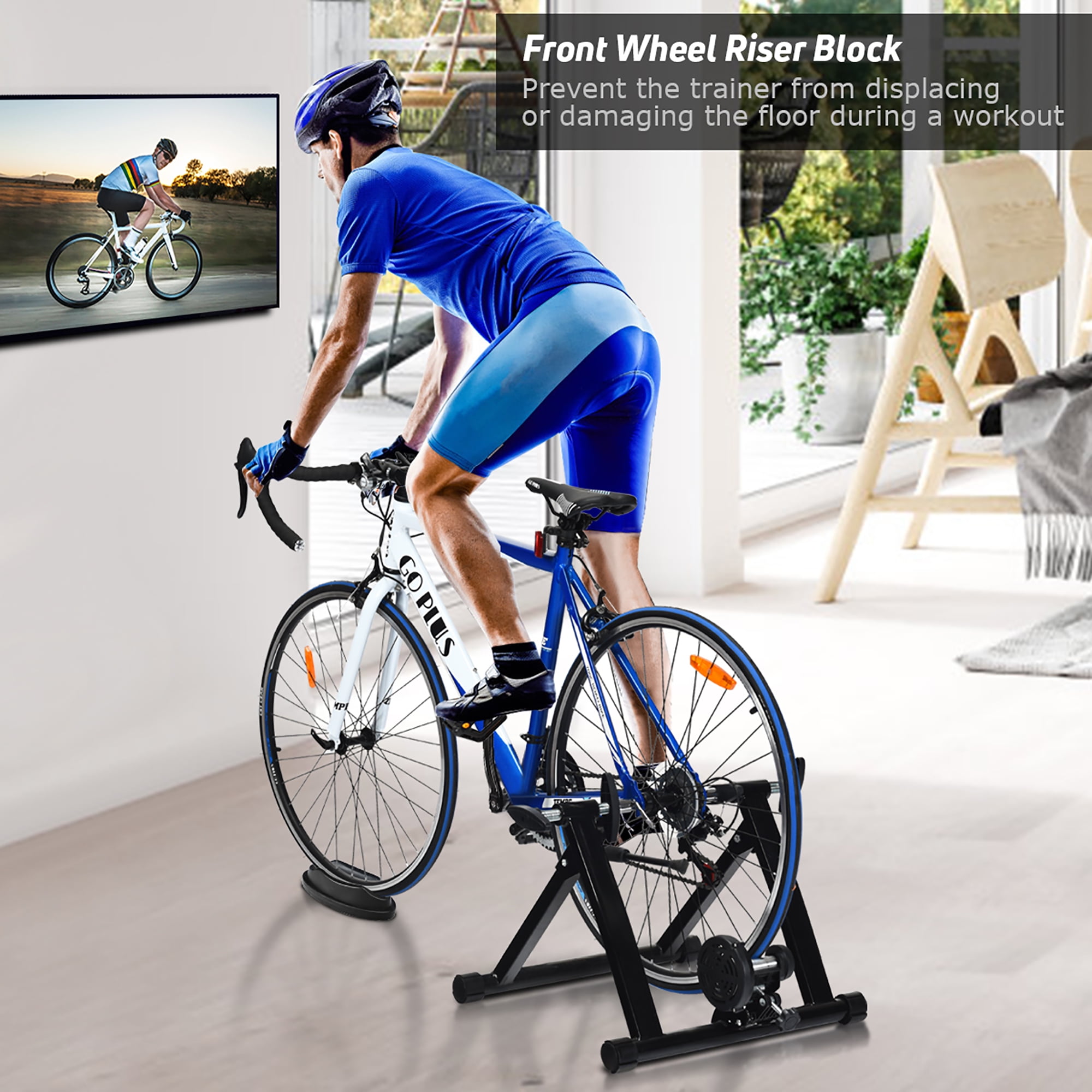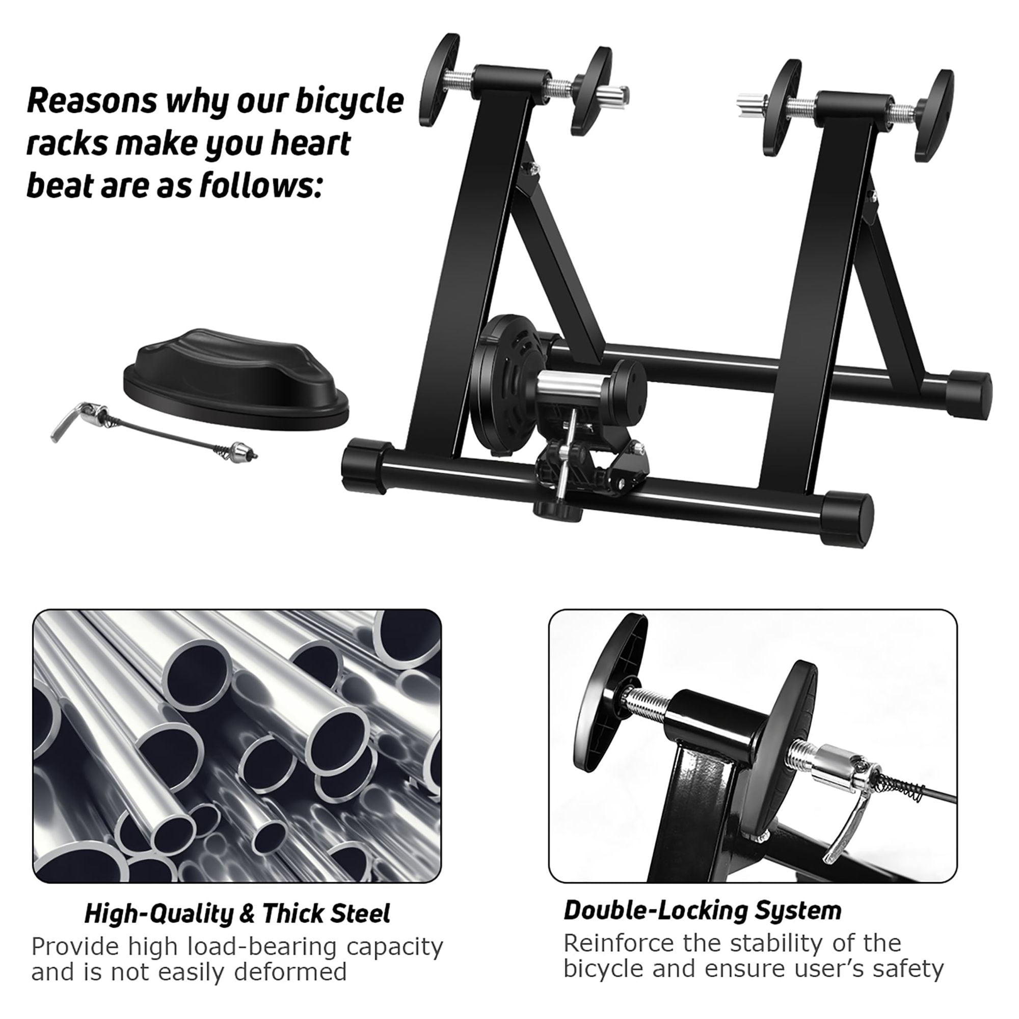 Quick Release & Double Locking System: The built-in double locking system can firmly fix the bicycle on the rack to ensure the safety of the exerciser during the exercise and reduce potential hidden dangers.In addition, you can easily remove the quick release lever and install the bicycle by turning the knob. Smooth & Low Noise Operation: Compared with the magnetic trainer, fluid trainers are clearly quieter. Besides, you can easily adjust the optimal distance between the flywheel and the wheels so that the wheels can run more smoothly. Therefore, whether you are exercising in an apartment, shared room or shared space, you will not disturb your family or neighbors. Portable Folding Bike Exercise Stand: In order to facilitate users to carry and store our bicycle training rack, we designed it into a folding style. No need to use other tools, you can directly complete the installation and disassembly process by putting up or unfolding the stand. And it can be placed into any narrow place in your room or car. Strong Structure & High Load-bearing Capacity: The unfolded bicycle training stand forms a pyramid structure, which greatly improves the stability of the entire frame. Its strong material and stable structure enable it to withstand a weight of 220 pounds.In addition, any bicycle with a wheel diameter of 26 ”to 28” can be fitted to our stand. Premium & Durable Material: High-quality steel provides high durability and long service life. And the non-slip foot pads are made of nylon material, which can increase the friction and protect the floor from scratches. Besides, you can rotate the mat to adjust the balance of the bike exercise stand. Feature High-quality steel provides high durability and long service life Pyramid structure makes the stand firmly on the ground Nylon material increases friction without damaging the floor A good load-bearing for maximum load capacity 220 lbs Lightweight design and compact size make it easy to carry and store Suitable for 26, 27, and 28 inch tires and a variety of bike types Front wheel pad keeps bicycle stable and ensure user’s safety Double locking system can firmly fix the bicycle on the rack to ensure the safety Detailed instructions help you complete the installation easily Noise reduction function provides a quiet environment for you and your neighbors Specification Color: Black Material: Steel + Nylon Product Size: 23.5” x 21” x 15.5” (L x W x H) Folding Size: 21” x 18.5” x 8.5” (L x W x H) Net Weight: 15 lbs Weight Capacity: 220 lbs Suitable Bike WheelSize: 26” – 28” Package includes: 1 x Bike Trainer Stand 1 x Front Wheel Riser Block 1 x Rear Quick Release Lever 1 x Instruction