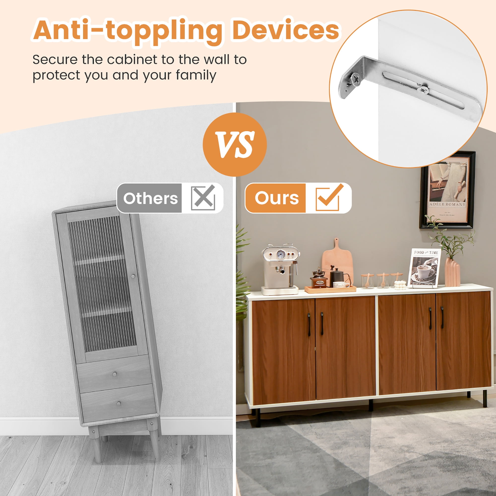 No suitable sideboard in your home? Our sideboard will be a good choice for you. Constructed with thickened board our sideboard enjoys wonderful stability and durability. At the same time, our sideboard is equipped with anti-tilting devices and 5 metal legs, making ours sturdier than others seen in the market. The cabinet top has an excellent load-bearing capacity of 155 lbs. There are 2 cabinets with 4 compartments well meeting your storage needs. In addition to being a buffet cabinet in your kitchen, you can also use it as a console table and storage cabinet in your living room. Wherever it is, you will always receive satisfactory service. Feature Thickened board to ensure high stability and durability Spacious cabinet-top and 4-door large cabinet to meet the storage need in daily life 4 Storage compartments inside the cabinet to help keep kitchen supplies in order Anti-toppling devices for higher sturdiness and safety Perfect as buffet cabinet in kitchen, console table in living room, etc Water-proof and scratch-proof surface for convenient cleaning and maintain 5-leg structure for added stability Specification Color: White+Walnut Material: Engineered Wood, MDF, Metal Product Dimension: 58” x 16” x 30” (L x W x H) Dimension of Bottom Shelf: 28” x 14.5” x 11.5” (L x W x H) Clearance from Ground: 4.8” Net Weight: 90 lbs Load-Bearing Capacity of the Tabletop: 155 lbs Load-Bearing Capacity of Each Storage Shelf: 45 lbs Package Includes: 1 x Sideboard Cabinet 1 x Instruction
