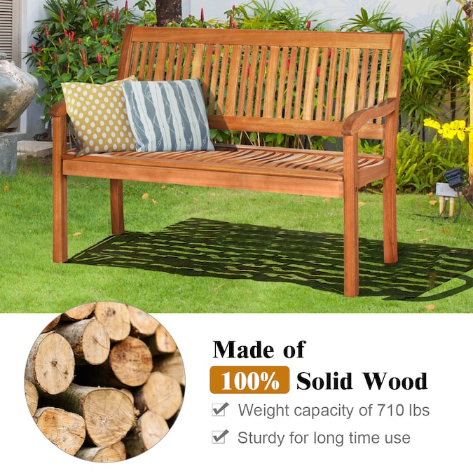 Are you finding a wooden bench for your outdoor space? Our bench with large weight capacity is a great choice for you. Made of premium eucalyptus, the frame of bench is sturdy and durable for long time use. And the spacious space is large which can accommodate 2-3 people. It is easy to have a small place to chat with your friends. Designed with slightly sloping backrest and wide armrest, the bench is comfortable to sit and relax. The simple appearance and natural color make this bench to be a good decor in your outdoor or indoor space. It is ideal to be placed in your outdoor or indoor space like patio, garden, balcony and living room. Premium eucalyptus to form a sturdy and durable frame. Waterproof and scratch-resistant surface with varnish. Spacious seat for 2-3 people sitting comfortably. Slightly sloping backrest and curved armrest for comfortable resting. Wide armrest in suitable height to rest your arm and hand. Natural teak color brings a sleek and exotic look to your space. A handsome addition for both indoor and outdoor spaces. Easy assembly required according to instruction. Material: eucalyptus. Dimension: 50x 25x 36inch(L x W x H) . The height of seat: 17.5inch. Weight capacity: 710 lbs. net weight: 37.5 lbs. Package include: 1 x wood bench.1 x instruction.