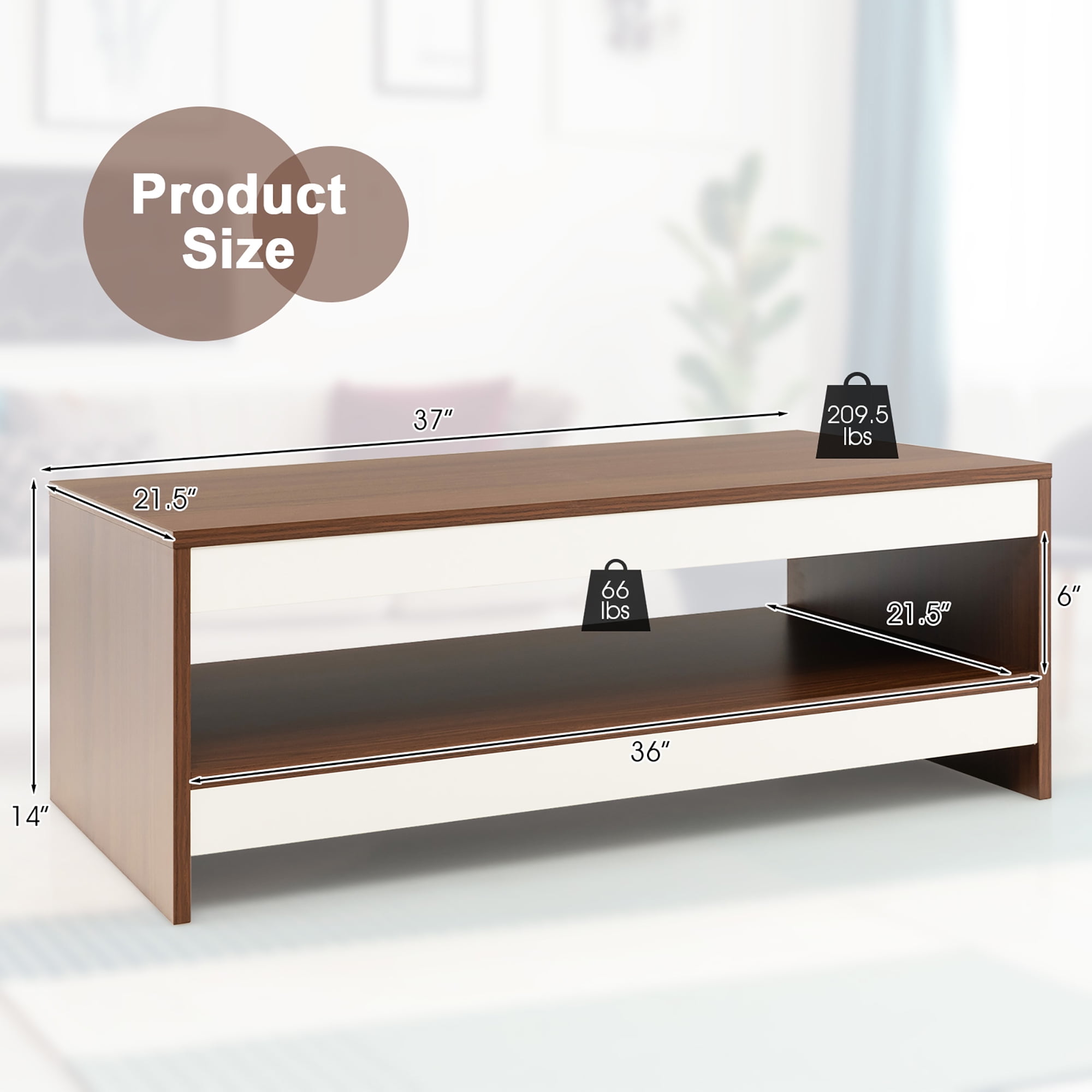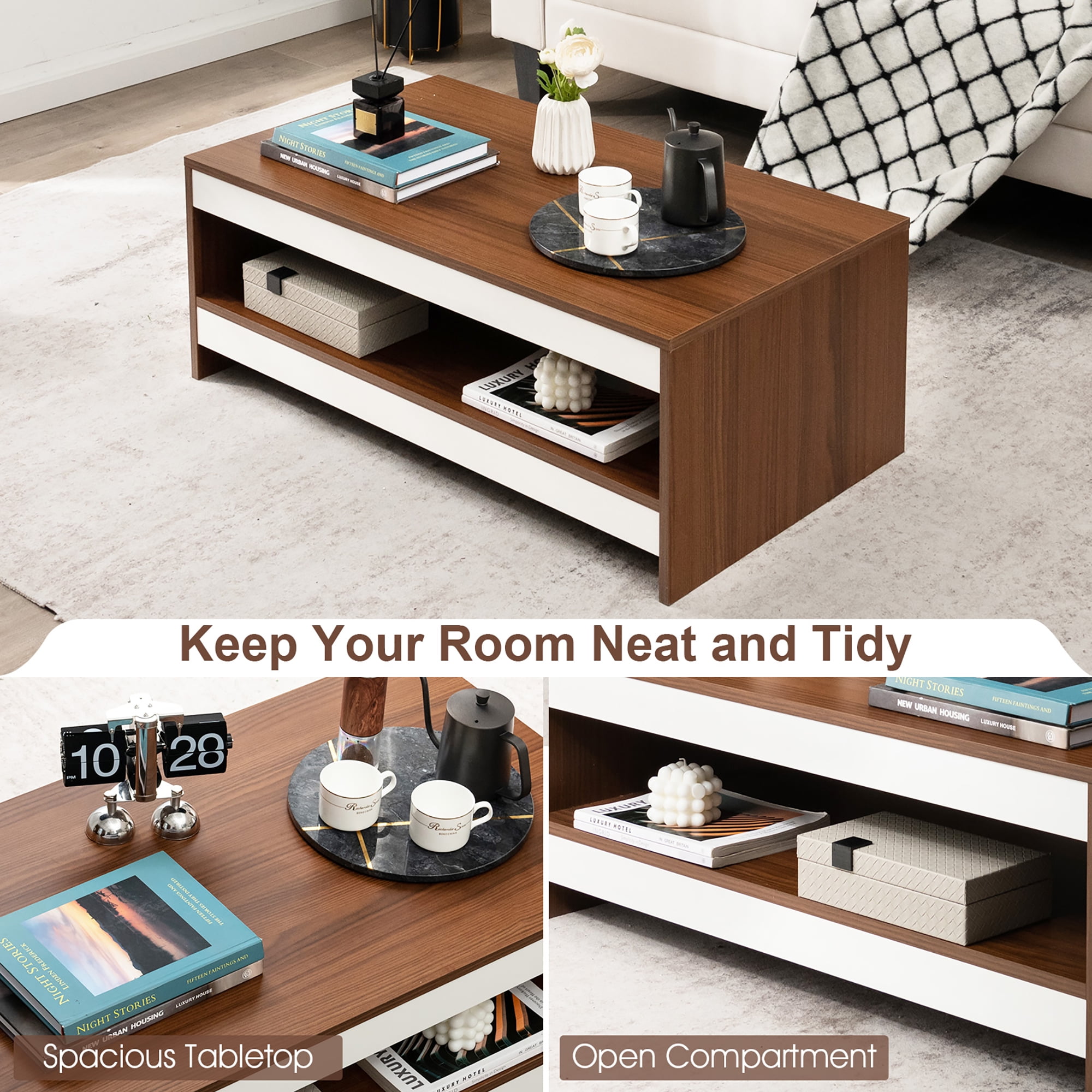 Ample Storage & Display Space: This 2-tier coffee table features a spacious tabletop and an ultra-wide open shelf, which can fully satisfy your storage needs to keep your room neat and tidy. Besides, the open design is ideal for displaying your favorite collections, photo frames, vases, tea set and so on. Sturdy Construction: The coffee table is crafted of well-selected engineered wood with firm connection, which is able to provide long-lasting stable performance and service life. Meanwhile, it also accounts for outstanding load-bearing capacity. The tabletop and the open shelf can hold up to 210lbs and 66 lbs respectively. Modern Appearance: The surface of the cocktail table is finished with exquisite wood grain, giving the table a rustic natural charm. White and walnut color-blocking design greatly improves chic sense, making the coffee table a modern and stylish addition to your living space. Suitable for Various Occasions: This rectangular coffee table is definitely a practical piece of furniture. When it’s used in the living room, you can place remote controls, snacks and cups on the tabletop for easy access. Additionally, its generous appearance also blends well with the style of reception rooms and offices. Easy to Assemble & Clean: Detailed user manual and complete accessories are provided for easy assembly. By following the instruction step by step, you can put the coffee table together in a very short time. Besides, the smooth and waterproof surface only requires low maintenance.