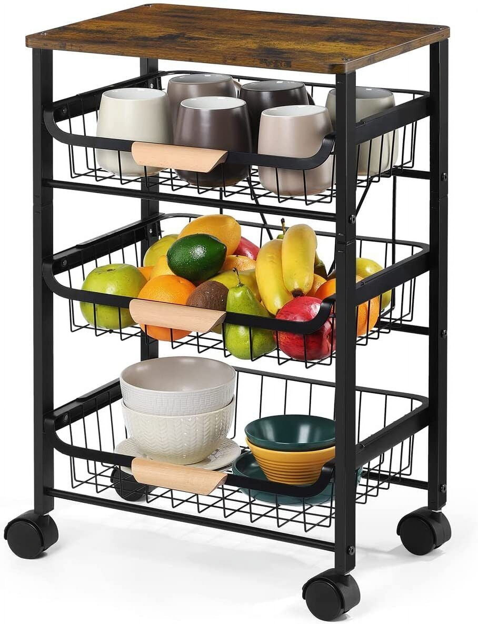 Take your kitchen organization to the next level with our exceptional kitchen cart. The kitchen cart is equipped with an assortment of convenient features to make your kitchen organized. With aneasy pull-out drawer, a storage basket, a serving tray, and a bottom slatted shelf, you will never run out of space to store your tissues, tableware, snacks and fruits. And the versatile design allows it to be used as a storage cart to hold ornaments and books. Unlike easy to crack and not waterproof wood countertop, ours is made of stainless steel, providing you with a sturdy and effortless to clean workspace. Unlike others with fragile construction, ours features solid pine wood legs, ensuring remarkable stability. Additionally, the rolling kitchen cart comes with 4 universal wheels, allowing for effortless movement. For added stability, 2 of the wheels are lockable, providing you with a secure storage solution. Feature Wide top, drawer, wire mesh basket, serving tray and shelf offer ample storage space Serve as not only a kitchen trolley, but also a storage cart Detachable tray for easy transportation of cutlery and plates Slide-out storage basket for easy access to your belongings Stainless steel countertop is rustproof and easy to clean Pine wood legs are stable and crack-resistant Effortlessly move to any room with 4 universal wheels 2 wheels are lockable for stable parking Equipped with slatted shelf for drainage and extended life sturdy metal handle provides easy grip for smooth opening Specification Color: Black Material: Stainless Steel, Solid Wood, MDF, Metal Product Dimension: 18.5” x 15.5” x 33.5” (L x W x H) Size of Inner Drawer: 14” x 10” x 2.5” (L x W x H) Size of Basket: 14.5” x 12” x 2.5” (L x W x H) Size of Serving Tray: 17” x 11” x 2” (L x W x H) Size of Bottom Shelf: 16.5” x 13.5” (L x W) Width of Frame: 14.5” Ground Clearance: 2.5” Net Weight: 15.5 lbs Package Includes: 1 x Kitchen Island Serving Cart 1 x Instruction