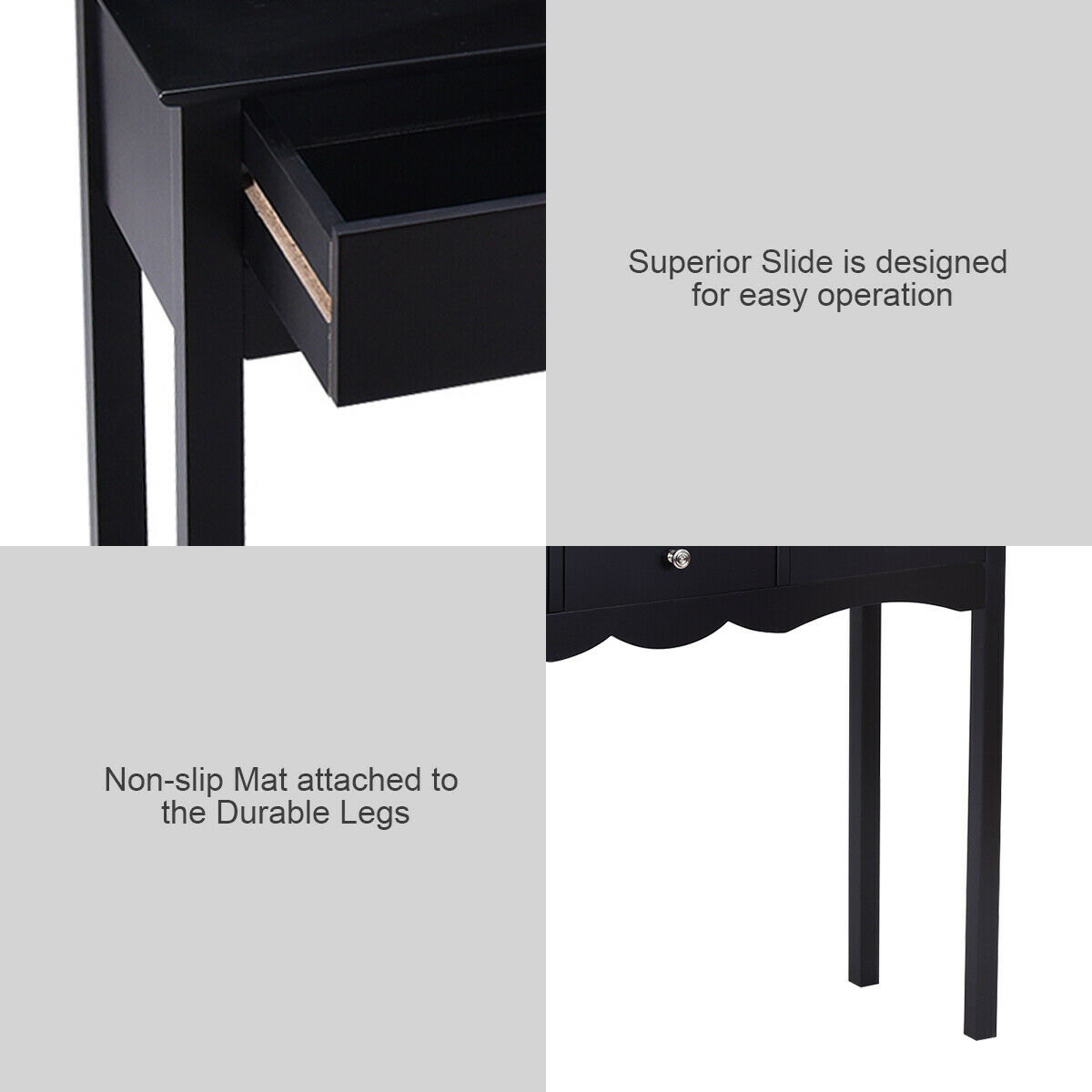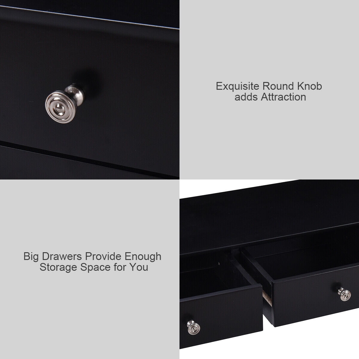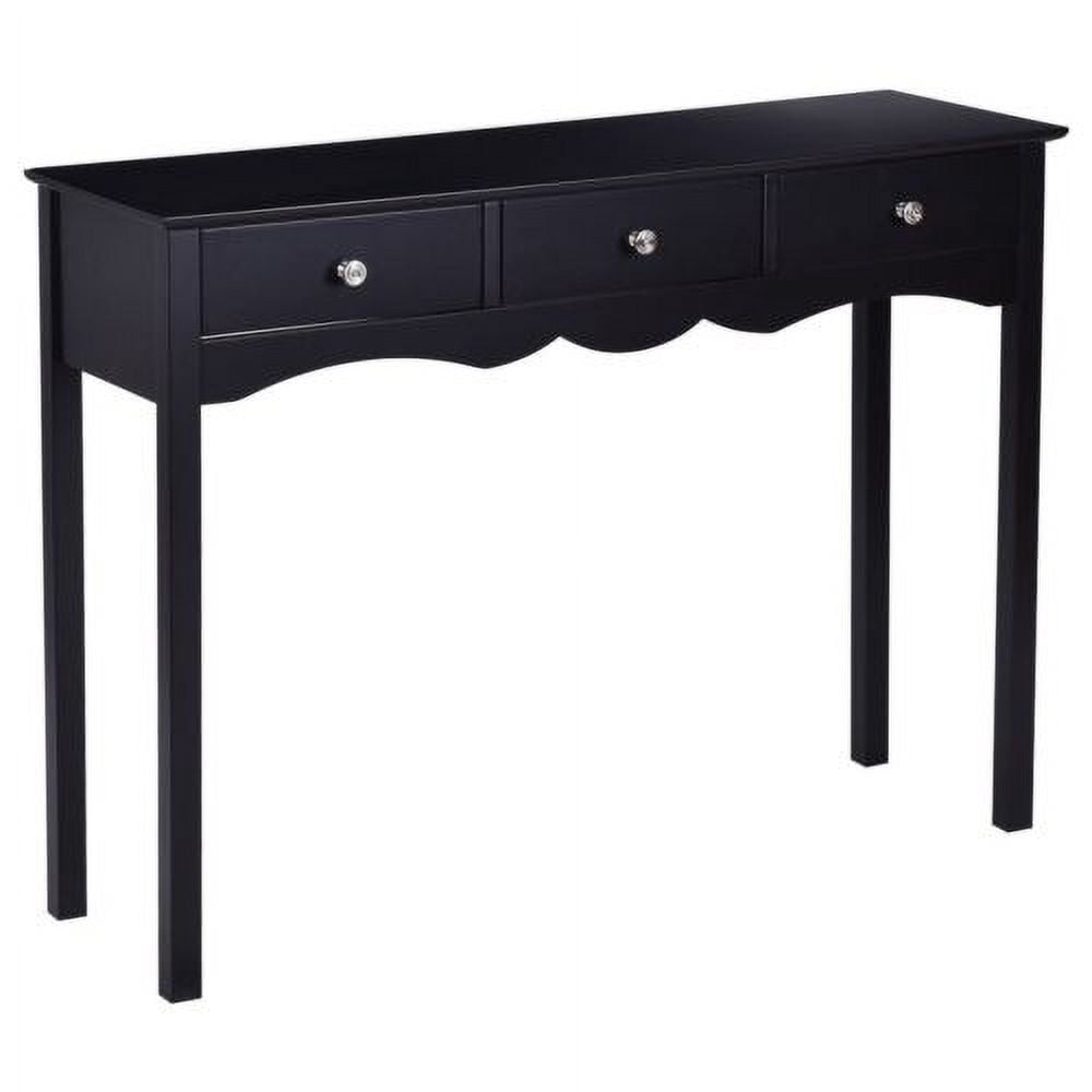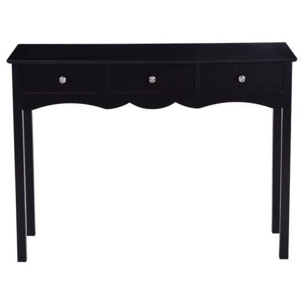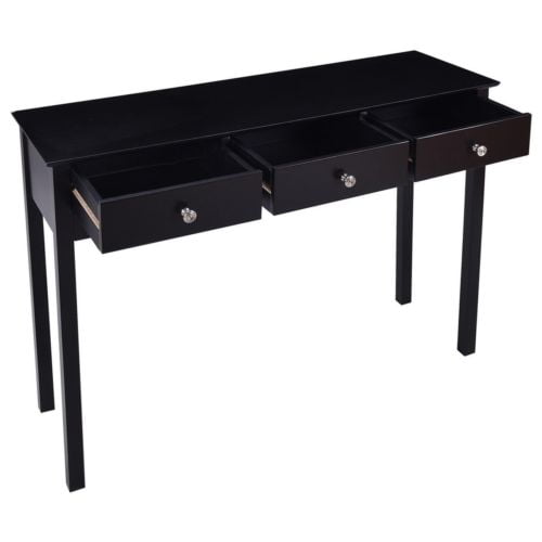 This is our attractive and practical console table, which is a perfect for your living room, hallway and entryway. Constructed of high quality, non-toxic MDF material, this table is sturdy and reliable. Three slide-out drawers provide convenient space for placing small items. The classic black finish on the contemporary furniture will surely coordinate well with any room decor. Feature Modern and elegant style Constructed of high quality, non-toxic MDF material with a high gloss on the surface The classic black finish can coordinate well with virtually any room decor Three slide-out drawers for additional storage Vintage style metal handles Practical console table for hallway, living room and entryway Easy to clean Assembly required Specification Color:Black Material:MDF board Overall Dimensions: 39.5”×12.5” ×29.5” (L×W×H) Net Weight:27Lbs Package Include:1 X Console Table