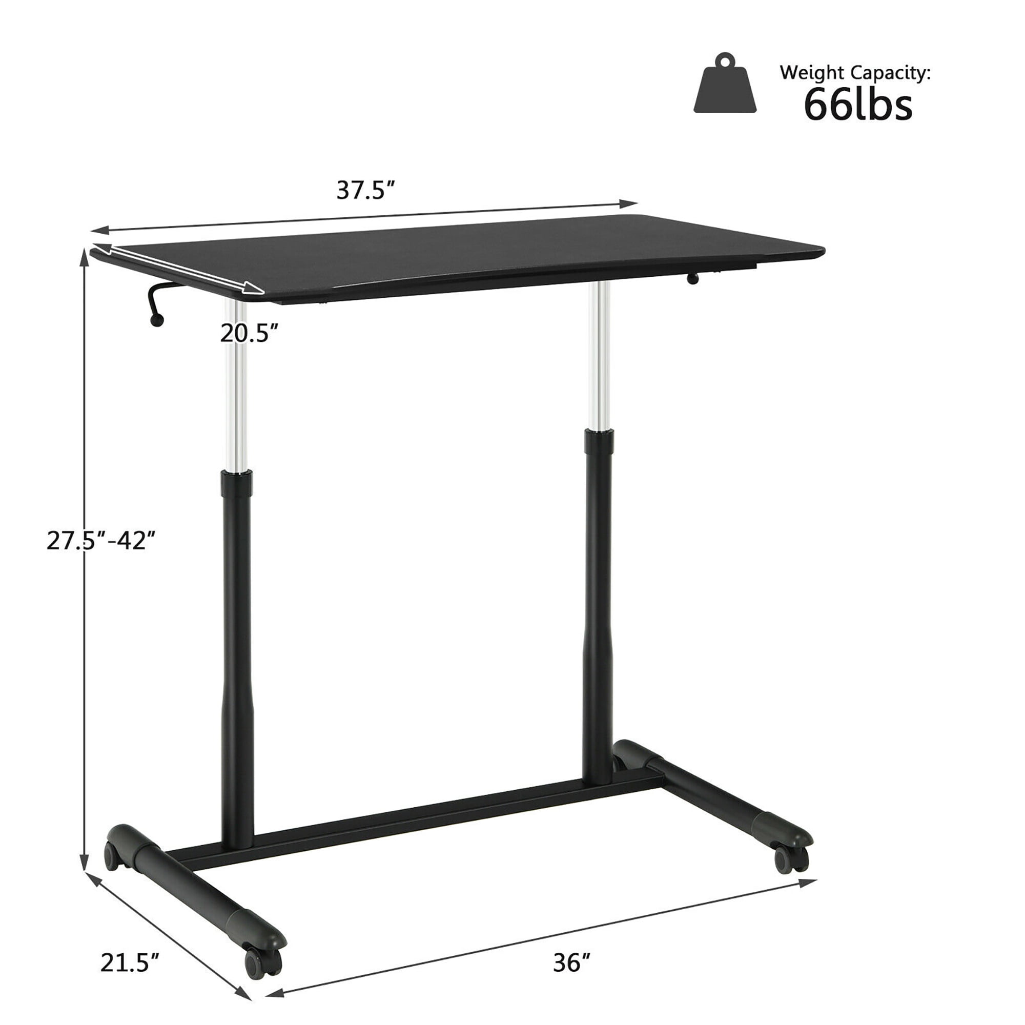 Ergonomic Adjustable Design: Equipped with dual high quality gas rods, the computer desk can be adjusted within the range from 27.5″ to 42″. Thus, you can lift it up and down to fulfill your sitting or standing requirement. No wonder, such ergonomic design extremely relieves your fatigue throughout a long workday. Smooth Rolling Casters for Convenient Mobility: There are 4 universal casters on the feet, intended to help you move the laptop desk from room to room effortlessly. And 2 of caters are lockable, so that you can keep it in position. More, wear-resistant caters can roll on different surface silently, while causing no damage to your floor. Combine Stability with Durability: Made of superior steel material, the sit stand desk features exceptional rigidity, no distortion at all. Meanwhile, the standing desk is composed of 2 supporting rods and I shaped base, which strikes perfect balance between flexibility and stability. It is sturdy enough for strong load capacity as well. Humanized Details for Higher Comfort: Characterized by a curved design on the front of the tabletop, the rolling laptop cart provides you with great comfort when you approach it. Besides, the smooth and round corners can effectively prevent the dangers of crash injury. Match Well with Different Decorations: The multifunctional height adjustable desk can be served as an overbed table in your bedroom, an end table near your sofa couch in living room and an office table in your study room. Whatever roles it plays in different occasions, it shall bring ultra unique experience to you. Features : Package includes: 1 adjustable desk, 1 user manual Materials: MDF, steel tube, PVC Color: Black Style: Contemporary Specifications : Product Dimensions : 37.5″L x 21.5″W x 27.5 – 42″H Product Weight : (Net weight) 34 lbs; (Maximum weight) 66 lbs