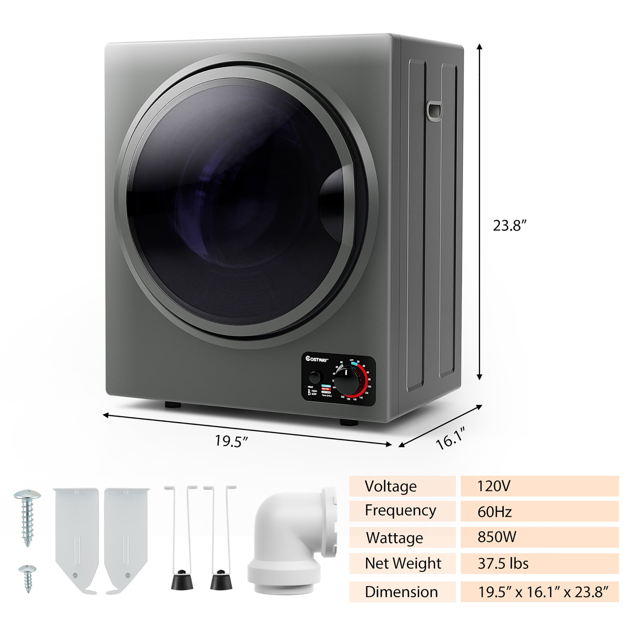 This is our brand new compact dryer with 10 lbs cloth capacity ,it will be your best helper to dry your cloth or sheet in a short time ,it has four mode : air dry, cool, warm, and hot. you can choose the drying time or mode according to the material and weight of the cloth. Our dryer combine the cooling , wrinkle ,freshening, function ,without taking up a lot of room will bring much convenience for your life , Don’t hesitate to buy one ! Feature Compact and practical 1.5 cu. ft. capacity allows you to dry up to 10 lbs of wet clothing Stainless steel tub provides durability See- through window lets you monitor clothes as they dry Four mode : air dry, cool, warm, and hot Anti-Wrinkle function helps reduce wrinkling Air dry(0-80mins) run with cool air to freshening Cool(0-20mins): cool down the temperature Warm(30-120mins) : dry and cool cloth ,Anti-wrinkle Hot (120-200 min): for drying large quantities or bulky item Minimal noise design The filter inside is easy to access for cleaning Wall mounted ,Place on firm horizontal ground or rack mounted (the bracket is not include) Specification Color: grey Material: Stainless Steel Tumble Net weight: 37.3lbs Overall dimension: 19.5” x 16.5” x 24.0”(Lx W x H) Power: 120V, 60Hz Weight :37.5lbs Capacity: 1.5 cu.ft/ 10 lbs (wet clothing) Rated input: 850W Noise: <44dB Dryer Power Source: Electric Package includes: 1 x cloth dryer 2x hanging bracket 2xPlastic spacers 1x Exhaust connector 4x 12mm long screws 4x 25mm long screws 1x instruction