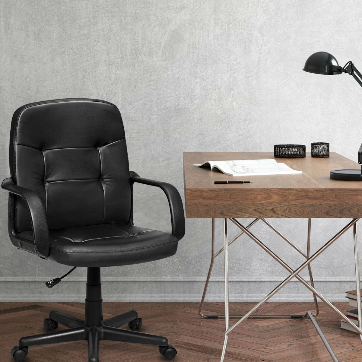 This is our brand new mid-back executive office chair which features sophisticated profile and exquisite workmanship to offer a modern and professional look for your home or office. The adjustable task chair helps promote a comfortable seated position by adjusting the seat height between 16”-19.5”, while it offers a versatile range of motion with 360 degree seat and durable casters for multi-tasking convenience. While maintaining ergonomic design, the cushion and backrest of the high-density sponge further enhance seat comfort. Refresh your office space with this office chair, a versatile choice for computer desks and workstations. Don’t hesitate to buy it! Feature Brand new and high quality Modern and low-key look, a great complement of home, office, sturdy, etc. Stable and durable structure, large weight capacity, serve for many years Adjustable seat height, meet different needs for matching up height of desk 360 degree swivel seat for multi-tasking convenience Sturdy nylon wheels, easy to move, add freedom of flexible movement PVC leather surface, waterproof and wear-resistant, easy to clean Padded seat and back for all-day support, not easy to deform Ergonomic mid-back & armrest, increases comfort Simple installation and fast assembly Specification Color: Black Main material: PVC + Sponge + Nylon + PP Overall dimension: 24”x23.5”x36.5”-40”(WxDxH) Back size: 19”x21”(WxH) Seat size: 19”x18.5”(WxD) Seat height: 16”-19.5” Net weight: 24.5 lbs Weight capacity: 264 lbs Package includes: 1x office chair 1xinstruction