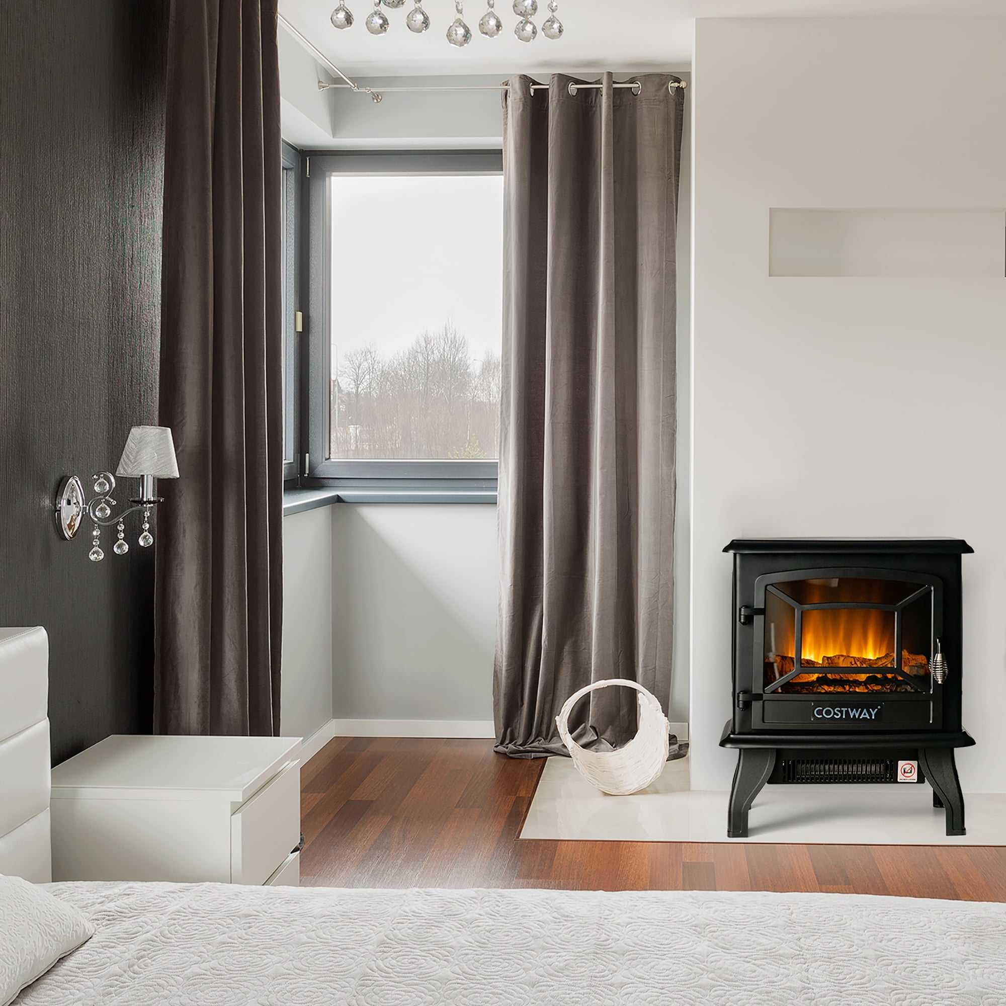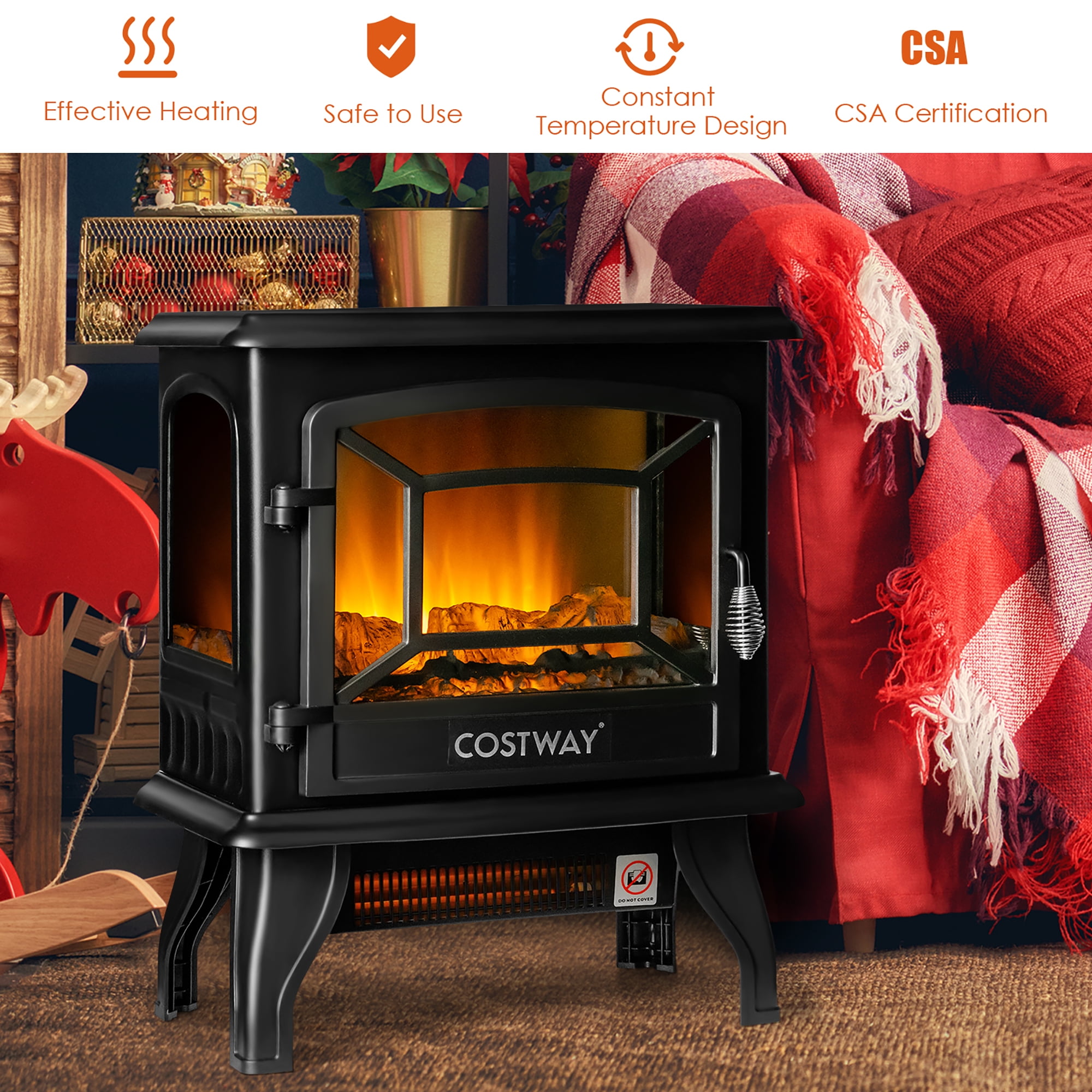 Costway Fireplace Heater Stove Thermostat & Flame Effect Enjoy Warmth Anywhere: This 1400W electric fireplace heater delivers 4777 BTU, quickly driving away the cold to provide cozy and even warmth. The adjustable thermostat ranges from 68℉ to 95℉ to meet your heating needs, and its portable design allows for use in any room Realistic Flame Effect: Features a realistic dancing flame effect and lifelike logs, this electric fireplace stove with a panoramic 3-sided view design offers visual comfort and warmth from multiple angles, reminiscent of traditional fireplaces Designed for Safety: Equipped with overheat protection, this electric stove heater automatically shuts off if the inner components overheat. It is CSA certified, and the UL-approved plug adds extra security, while the surface remains cool to the touch Easy Operation: The indoor freestanding stove heater is user-friendly with a temperature control knob, temperature control switch, and main power switch. The realistic flame effect can operate independently, making it suitable for all seasons Energy-saving & Quiet Design: The constant temperature design helps save on electric bills, while the noiseless operation is ideal for working and sleeping. Assembly is simple, requiring only the attachment of 4 legs with included screws