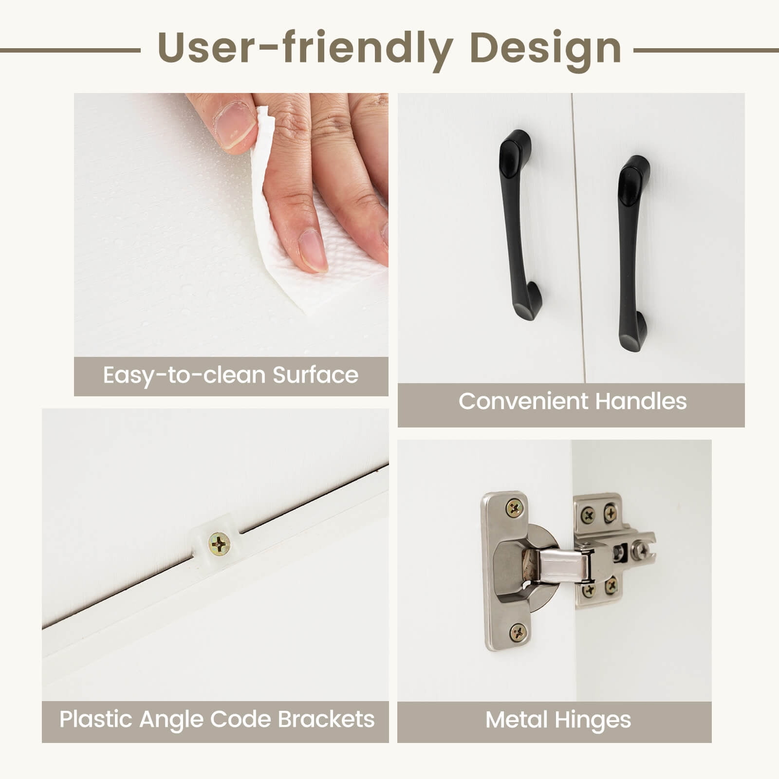 A good cabinet is always your best helper for storage. The storage cabinet has plenty of storage space to make full use of your room and keep it tidy and neat. Open design allows for easy access while smart division helps to classify your stuff. The simple yet stylish design suits perfectly for various decoration styles, and adds more elegance as well. High quality chipboard frame with wood legs offer you long term use. Moreover, smooth surface makes cleaning much easier, and the assembly will be completed within minutes with clear instruction. It’s a perfect combination of practicality and aesthetics, which is also ideal for living room, study, office and etc. Feature Open and enclosed storage design meet display and storage needs Smart storage and clear division keep your room tidy The smooth surface is waterproof and easy to clean Simple but stylish design suits for varied decoration styles Wood knobs and premium hinge for easy open and close cabinet Solid structure provides large weight capacity Wood splay feet with soft non-slip pads is stable Safe anti-tipping device is included Specification Color: White Material: Chipboard, Wood Net weight: 42 lbs Dimensions: 31.5” X 9.5” X 47” (LxWxH) Small Shelf: 10” x 9” x 13.5” (LxWxH) Large Shelf: 20.5” x 9” x 11” (LxWxH) Weight capacity of top: 65 lbs Weight capacity of shelf: 35 lbs Package includes: 1X Storage Cabinet 1X Instruction