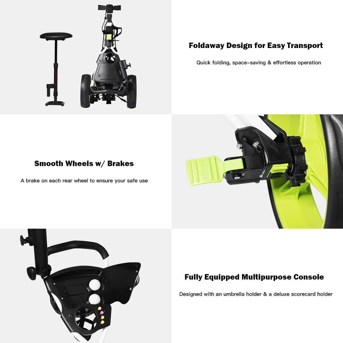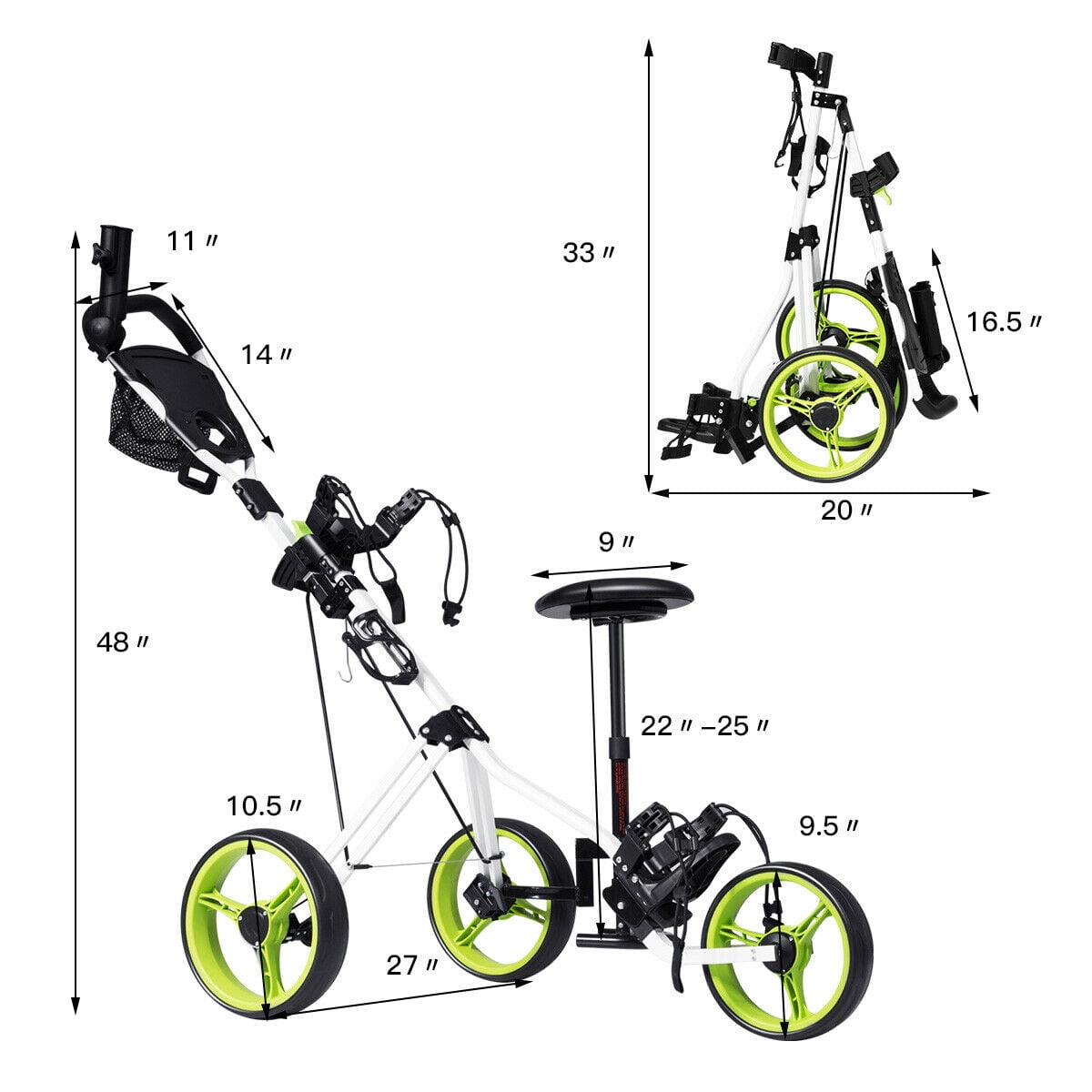 This is our new foldable 3 wheel golf trolley with a seat, which is perfect for golf exercising and resting. It allows you to transport golf to clubs or golf courses. Foldable design with 3 removable wheels enhances effortless mobility and storage. Welcome! High quality with competitive price can be realized here! Feature Strong steel frame in lightweight with smooth ball bearing wheels Two Functional foot operated brakes Easy Adjust Handle to Change Height and Angle of Handle Ergonomically shaped handle for both right and left handed golfers Foldable design with 3 removable wheels to save storage room A stool, net bag, Scoreboard and a umbrella holder included An adjustable Stool included which is perfect for golf exercising and resting Simple Assembly (Click The Wheels On) Is Required According To Included Instruction Specification Material:Steel Frame +PP with EVA cover Wheels Overall Dimension:65” x 27” x 48” (L x W x H) Front Wheel Size:9.5”;Rear Wheel Size:10.5” Tee hole:4;Golf ball hole:1 Weight:19 lbs Package Includes:1 x Golf Cart, 1 x Stool, 1 x Umbrella Holder��3 x Wheels��1 x Instruction