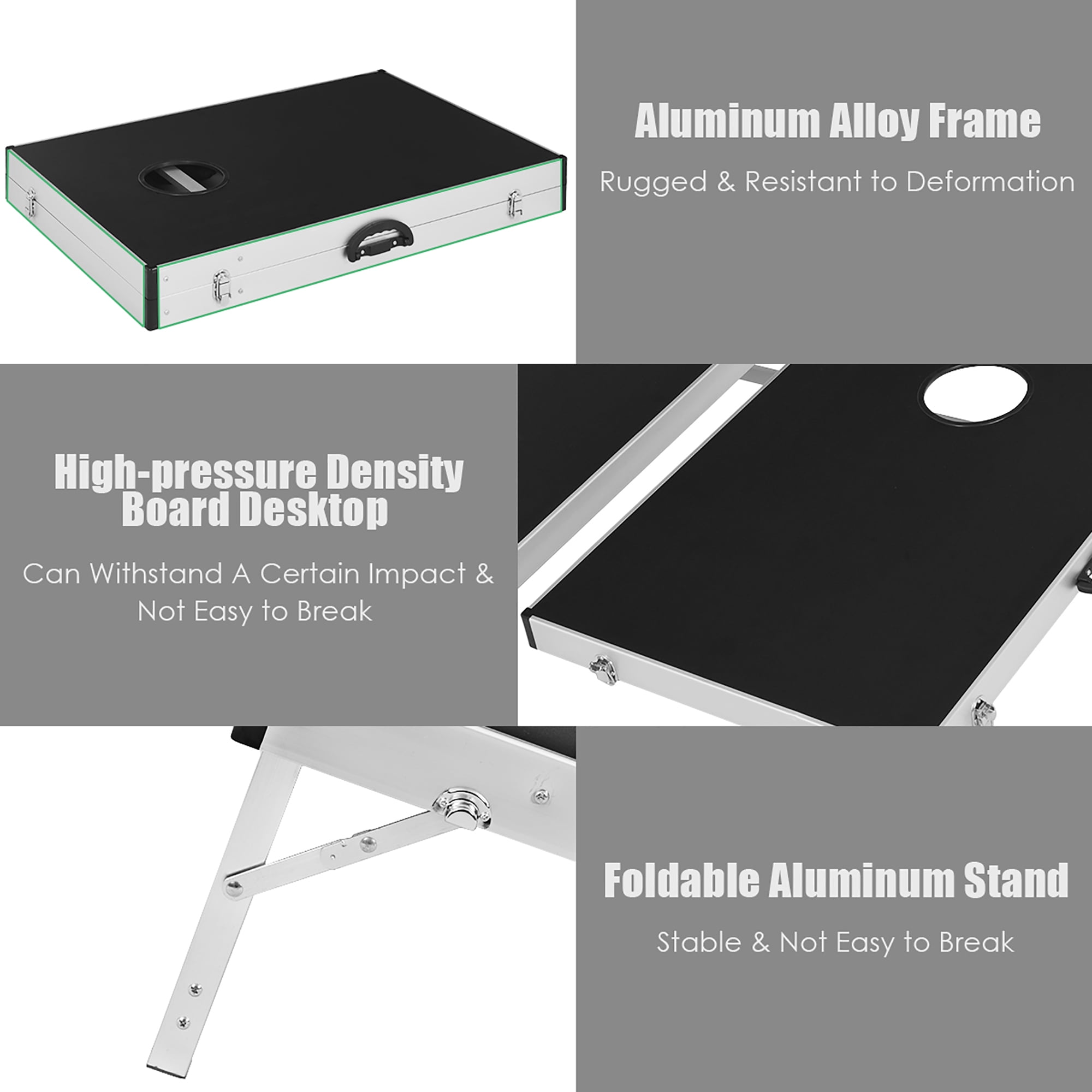 Our aluminum alloy game board is made of high-density board and it’s frame is wrapped with aluminum alloy makes it sturdy. And the scaffolding is also made of solid aluminium material that ensure the game board can be used for a long time. This product has a foldable design that you can fold into a suitcase when not in use. The foldable design makes you can easier to carry and store it. This cornhole game set is suitable for people of all ages and can be used indoors and outdoors. You can learn more about them by playing games with family and friends. Don’t wait any longer, come to buy one. Feature Made of high-density board makes this game board sturdy and sturdy Frame of game board is wrapped with aluminum alloy for long time use Triangular structure and non-slip pads make the stand very stable 2 separate play boards can be folded and locked in 1 for its special locker design Foldable design and handle make it easier to carry and won’t take up too much space The rules of this game is very simple can suitable for people of all ages to play Weather-resistant and waterproof game set can be used in the home or out of home suitable various situations Provide you physical and mental pleasure by play the games with family and friends Get extra 8 sandbags and 1 handbag for supporting products Easy to clean and maintain, saving your time and energy Specification Color: Black Material: Aluminum Alloy + MDF Net Weight: 18.5 lbs One Extended Board Size: 3’(L) x 2’(W) x 11’’(H) Folded Size of Two Boards: 3’(L) x 2’(W) x 4’’(H) Hole Diameter: 6’’ Package Includes: 2 x Cornhole Boards 8 x Bean Bags 1 x Carry Bag