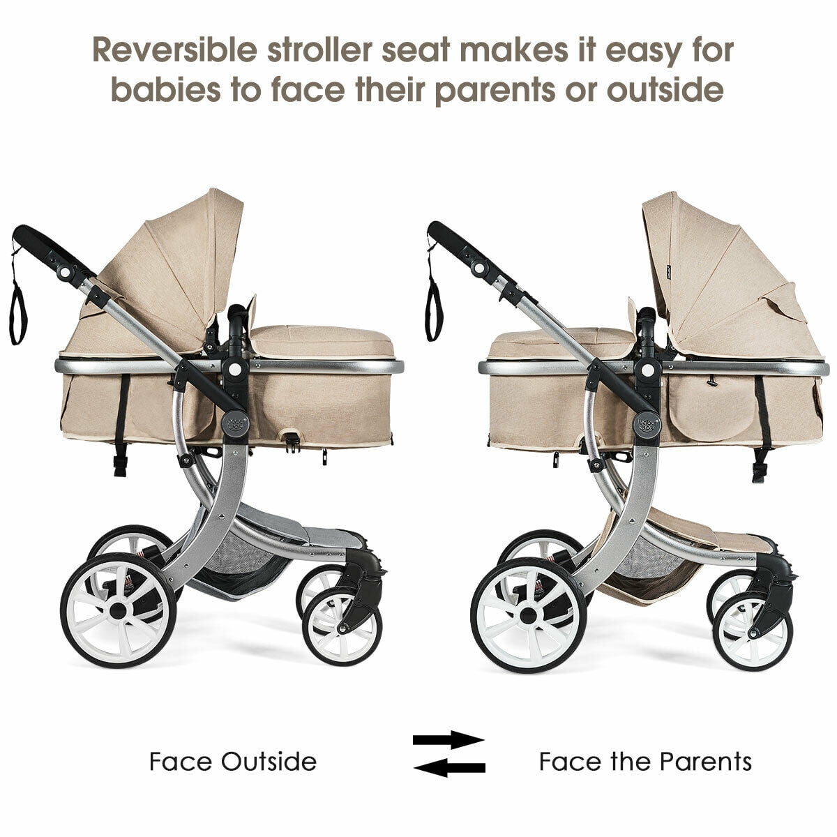 Costway Folding Aluminum Infant Bassinet Reversible Baby Stroller W/ Diaper Bag Beige