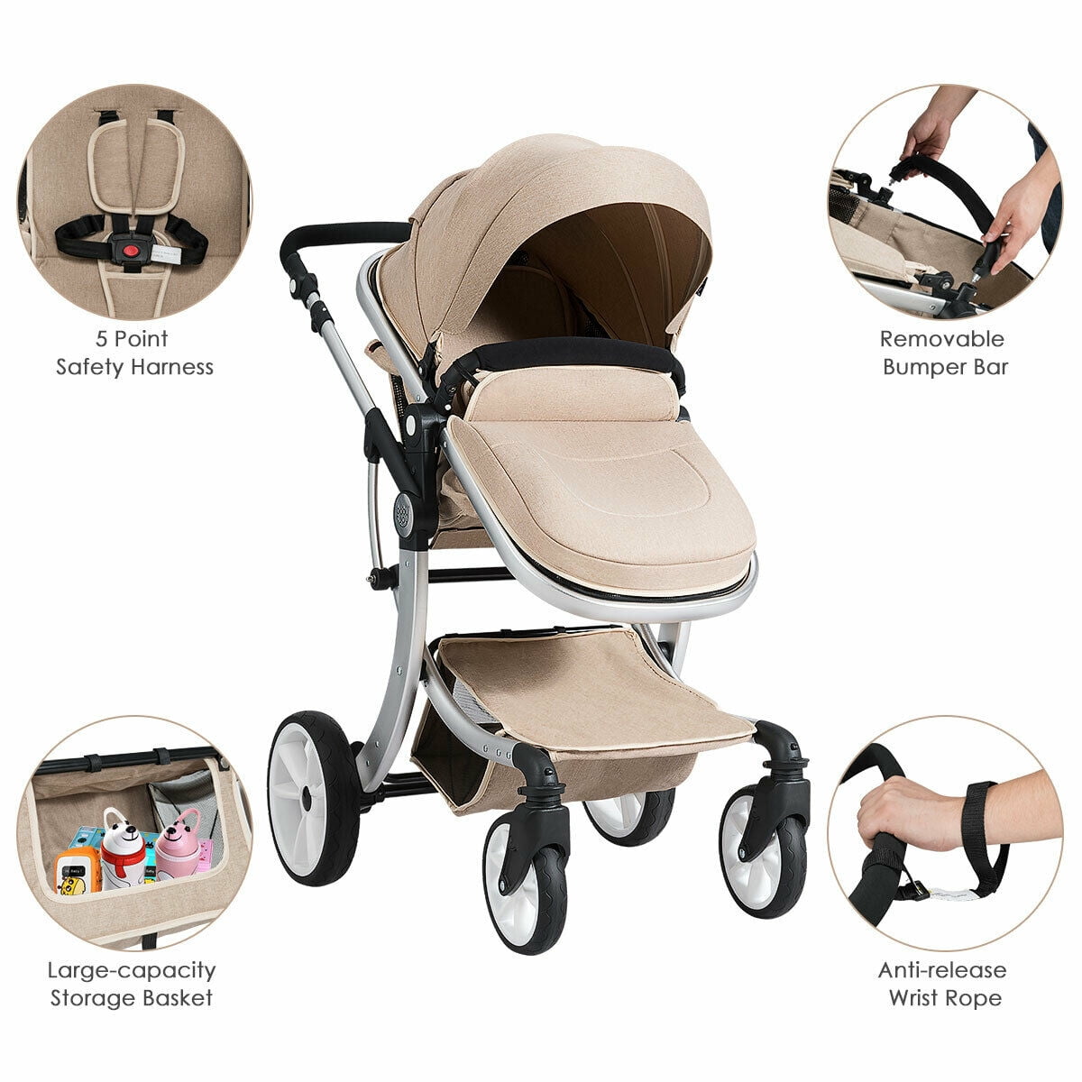 Our stroller is specially designed for your baby. The bassinet is large enough to hold 0-3 year old babies. With the comfortable mattress perfectly supporting your baby’s back, he or she will have a better and sweeter dream. You can convert it to three different types with an adjustable strap on the backrest for your baby to sit down or lie down. With the two-way conversion function, the baby can look outside the world or face the parents. The removable foot cover can withstand the cold wind and prevent your baby from catching cold. The net windows around the bassinet help you check your baby at any time you want. EVA universal front wheels together with the shock-proof rear wheels make the stroller suitable for various roads to avoid concussion of your baby’s brain. And the foldable design is easy to store and carry. Our baby stroller is your best choice! Feature Large basket and comfortable mattress to make your baby sit better Inclinable design meets the baby’s different needs to sit up straight or half lying down Seat can be converted to let your baby face you or enjoy outdoor scenes Five-point seat belt and detachable guardrail protect your baby at all times Foot cover can prevent from windy in the winter and can be removed in summer Adjustable awnings with small skylight effectively block rain and UV rays Ventilation nets around the bassinet facilitates air circulation X-shape anti-rust aluminum alloy improves whole stability Anti-release wrist rope is safer and more convenient to use Large-capacity storage basket and carry bag is used to store baby essentials EVA universal front wheels and shock-proof rear wheels suit many uneven roads Specification Material: Aluminum Alloy, 600D Imitation Linen Cloth, EVA, Rubber Color: Beige Net Weight: 27.5 lbs Weight Capacity: 33 lbs Overall Dimension: 40.5”x24.5”x44.5” (LxWxH) Folding Size: 30”x24.5”x12”(LxWxH) Basket Size: 33.5” X 14” (LxW) Front Wheel Size: 8” Rear Wheel Size: 12” Applicable Age: 0-3 Years Old