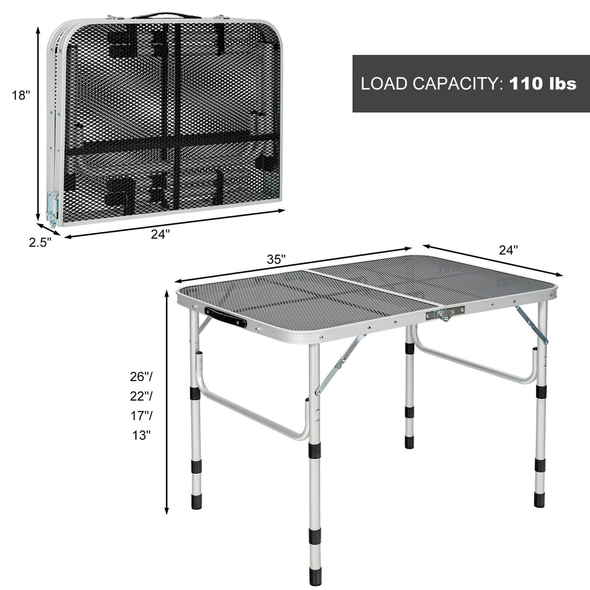 Our folding table is a perfect addition to outdoor camping life! Comes with an iron mesh tabletop, the picnic dinging table can ensure great support and dissipate heat well.And its aluminum frame with excellent sturdiness can load up to 110 lbs. What’s more, the anti-skid foot pads enhance using safety. So you can put all stuff on the table without worrying about accidentally tipping over. The camping table has 4 different heights for you to choose by adding or reducing the leg tubes. And this outdoor camping table is foldable for effortless carrying and space-saving storage. Compact briefcase size with side carrying handle allows you to take to anywhere possible. Specially designed for outdoor activities, the folding grill table facilitates the prepare for camping.