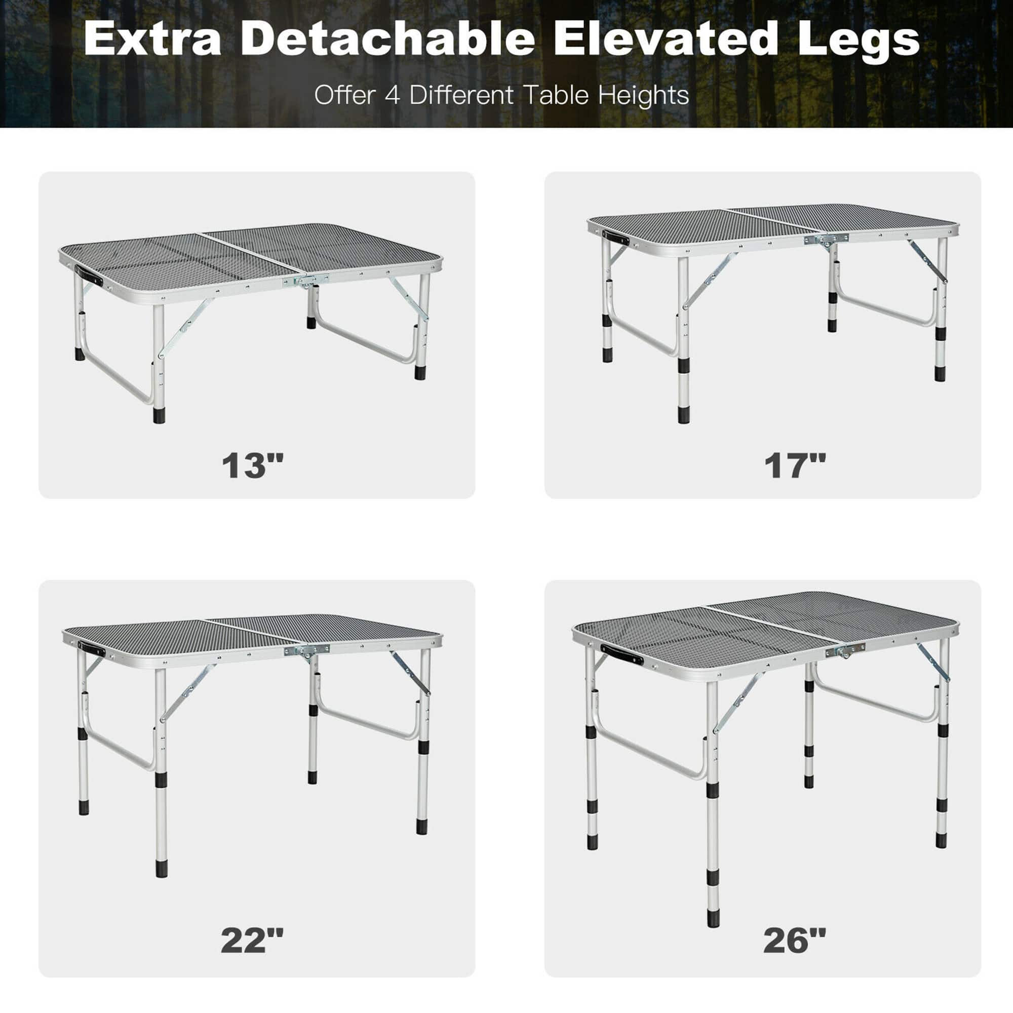 The camping table comes with 2 detachable leg tubes for you to decide the table height as needed. And the extra leg tubes can be used separately or conjunctively to achieve 4 different heights. Whether sitting or standing, you can set the most comfortable using height.