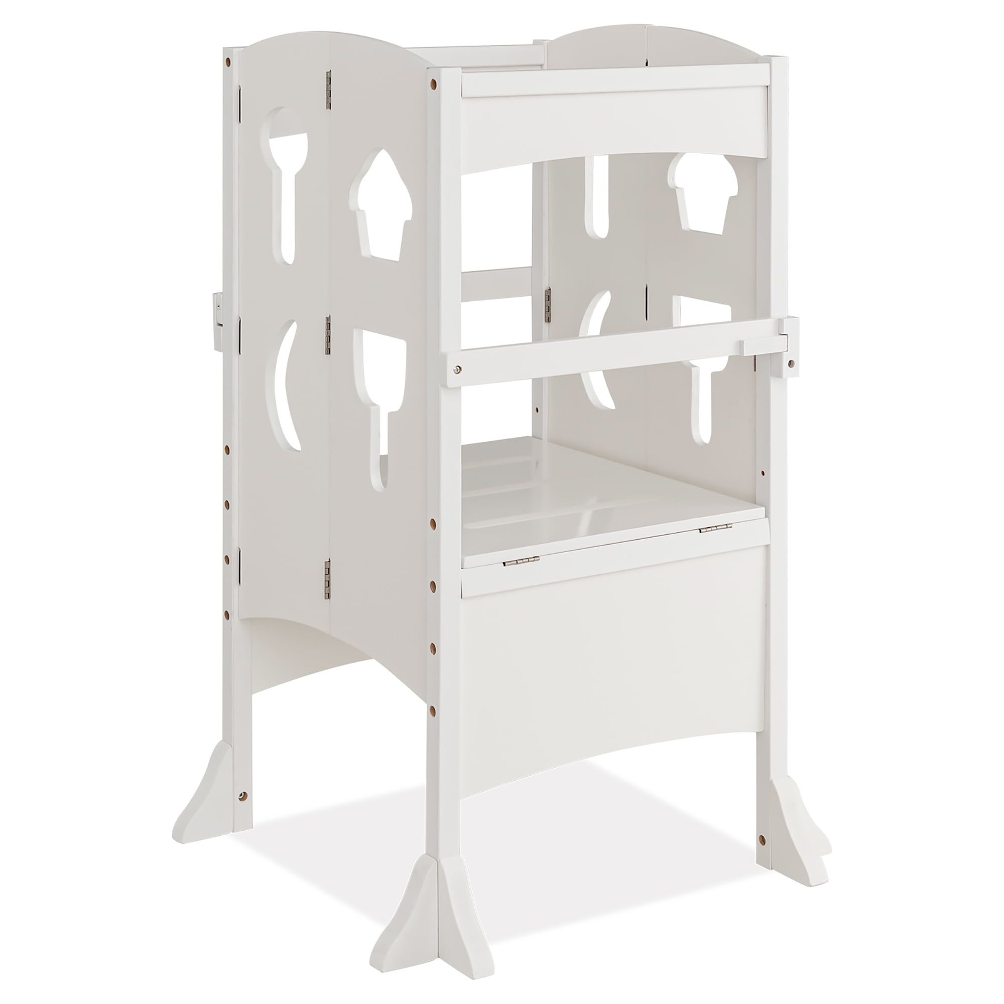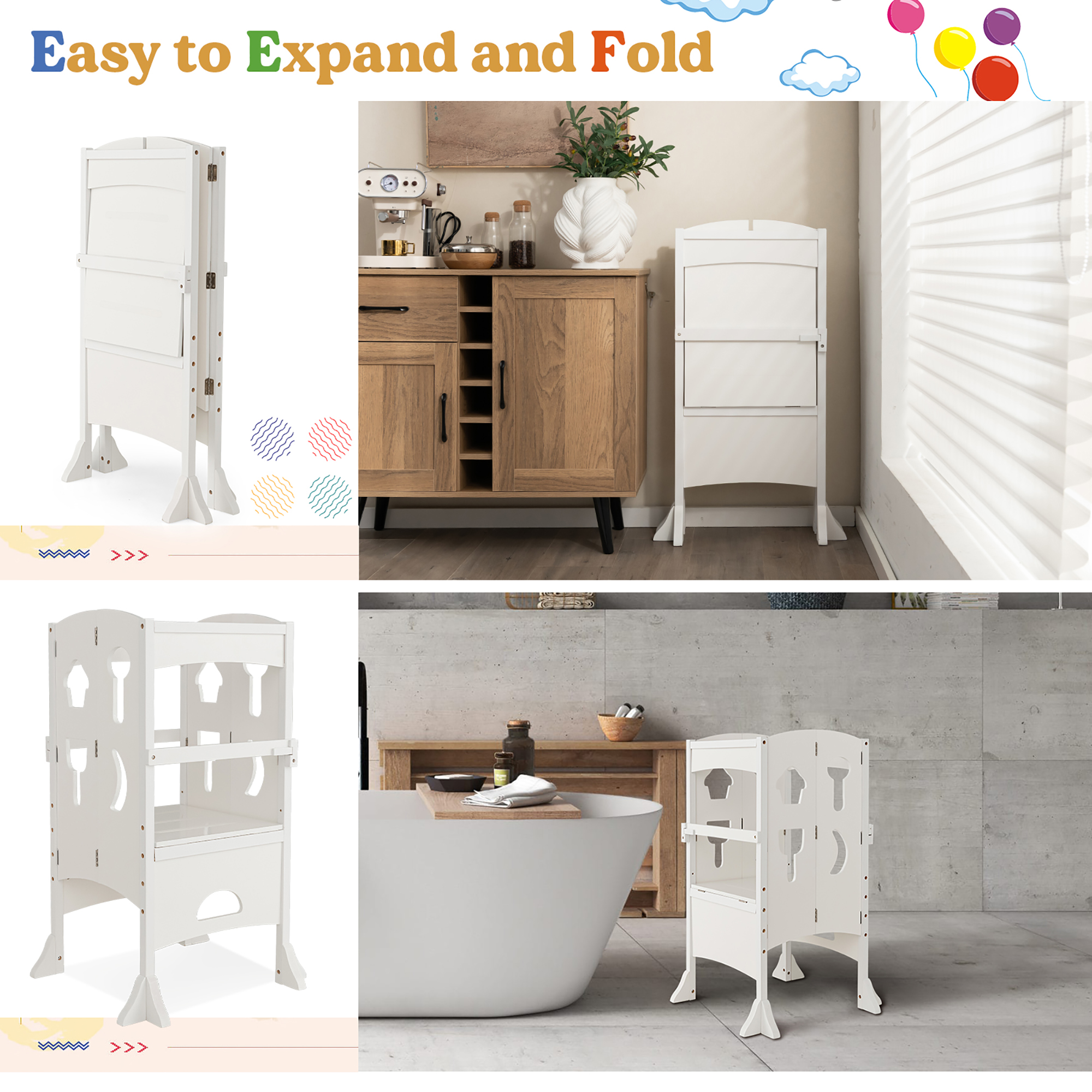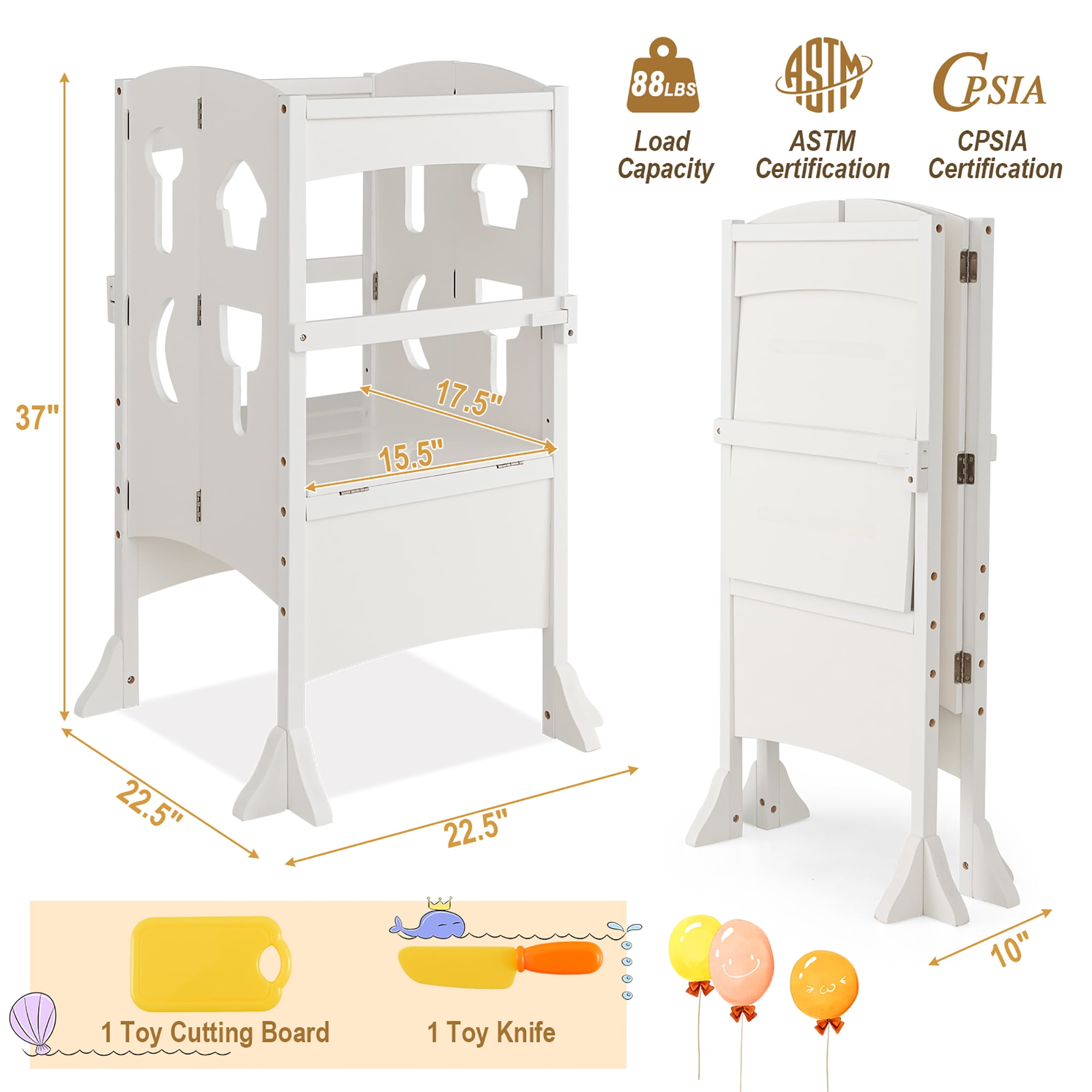 Height-Adjustable Platform: Our kitchen step stool features a 2-level adjustable platform(16” or 18.5”), so that toddlers over 3 years old can use it at a suitable height. Besides, the wide platform also offers your little one ample activity space. Convenient Folding Function: Designed with folding features, this kid’s standing tower can be easily folded into a narrow shape to save more space. Please remember to open the safety latches before folding. After folding, you are allowed to store the folded step stool in any corner of your kitchen, bathroom or dining room. Safe & Child-friendly Design: 4-sided guardrails provide your toddlers with all-around safety protection when they stand on the step stool. Meanwhile, locking handrails avoid accidental falling, adding more security.Plus, the safety tower comes with 1 toy cutting board and 1 toy knife for kids to play with. Selected Solid Wood Material: Our toddler’s step stool is made of solid wood material, which is burr-free, child-friendly and safe to use. On the other hand, the natural wood material is sturdy, strong and not easy to crack, which is sure to offer a long-lasting lifespan. Great Assistant for Kids: Our folding standing tower is a great assistant for kids. With this kitchen step stool, toddlers can climb up to wash hands, brush teeth, prepare food, bake, cook or reach for items by themselves. It will be an ideal choice to help kids to develop a good habit of independence.