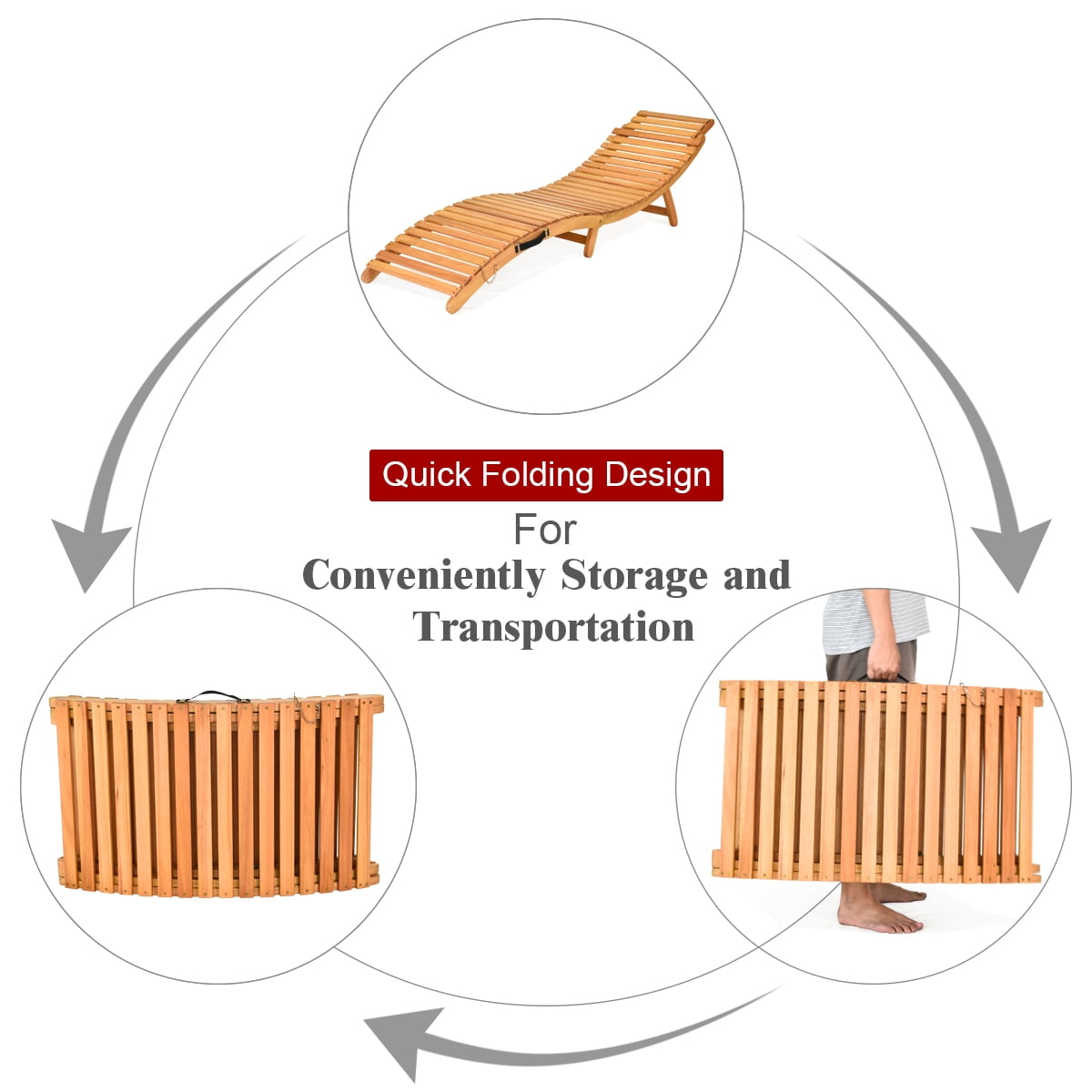 Wood Structure for Stability: Our patio lounge chair has great load bearing and long service life because of the solid eucalyptus wood frame. The sturdy legs are on both sides, providing better stability for the chaise chair. The cushion is made of premium fabric and the whole cushion is tightly woven for durability. Foldable Design with Safety Device: This outdoor lounge chair can be folded within several steps when not in use for space-saving. When the legs are fully extended, the locks ensure that the chair does not wobble. And the lockable design on the side can prevent the folded chair from accidentally unfolding during the transportation. Prominent Seating Experience: Our recliner has an ergonomic curved design, which can provide your legs and back with added relaxation. Because of the thick and soft sponge material, the cushion is comfortable for you to sit and recline. What’s more, the cushion is tightly secured to the lounge chair by ropes to prevent moving. Highlight of Outdoor D��cor: This outdoor wood chair is designed in natural and concise style. The cushion is double-sided and you can change the color to red or beige at any time. Our outdoor reclining chair is an ideal solution for patio, porch, poolside and garden. Coming with a convenient handle, you can carry this chair to anywhere you want in a breeze. No Need for Installation: Our lounge chair is pre-installed when you receive the package. You just need to unfold the lounge chair and secure the cushion and headrest to the chair to complete the simple installation.