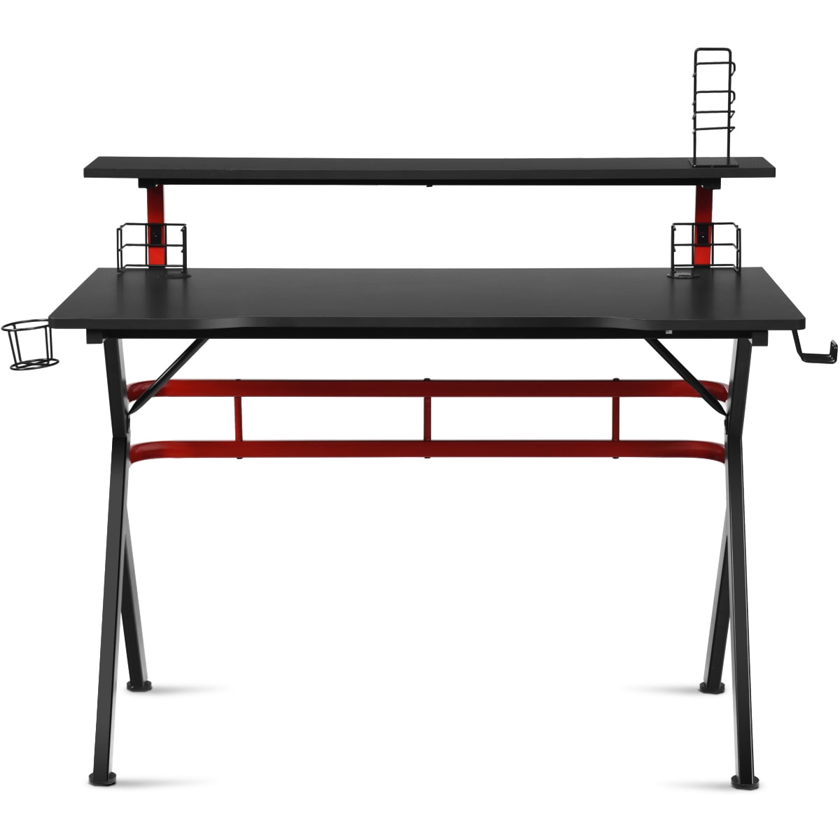 Spacious Desktop with Monitor Shelf: 47.5” x 23.5” wide gaming surface with an additional monitor stand shelf provides ample spaces for all your required gaming gear. It can easily accommodate your monitor, keyboard, laptop, mouse pad and other necessities, providing endless fun gaming time. Ergonomic & Comfortable Design: The gaming desk offers a superior comfortable sitting posture by keeping the monitor and keyboard at a reasonable height level. Along with an ergonomically designed curved surface, it can greatly reduce the fatigue of the whole body for added comfort. Sturdy & Reinforced Structure: Crafted from heavy-duty powder-coated metal construction, the gaming desk is promised to be super stable to withstand up to 135 lbs weight. Adopting special reinforced frame with durable adjustable non-slip pads, it desk can keep stable even on the uneven floor and eliminate wobble. Convenient Design for Gamer: Equipped with a convenient cup holder, a headphone hook, a gaming handle rack and 2 audio stands, the gaming desk helps you have a better gaming experience. Such a humanized design with dual cable management grommets frees up precious desktop space and makes all gaming gear within reach. Multi-functional & Versatile Usage: Featuring a modern and simple black appearance, the gaming desk can be used in multiply occasions with a unique decorative feeling. It’s suitable for bedroom, gaming room, office as a professional gaming desk or a practical workstation desk.