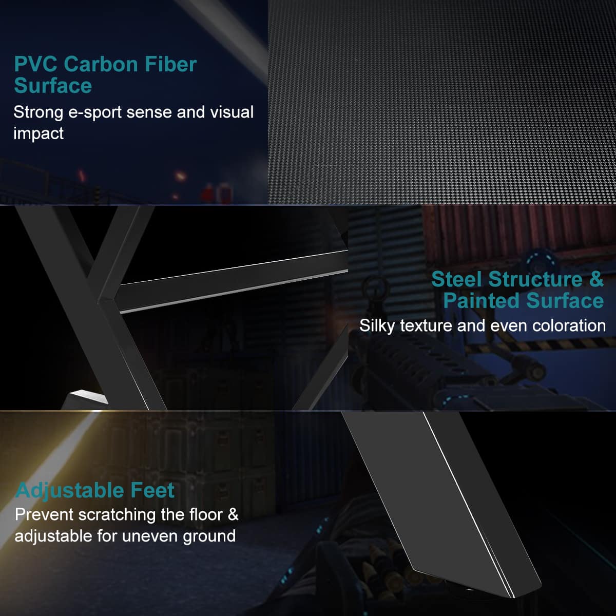 This is our brand new professional gaming desk which is a perfect choice for your enjoyable gaming time! It features large gaming desktop that can withstand 220 lbs of weight, providing ample room for your monitor, PC, laptop, speakers and more.PVC carbon fiber surface is scratch-resistant and easy to clean, reveals excellent performance to allow you to enjoy gaming in enough space. Equipped with a cup holder, a headphone hook and two controller stands, the E-sports table will keep all of your gaming gears organized and be convenient for your daily needs. X-shape frame constructed with steel pipes ensure the stability and durability of the table, accompanying you to enjoy your time in playing games. Good in quality and comfortable for usage, the gaming desk is really worth buying!