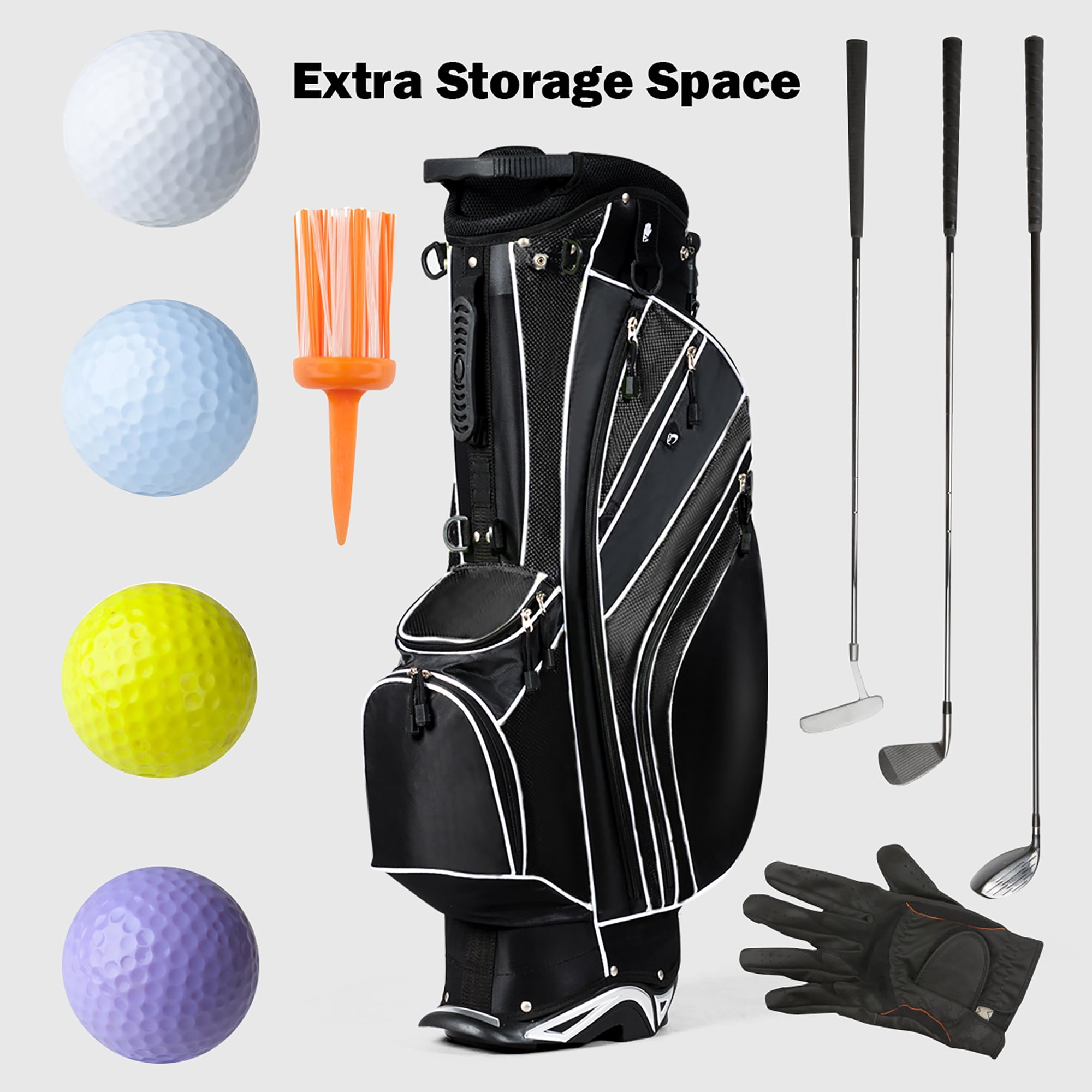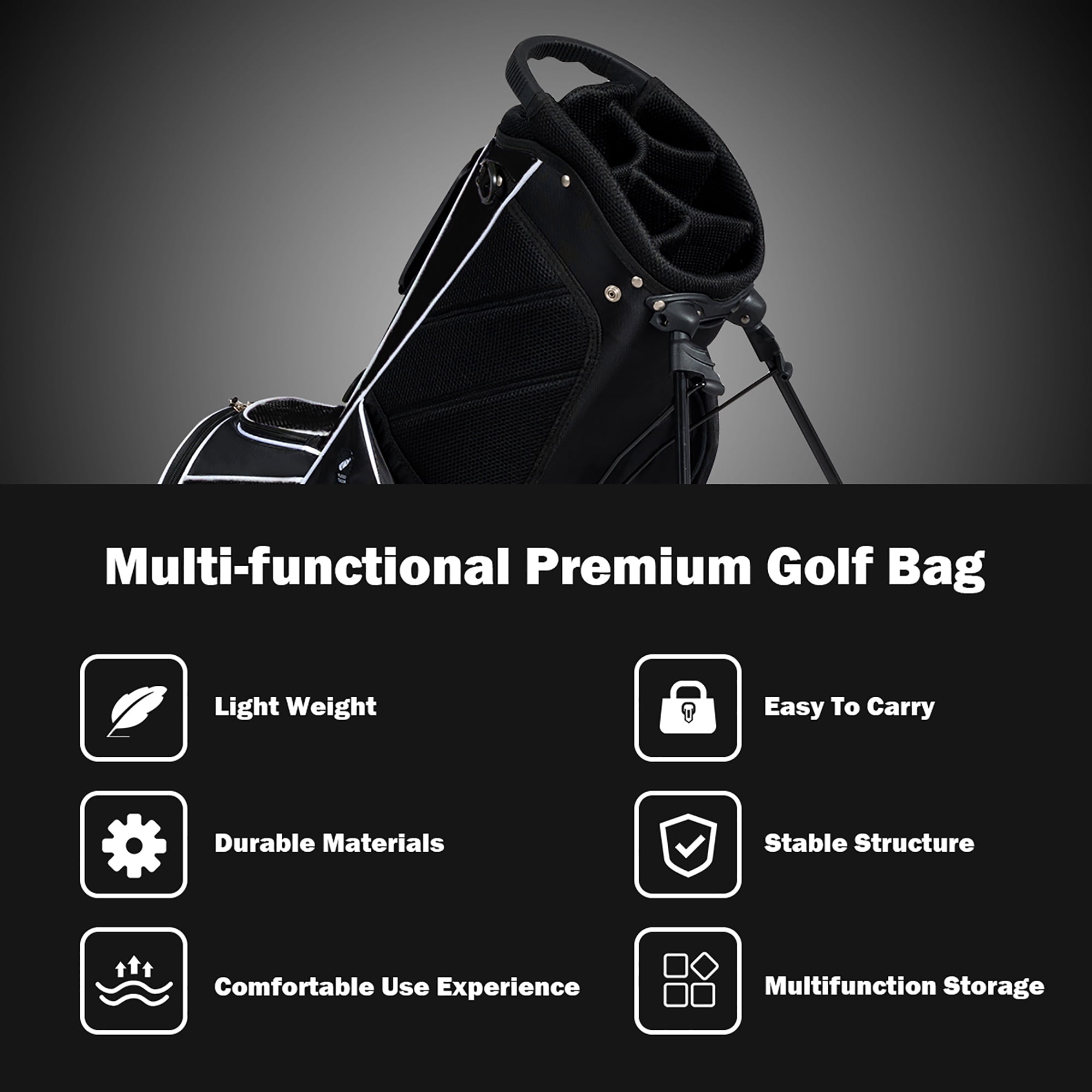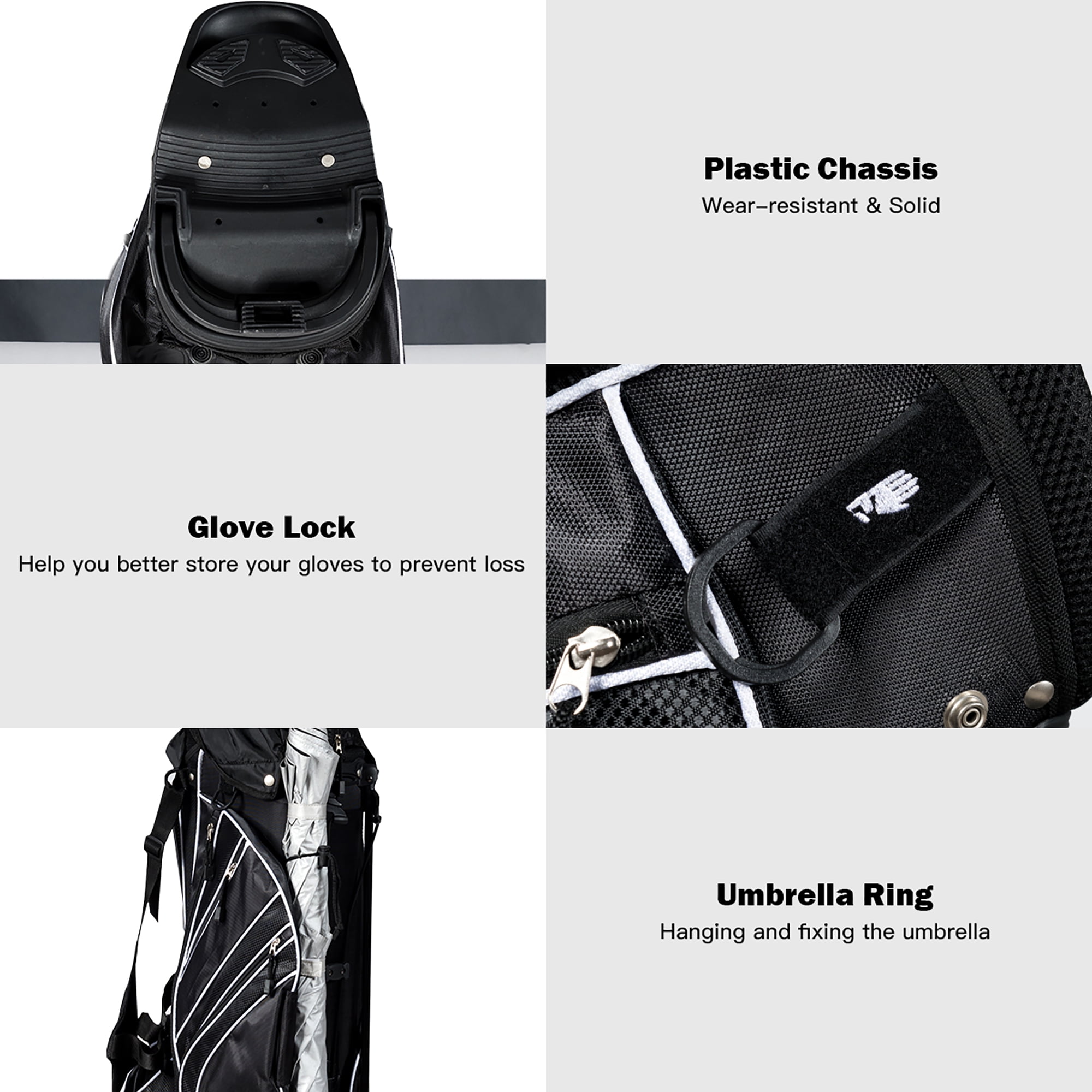 Water Resistance: Made of sturdy material, this sunday golf bag is water resistance to avoid any liquid to permeate. And its sturdiness can well up to the additional wear and tear while using it. It surely guarantees you a sturdy lifetime for its sturdy construction. Reasonable Capacity: Featuring light weight of only 6lbs and portability, golf stand bag 6 way dividers surprisingly offers you enough space to accommodate your golf clubs. There are 8 pockets on this bag to bring you additional storage space, which you can put various accessories in. Considerate Added Values: Backpack-style shoulder strap for extra comfort provides you a convenient handle on the side to quickly carry and go. And the special zipper design adds both practicability and aesthetics to this product. Specially designed umbrella holder offers you a good assistance. Premium Travel Helper: golf carry bag is quite great for traveling for it takes up very little space in a trailer, camper, or car trunk due to its compact body. You can just take it to your desired place effortlessly. And the bag can be stored neatly when you do not use it. Foot Support: With a mixed color and sturdy automatic stand with anti-slip foot, it can stand steadily and balanced as you want to release your hands. And it can also stand straight with a plastic chassis. A rubber foot pipe bracket can well prevent the scratch.