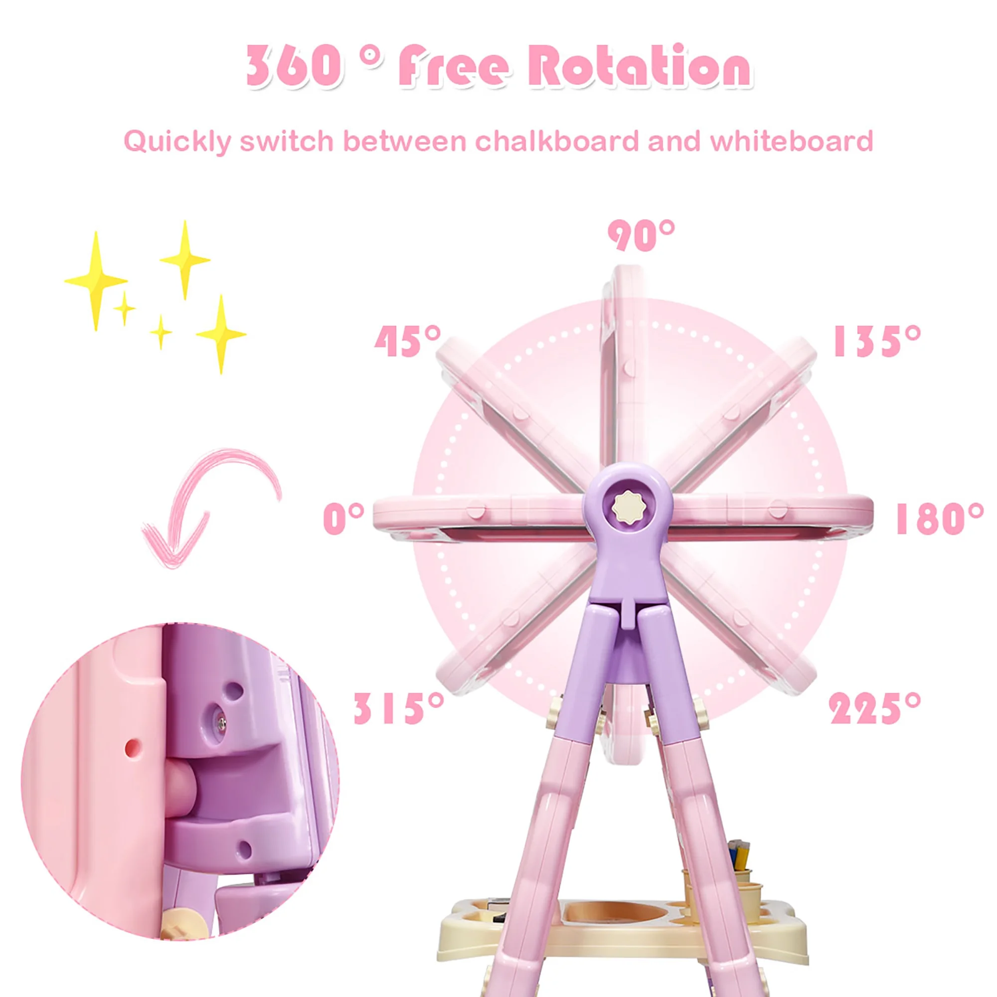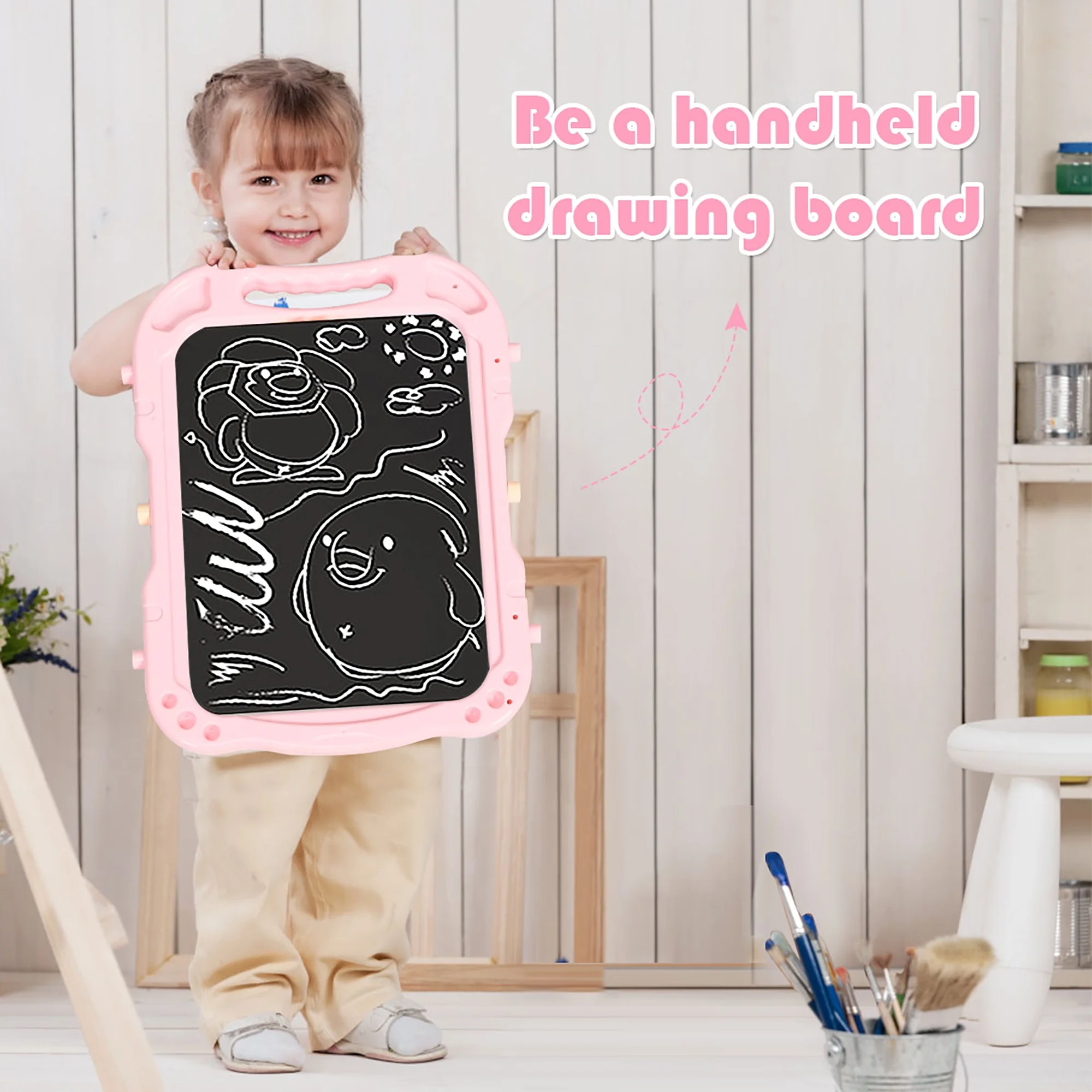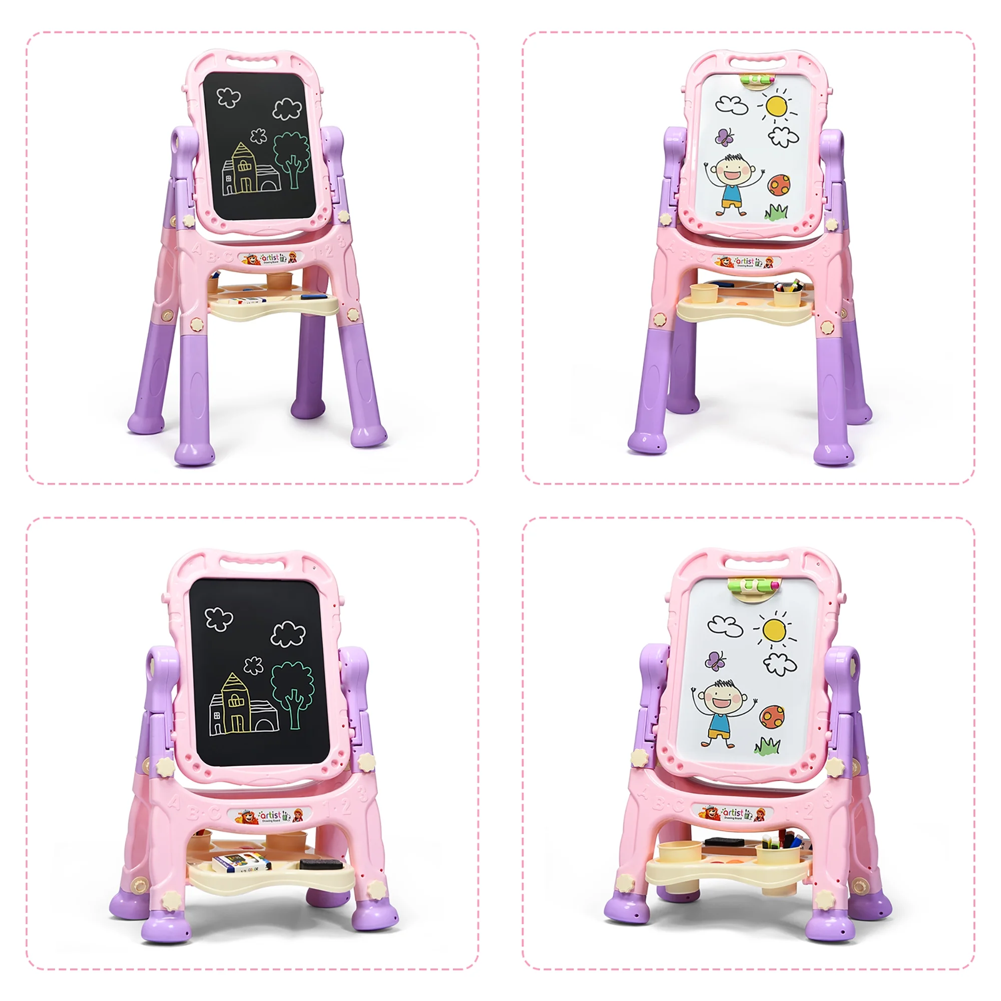 This art easel is a good gift for your little artist to release their talent of painting! Equipped with magnetic whiteboard and chalkboard, young artist can draw with his/her best friend to promote friendship. 360° rotating design allows kids to switch freely and add more fun. Moreover, it is equipped with 2 lengths of legs, allowing you to customize the art easel according to your child’s height. The storage tray is spacious to place chalks, markers, eraser, magnetic beads and so on. What’s more, environmentally friendly PP material and stable triangle structure ensure good safety for kids to use. Detachable drawing board with handle allows kids to carry it and draw anywhere. Cute colors will attract little artists to stimulate their imagination and create more works. Feature 2 leg lengths for you to customize proper height Double-sided whiteboard and chalkboard to support separate painting 360° rotatable adjustment and smooth track for easily switch Environmentally friendly PP material for safe use Triangle construction to ensure excellent stability Erase and magnetic beads can be attracted on the magnetic board Detachable from frame to use as a handheld drawing board Chalk cap to keep hands away from chalk dust Large storage tray to put art accessories in order Paper clip to clip drawing paper and chalk cap for multifunctional use Comes with eraser, chalks, magnetic beads, markers, cups and chalk cap Suitable for children over 3 years old Perfect for kids’ art activities in classroom, preschool, playroom, etc Improve child’s imagination and creativity Enhance interaction to paint with friends Easy to assemble and store Specification Color: Pink Material: PP Product Dimension (Long Legs): 24” x 17.5” x 43” (L x W x H) Product Dimension (Short Legs): 23” x 12” x 32.5” (L x W x H) Board Size: 16.5” x 20” (L x W) Applicable Age: 3+ Net Weight: 7 lbs Package Includes: 1 x Kids Easel 2 x Storage Cup 5 x Whiteboard Pen 12 x Chalk 1 x Chalk Cap 1 x Eraser 12 x Magnetic Beads 1 x Sticker