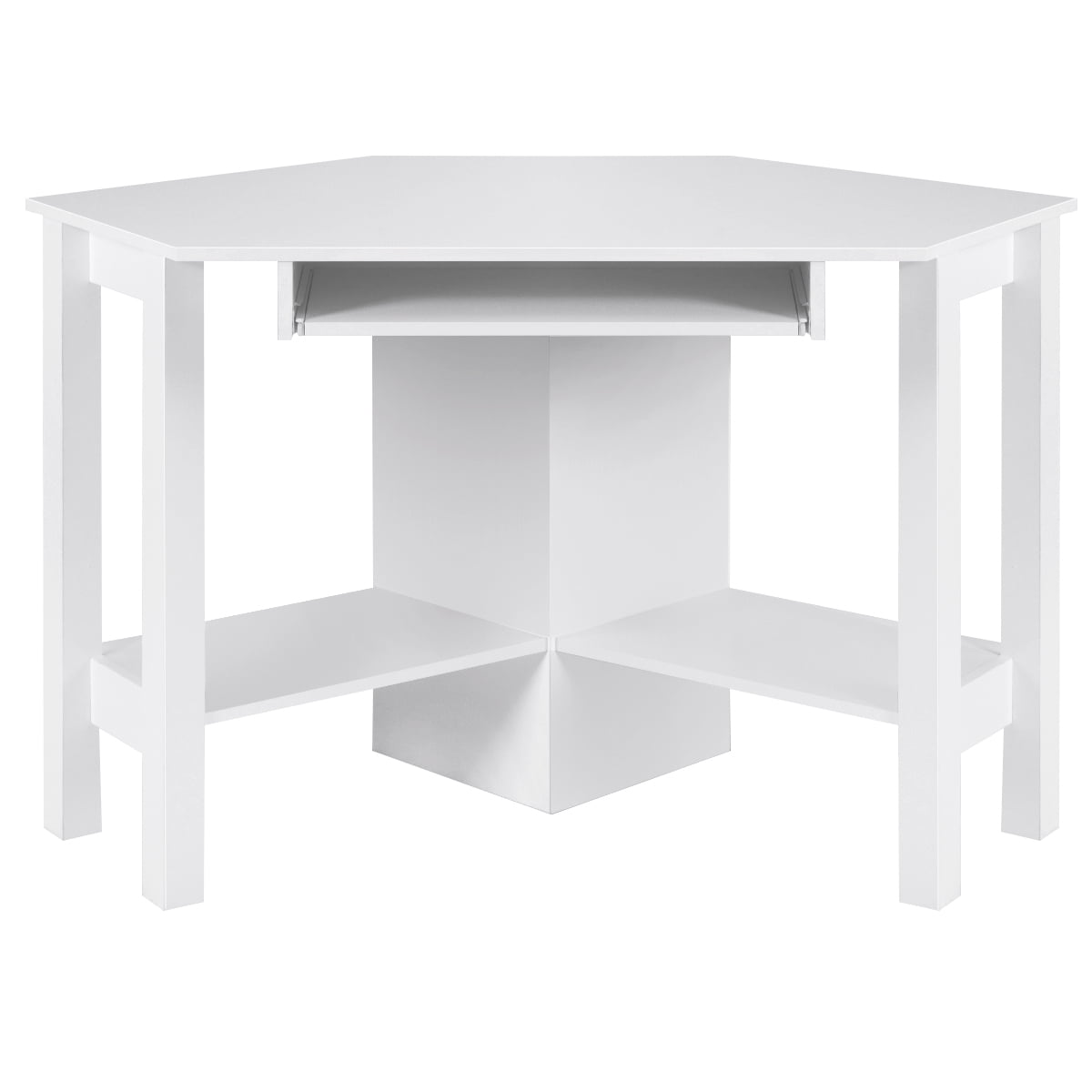 Costway Implied as Simple and Elegant Corner Desk with Drawer and Shelves, White Simple and elegant design that enhances any room decor Constructed with durable Particle Board for long-lasting use Large desktop space ideal for placing a computer, books, and other essentials Overall dimensions: 48”L x 24.0”W x 30.5”H Weight capacity of 200 lbs, suitable for various office equipment Features a large opening drawer for convenient storage of a keyboard Includes two additional storage spaces underneath for a host computer, mini printer, books, and CDs Space-saving corner design maximizes limited floor area
