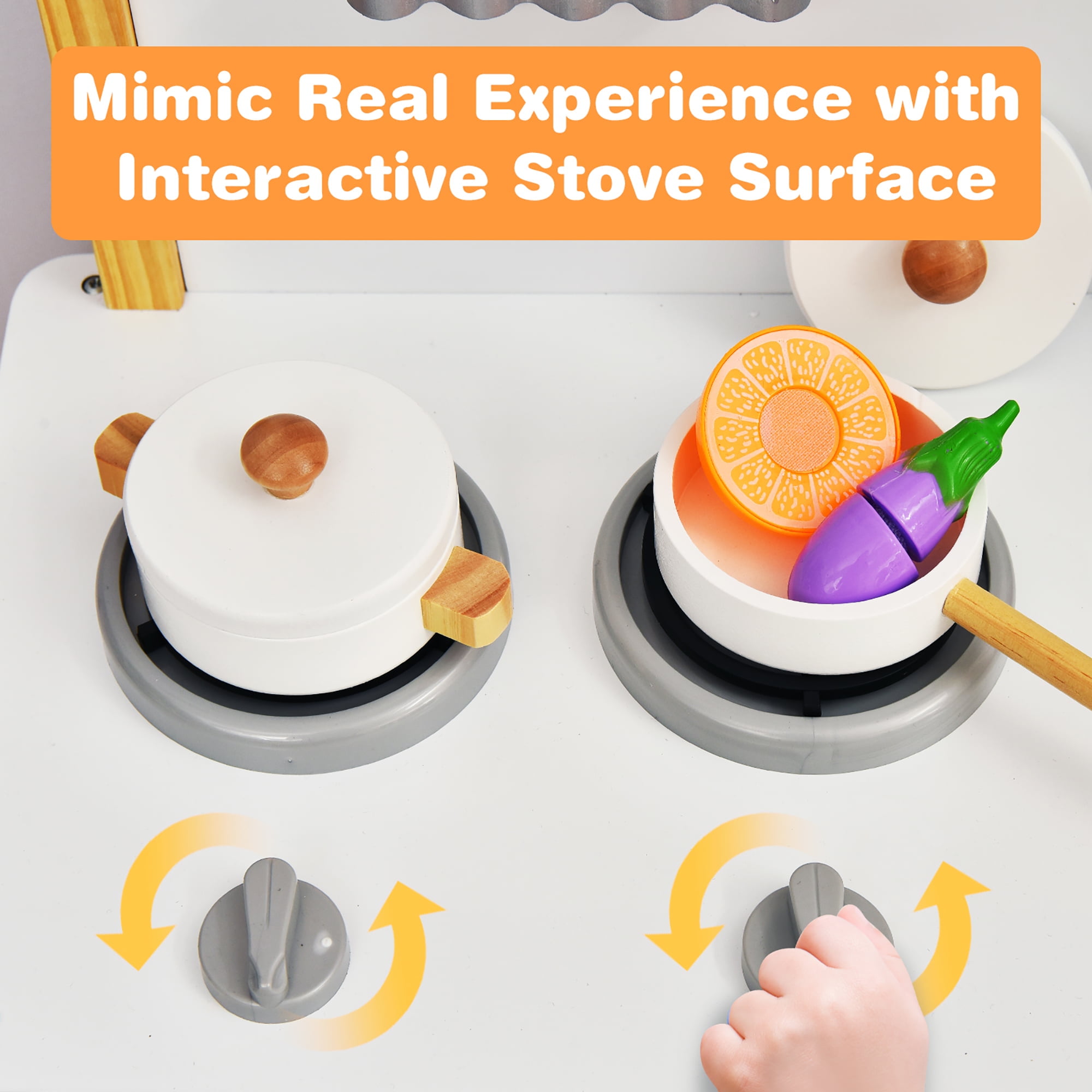 Realistic Kitchen Cooking Toy: This play kitchen features real cooking scenes including a built-in stove with 2 knobs, a sink with rotating faucet, a simulated oven for baking, mimic ventilated windows, and a large 2-tier storage cabinet, providing an authentic cooking experience for your little kids. Safe Material & Sturdy Construction: Built with premium-quality and scratch-resistant MDF board, the toy kitchen set is not only sturdy and sturdy for long-term use but also easy to clean with a smooth surface. In addition, with eco-friendly paint coating, your kids can enjoy kitchen time safely. Complete Set: Equipped with several realistic cookware including a pot, a pan, a spoon, a scoop, and a strainer, the cooking game will be more lively & interesting and provide for your little ones to have countless hours of play. Besides, there is a storage cabinet for kids to sort things by themselves. Develop Imagination & Creativity: This gorgeously crafted kitchen playset is a great toy for kids to work on their fine motor skills, logical thinking, language expression, and social skills while learning about the importance of forming healthy eating habits and cooking. Best Gift for Toddlers: The cute design and fun accessories will impress your little ones as a surprise gift. And the pretend cooking set allows other kids and parents to join in which can promote the relationship. Besides, it contains detailed step-by-step and easy-understanding instructions to help you install quickly.