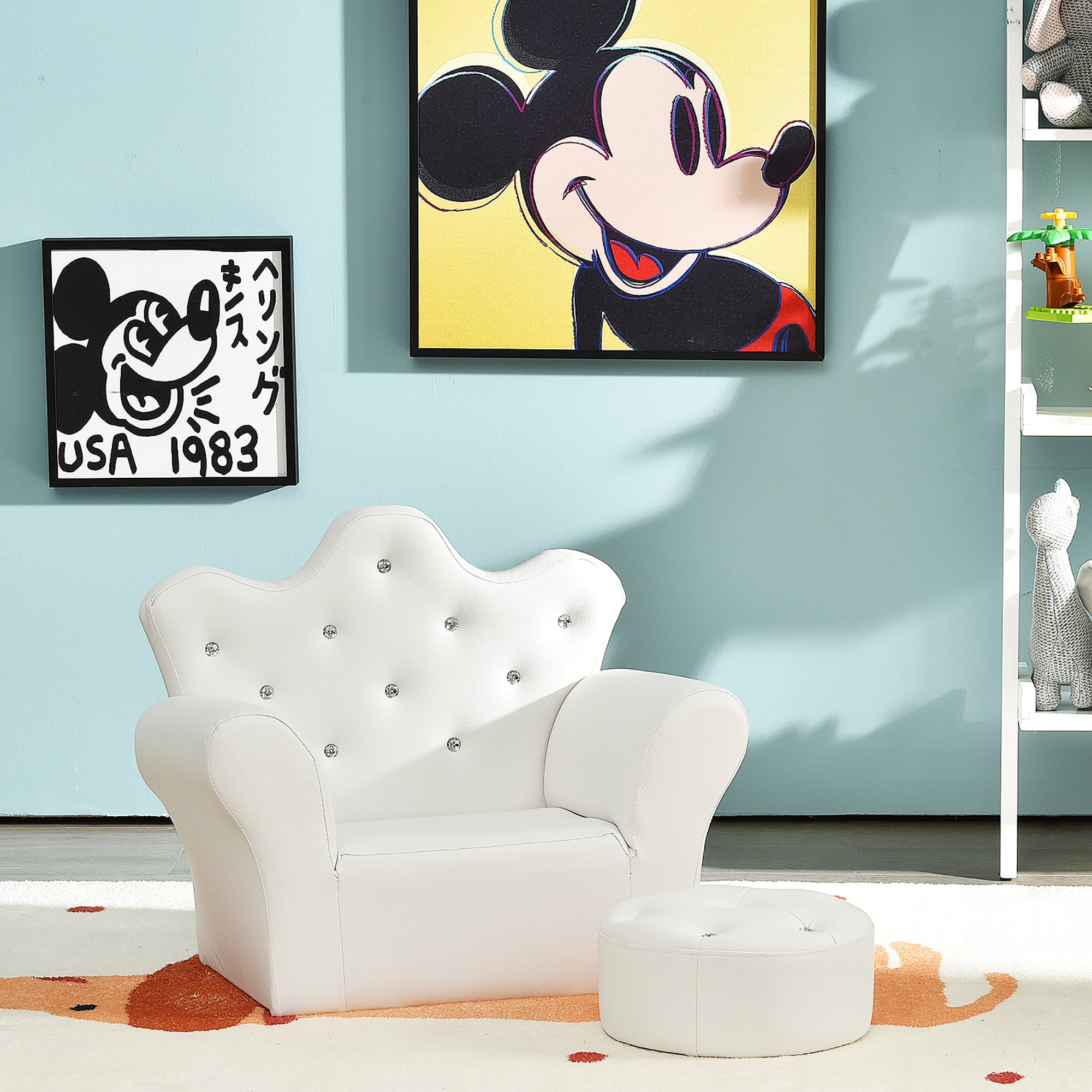 Cute & Elegant Appearance: This lovely princess sofa set with diamond decoration will make all dreams come true in any kids room. It is an ultimate space-saving and light-weighted child sofa set that will be a great addition to kids room, bedroom, living room and kindergarten. Comfortable Sitting Experience: This toddler chair is filled with high density sponge that provides kids with enjoyable sitting experience. Moreover, paired with comfy ottoman, this sofa set allows your little one to spend more leisure time on their own furniture to sit, read stories, watch movies, eat snacks, play or just relax. Waterproof PVC & Easy to Clean: Our sofa is covered by breathable PVC leather, which can be easily wiped clean with a wet cloth. Parents don’t need to worry about children dropping rice grains or oil stains on the sofa during meals. Additionally, it comes with anti-slip foot pads to prevent the floor from scratching. Sturdy Structure & Safe Materials : The sofa is supported by sturdy solid wood structure that effortlessly bears a maximum load up to 110 lbs that leaving no worries about children’s safety. Perfect Gift for Kids: This ergonomically designed sofa has backrest, armrest and reasonable height, which can effectively support the babies’ spine and make the babies form good sitting habit. It is an ideal gift for children aged 3 to 5. SOFA SIZE: 23” x 16” x 19” (L x W x H). OTTOMAN SIZE: ��11”x 4.5”H .