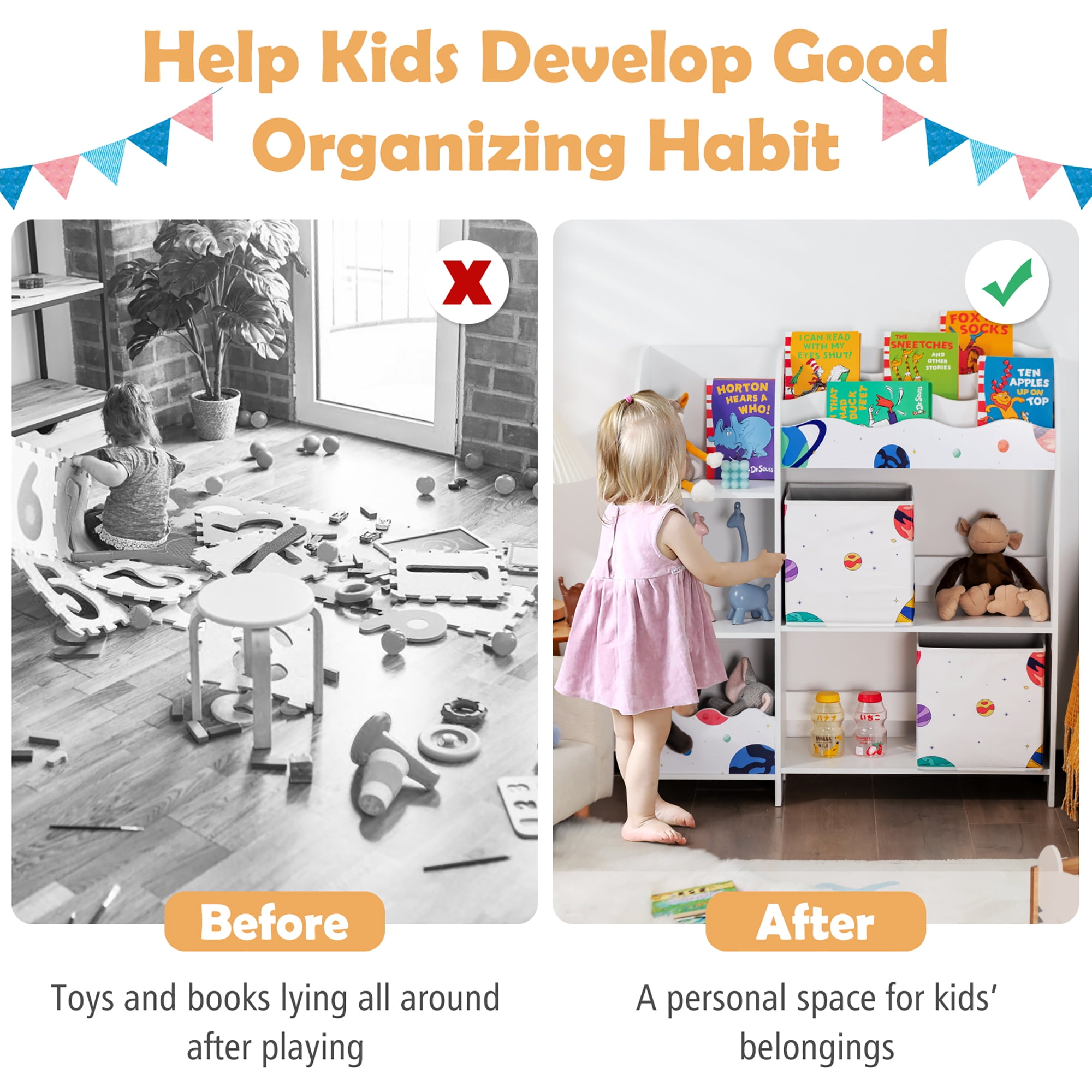 Help Kids Develop Good Organizing Habit: Our 3-tier storage cabinet creates a personal space for kids’ belongings, helping kids to learn to organize their toys and books. Designed in kid-friendly height, kids can take things easily. The slots on the top are built for displaying books to stimulate children’s interest in reading. Large Storage Space with Classification: This kids storage unit features 5 compartments, 2 cloth drawers and 3 slots to provide large and classified storage for books, toys, snacks, daily supplies and more. Besides, the cloth drawers are removable and you can change their positions according to your needs. Stable Structure with Safe Designs: Except the stable structure, this toddler storage organizer comes with 6 non-slip foot pads which not only protect the floor from scratching but also ensure stability while using. More importantly, the rounded corners and anti-toppling devices ensure extra safety and stability. Premium Materials & Humanized Details: Made of high quality engineered wood, the kids storage unit features high stability and durability. In addition, the back of the cabinet is designed with anti-falling baffles which prevent items from dropping. The waterproof surface is easy to clean with damp cloth. Easy Assembly & Wide Application: The assembly is easy and quick with detailed instructions and included accessories. Decorating with cute and attractive patterns, your kids will fall in love with this storage cabinet as soon as they get it. Also, the kids storage organizer is ideal for many places, such as living room, reading room, playroom and daycare.