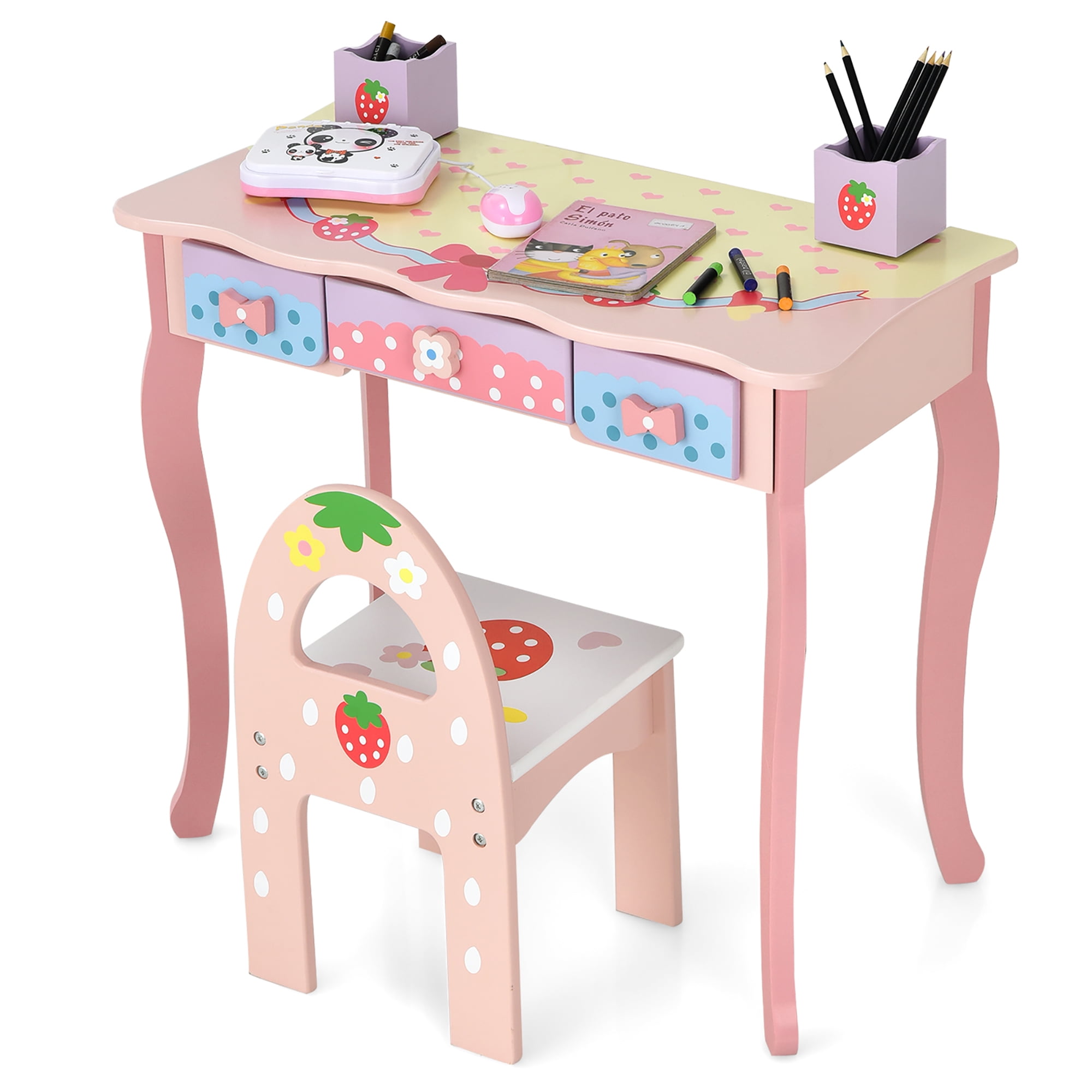 360° Rotating & High Definition Mirror: The makeup table is equipped with a 3-panel mirror with clear imaging, which offers a large view for kids to check their makeup and hairstyle. Besides, the 2 side smaller mirrors can spin 180° and the middle larger mirror can spin 360° to achieve a perfect reflection. 2 in 1 Design with Detachable Top: The top part of the dressing table can be moved away, so your child can use the table as an ordinary writing or reading desk when necessary. Additionally, the matching chair features an ergonomic backrest and wide seat, enabling kids to enjoy make-up and studying in max imum comfort. Sturdy Construction & Safe Design: Crafted from premium MDF with anti-slip foot pads on the bottom, this kids vanity set is pretty stable and sturdy. Considering children’s safety, the vanity set is designed with round corners and smooth edges. Moreover, there is an anti-toppling device at the back of the table to enhance stability and safety. Cute Appearance & Large Storage Space: Featuring cute strawberry and flower patterns on the surface, this pink vanity set will be a perfect gift for your kids. The tabletop is large enough to display your kids’ beloved items; meanwhile there are 3 drawers and 2 small girds to store their own jewelry, cosmetics, combs, brushes, etc. Quick Assembly & Product Dimension: This kids makeup table and chair set comes with detailed instruction for you to follow. And you can complete the assembly work in a short time. Dimensions of the dressing table: 27.5”x 13.5”x 41.5”(L x W x H); Dimensions of the chair: 11”x 10.5”x 19”(L x W x H).