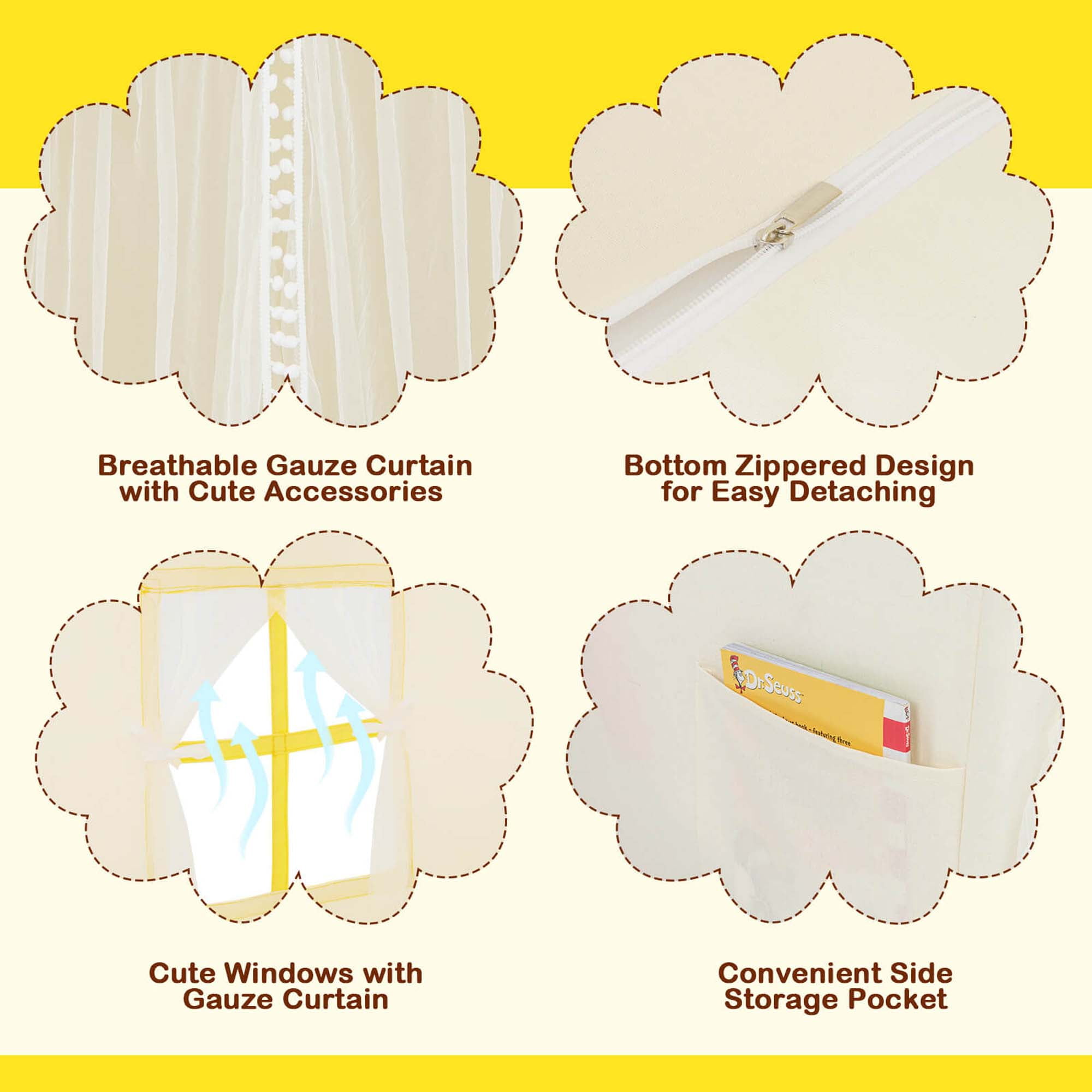 Create Magic Adventures for Your Kids! Our large play tent measures 48” x 42” x 50” (L x W x H), which can comfortably accommodate 2 kids, providing expansive space for endless adventures. Delight in the rich accessories and charming appearance, including a bright star light string, colorful flags, and a soft padded mat. The premium polyester cotton canopy ensures a cozy and comfortable environment, while the accompanying soft cotton mat with pillows adds extra comfort for playtime or relaxation. Besides, the canopy and mat are easy to clean, keeping a hygienic environment for your kids. Built with durability in mind, the tent features 0.8” thick PVC pipes and firm connections for a stable structure. In addition, it features 2 mesh windows and a curtain door, promoting airflow and enhancing the sense of play within. Whether it’s a cozy reading nook or a magical fort, the possibilities are endless. It’s a versatile addition to any child’s room. Feature Includes charming star lights and adorable little flags for decoration The polyester cotton canopy is tear-resistant and wrinkle-resistant, ensuring long-term use The padded mat with soft cotton filling provides a skin-friendly and comfy experience The frame is constructed of sturdy PVC pipes with firm connections, ensuring good sturdiness The 0.8” thick PVC pipes provide strong support, not easy to deform The cute windows and a large front door with curtains ensure good ventilation The bottom zipper design for easy detaching, convenient to store when not in use Comes with a side storage pocket, keeping books and toys within reach Kids can read books, take a nap, play games with friends or parents in it The perfect holiday, birthday, or Christmas gift for your boy and girl The tent can accommodate 1-2 kids for hours of fun Specification Color: Beige Material: Polyester Cotton, Cotton, Polyester Fabric, PVC Overall Dimensions: 48” x 42” x 50” (L x W x H) Size of the Padded Mat:47” x 48” (L x W) Star Light String Length: 5.5 ft Net Weight: 9.5 lbs Requires 2 x AA Batteries (not included) Package Includes: 1 x Kids Play Tent 1 x Padded Cushion 1 x Star Light String 1 x Colorful Flag String 1 x User’s Manual
