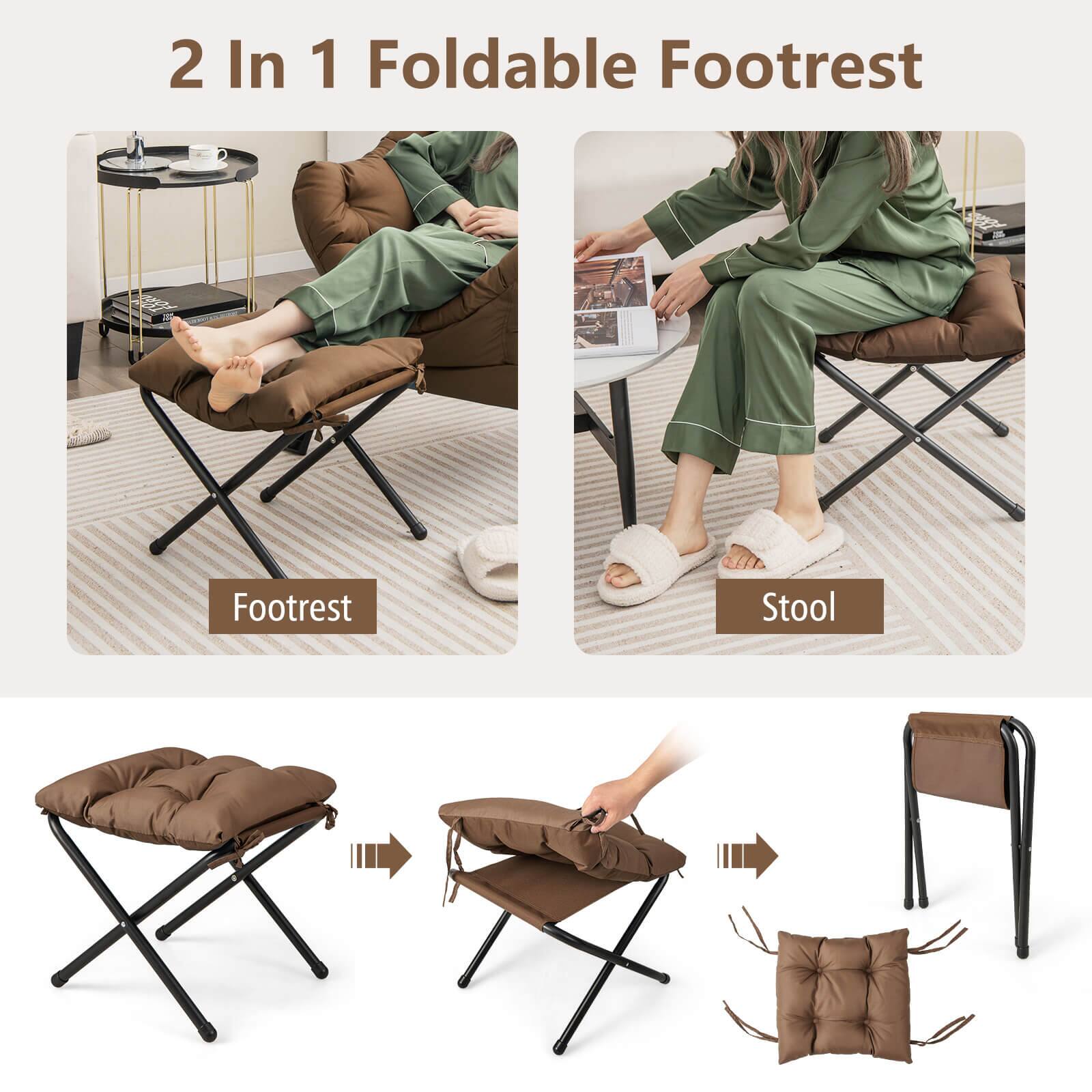 Curl yourself up on our lazy chair and footrest set! This modern lounge chair with a footstool offers a perfect spot for you to rest. The oversized ergonomic seat, soft head pillow and armrests allow you to completely relax. What’s more, the footstool provides extra support for your legs and feet, so that you can find the perfect position for maximum comfort. Designed with durable polyester fabric cover and soft doll cotton filling, the accent chair is not only comfortable, but also durable for years of constant use. The heavy-duty metal frame is sturdy enough, ensuring high load capacity. And the foldable footstool with a removable cushion can also be used as an additional seat when needed.