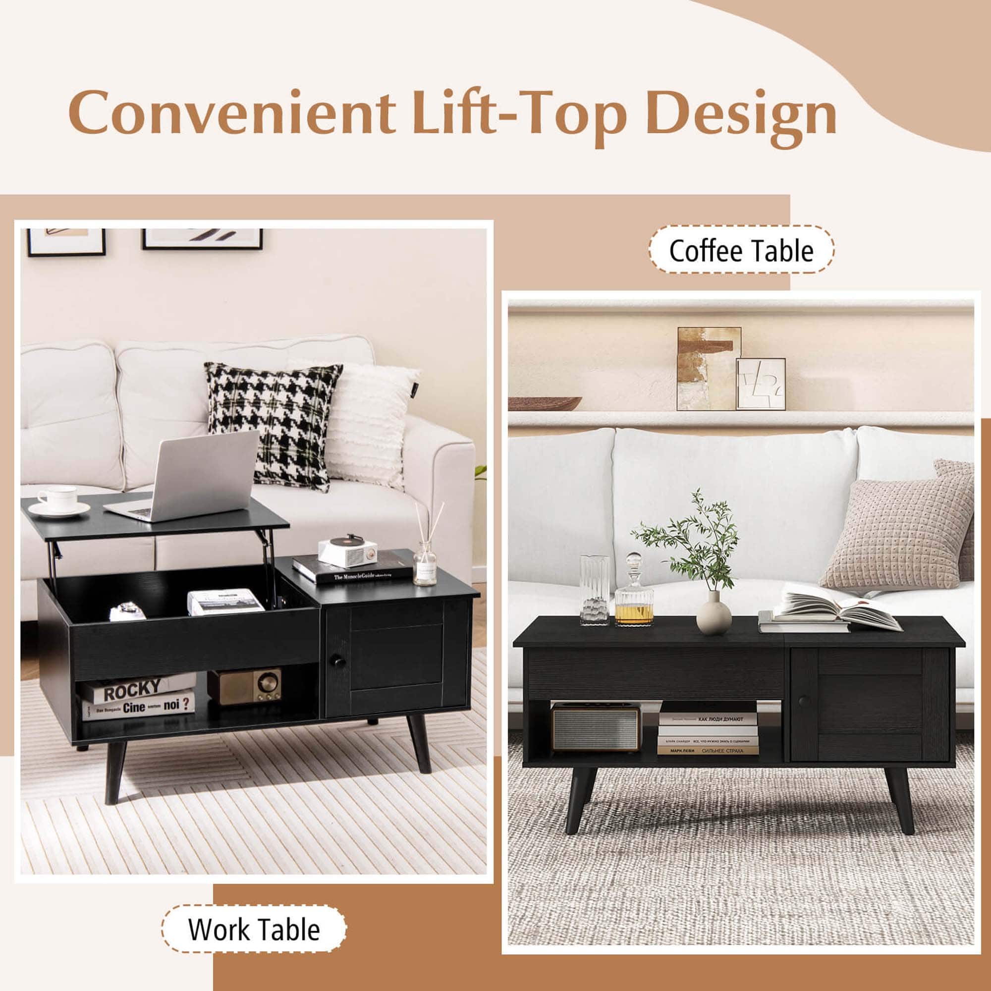 Discover the ultimate blend of style and utility with this lift top coffee table. With a simple pull, the elevated work surface is provided to place your laptop or enjoy a meal comfortably from your sofa. Below the lift top, the hidden compartment awaits. An open shelf serves as the perfect spot for decorative items and storage box. Additionally, the side cabinet offers discrete storage for those items you prefer tucked away, maintaining a neat and tidy area. Its sturdy structure leaves you no worry about load bearing capacity and using reliability. This flip-top coffee table evolves into an indispensable piece of furniture in your home.