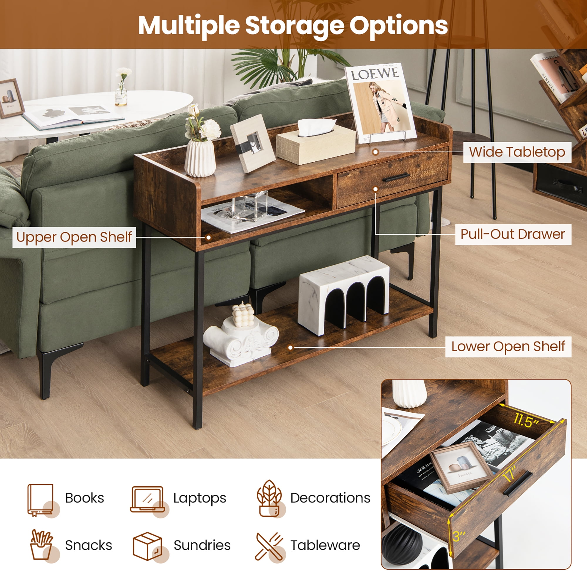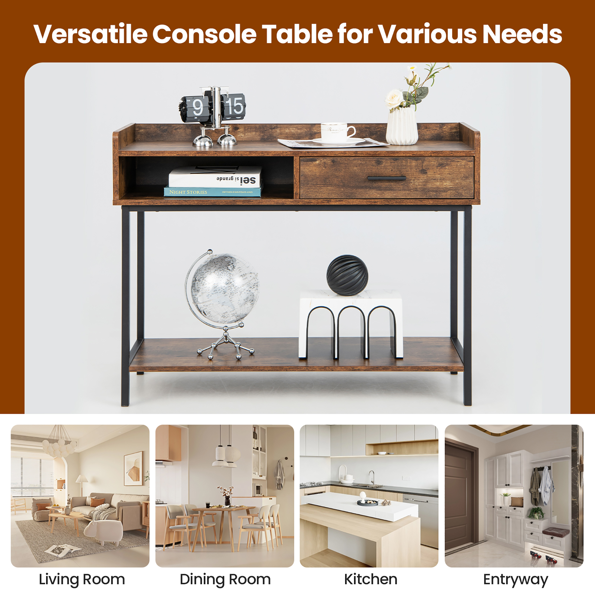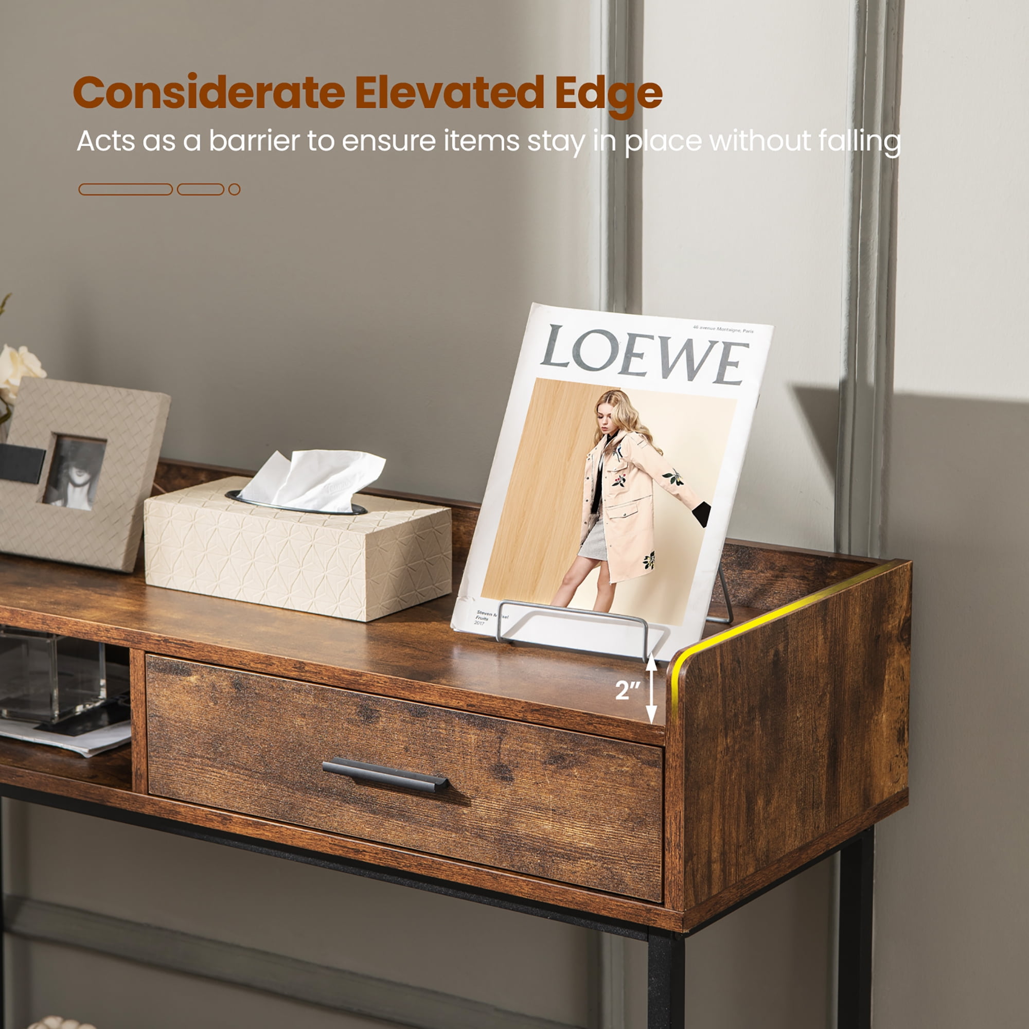 Space Ideal for Display: The 39.5” x 14” (L x W) tabletop features a 2” high elevated edge, working as a protector to keep collections in place without falling. More, the console table also has a 17” x 11.5” x 3” (L x W x H) drawer and an open shelf. One ensures privacy and the other allows for easy access to commonly used items. Elevated Bottom Shelf: 3.7” above the floor, there is a thicken shelf, measuring of 38” x 13” (L x W), where you are able to place some sundries, books or small appliances under 17”. More conveniently, the bottom clearance is spacious enough for effortless sweeping to keep your home tidy and neat. Reinforced Metal Frame: Thanks to the reliable frame, which is composed of strong metal tubes, the tabletop features a great load capacity of 200lbs. Besides, the foyer table with anti-slip pads also features an anti-tipping kit, ensuring a close attachment to the wall and eliminating the risk of toppling. Long Shape Saves Space: Designed with a sleek rectangular shape, the console table can perfectly match any corners and sofa backs. Put another way, the couch side table is very space-saving and allows for multi-scene uses. As you want, you can place it in the living room, entryway, dining room, kitchen, etc. Easy & Quick Installation: Since the industrial console table comes with a manual, you can get detailed guidance and easily finish the assembly by yourself. Meanwhile, its surface is smooth, which is also helpful for simplifying daily maintenance.