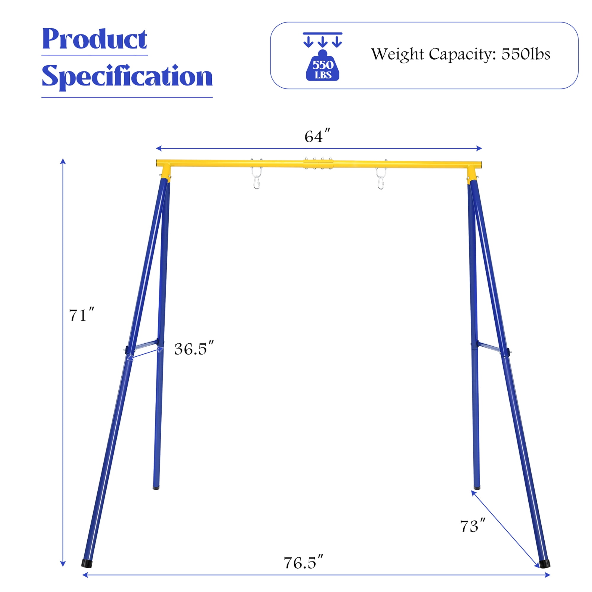 This is our sturdy swing stand which is made of heavy-duty iron pipes. A-shaped design provides this swing stand with super stability . Ground stakes can be used to enhanceits stability. Children don’t feel crowded because our tall and wide metal swing stand provide large playing area for them. What’s more, the foot pads achieve additional stability and prevent the floor from being scratched.The swing frame is powdered with anti-rust finish, so it is rustproof and weather-resistant and suitable for garden,backyard, park. Feature A-shape swing frame made of full metal provides you with super stability. 2 carabiners achieve two hanging options to meet various hanging demands 4 ground stakes help you increase its sturdiness on grass. Can hold up to 550lbs and matches most of swings Large Spacegives families more room to play safely Anti-rust finishde heavy duty iron tubes is rustproof and weather-resistant suitable to set in the backyard, garden, lawn, kindergarten Easy to assemble with installation guidance Specification Color: Blue and Yellow Material: Iron Overall Dimensions: 76.5” x 73” x 71” (L x W x H) Net Weight: 33lbs Weight Capacity: 550lbs Package includes: 1 X Swing Stand 1 X User’s Manual