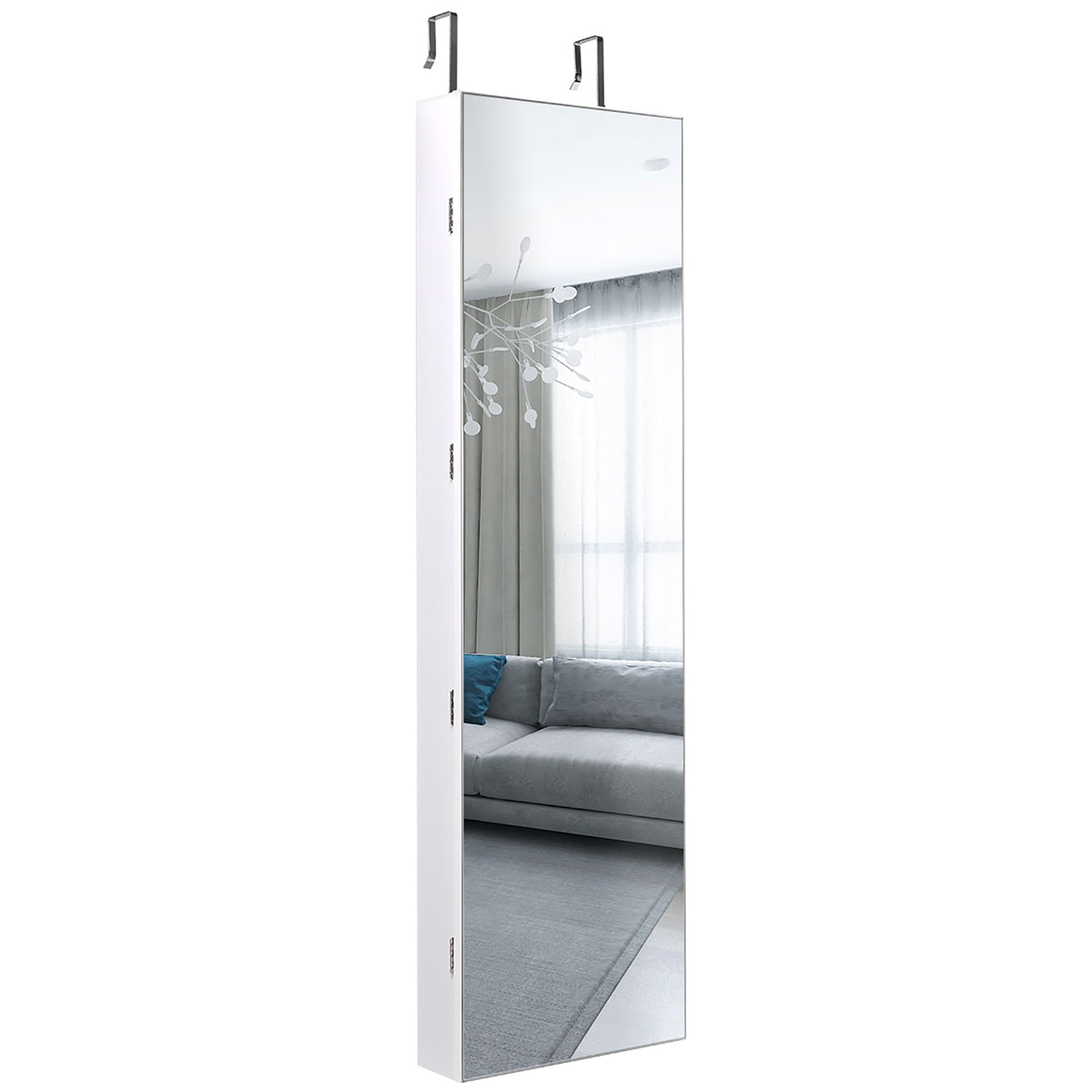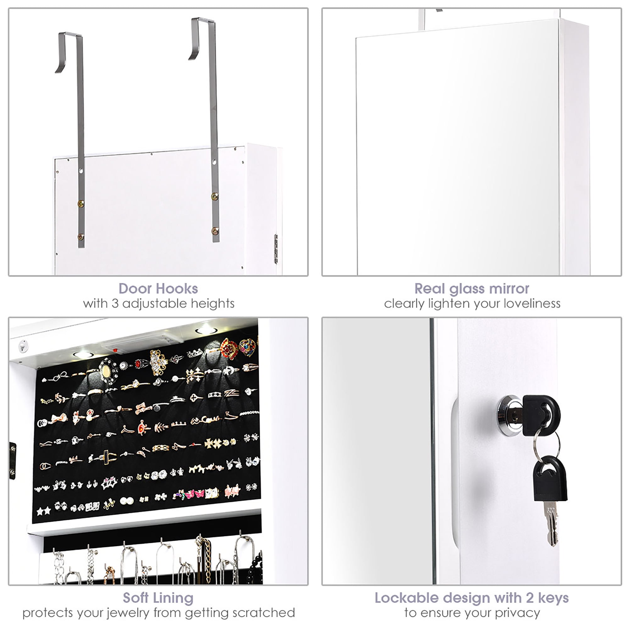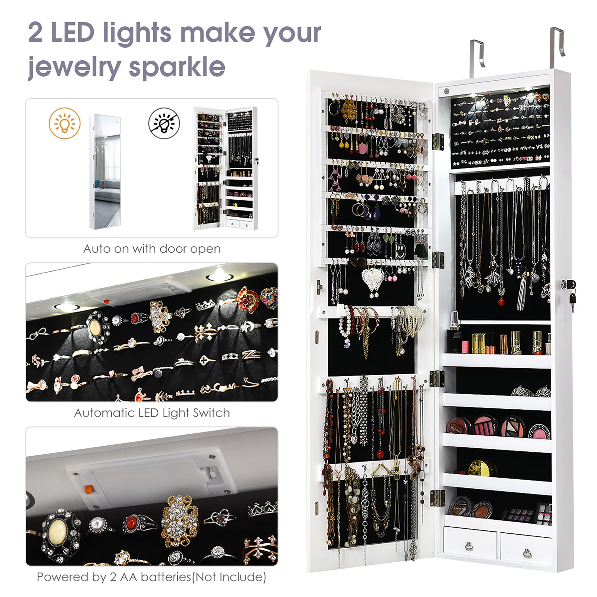 Layered & Spacious Storage Space: It features 6 lined shelves earring slots on the left cabinet wall, 1 scarf rod, 36 hooks for necklaces and bracelets, 2 rows of 60 ring slots, and 5 storage shelves for cosmetics and 2 bottom drawers for small stuffs. They are specially designed for practical storage purpose, making your ornaments organized and easy to pick up. LED Lights & Lockable Cabinet: 2 LED interior lights automatically switch on and off with mirrored door open and close, and powered by 2 AA batteries (NOT INCLUDED), making this cabinet help you quickly to choose the jewelry you need. Even in dim light, you can clearly see the rings and pick up the right pieces. It comes with 2 keys to keep your jewelry privacy and far away from loss. Stylish Cabinet with Full-length Mirror: The stylish outlook makes it a perfect decoration which can enhance the style of your room. The full-length frontal mirror measures 47 x 14 inches, so you can check your outfit from head to toe when getting ready and applying makeup. The large mirror reflects your appearance, making you look glamorous before heading out for a date. Wall & Door Mount Armoire: Available when hanging the jewelry cabinet over the door, you can also mount it on the wall with screws to save floor space. There are 2 hooks on each side, you can adjust the most suitable position according to your height to get a better view. It is perfect for people in limited space and also ideal for large rooms, saving much space. Premium Material & Strong Construction: Made of premium MDF board with fine wood grain, durable and solid for a long service life. The frame is thick and with strong strength, will not easy to warp or break. The cabinet is painted with NC finish, smooth and anti-corrosion. And the soft velvet liner protect your fine jewelries from scratches.