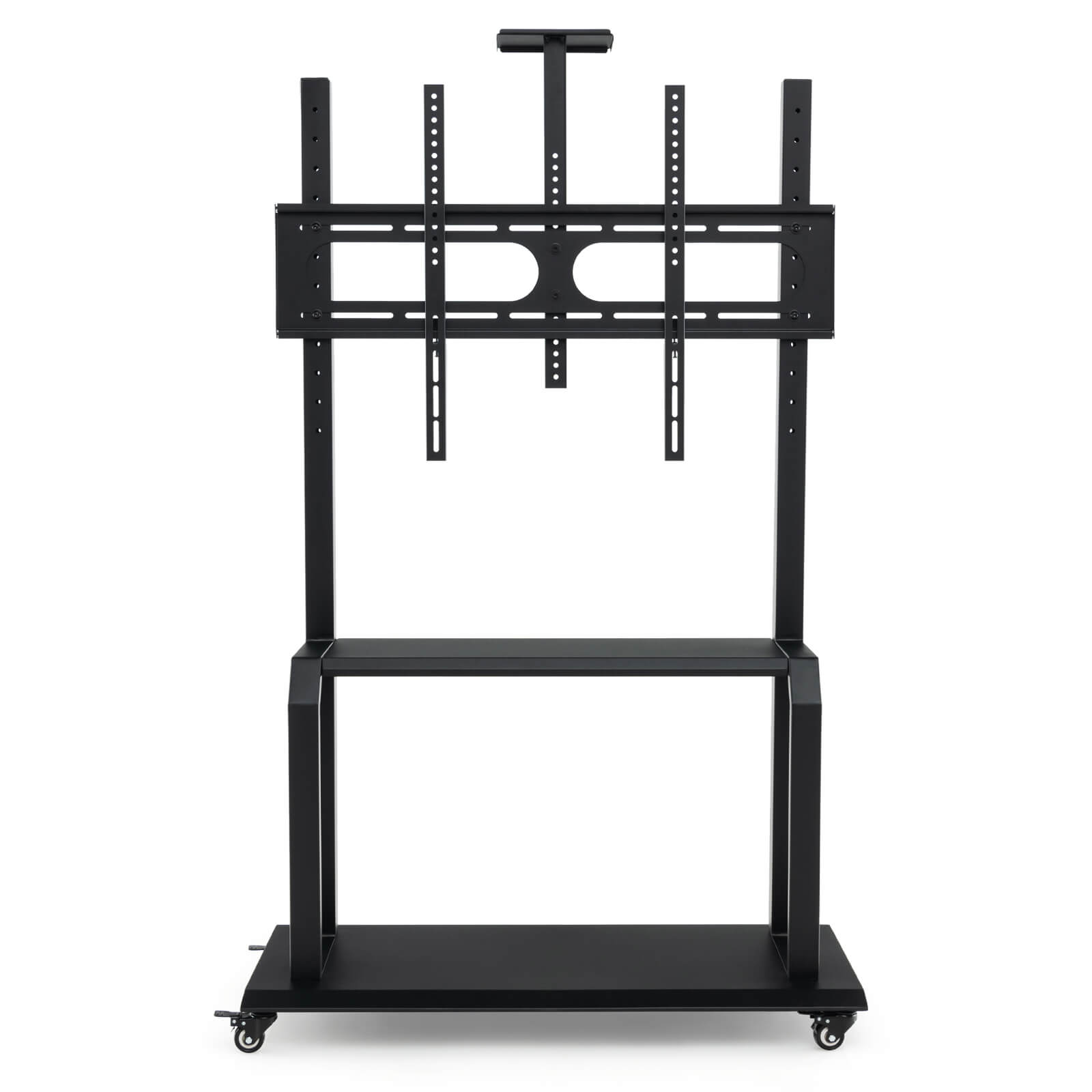 Equipped with an adjustable bracket supporting 32”-80” flat/curved TVs, this mobile TV stand is perfect for personal or professional use. The robust mounting system adheres VESA patterns from min 200 x 200 mm to max 900 x 600 mm, with matching screws for a secure fit.