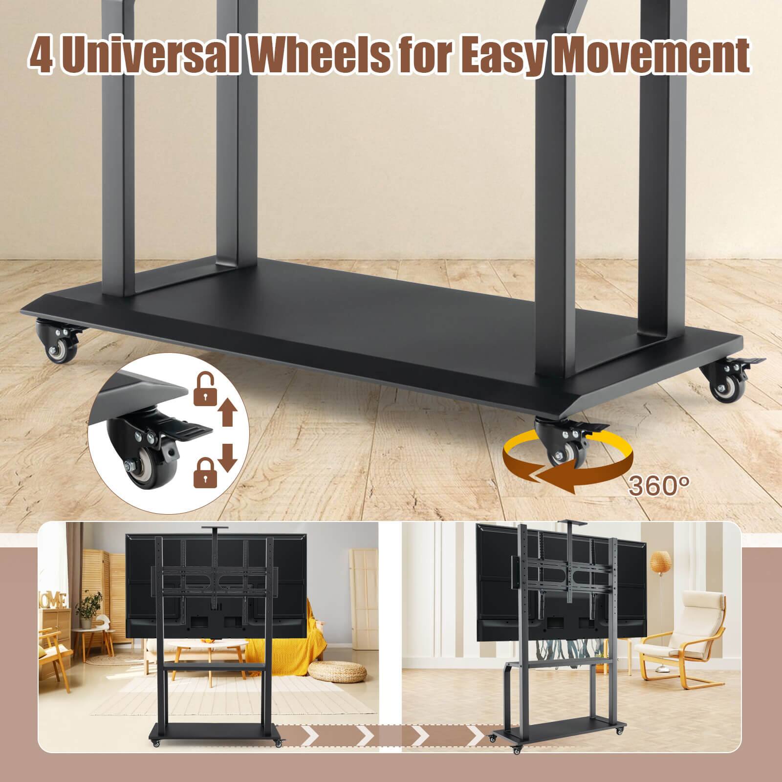 Move your TV setup effortlessly across various floor types with smooth-rolling casters designed to glide without snagging. The lockable feature ensures the cart remains stable during use, providing a safe and secure setup at any location.
