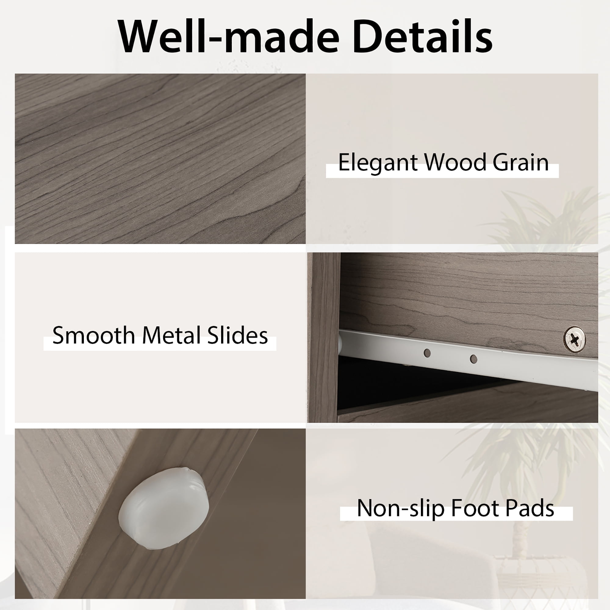 Deep & Large Storage Drawer: Featuring 5 large storage drawers, each measures 25” x 13” x 4” (L x W x H), the dresser for bedroom offers ample storage space for books, medicine, cosmetics, snacks, and clothes. And the top shelf is suitable for displaying ornaments. 2 Anti-tip Kits for Extra Security: The vertical chest of drawers stands 41.5” tall. To ensure stability for home use, it is fitted with 2 anti-tip kits to prevent wobbling or tipping over. Thus, the storage cabinet is safe for kids and pets. High-quality Material & Easy Maintenance: Made of high-quality engineered wood with elegant wood grain, the storage dresser has an elegant appearance and a long service life. Its surface is smooth and waterproof, thus is easy to clean. Well-made Details: Each drawer of the closet storage organizer is fitted with smooth metal slides and convenient handle, so that you can pull it out with ease. At the base, there are non-slip foot pads for enhanced stability. Versatile 5-Drawer Dresser: With elegant appearance and large storage capacity, the storage chest is a good choice added to your modern home decorations. It is suitable for bedroom, living room, closet, nursery and entryway.