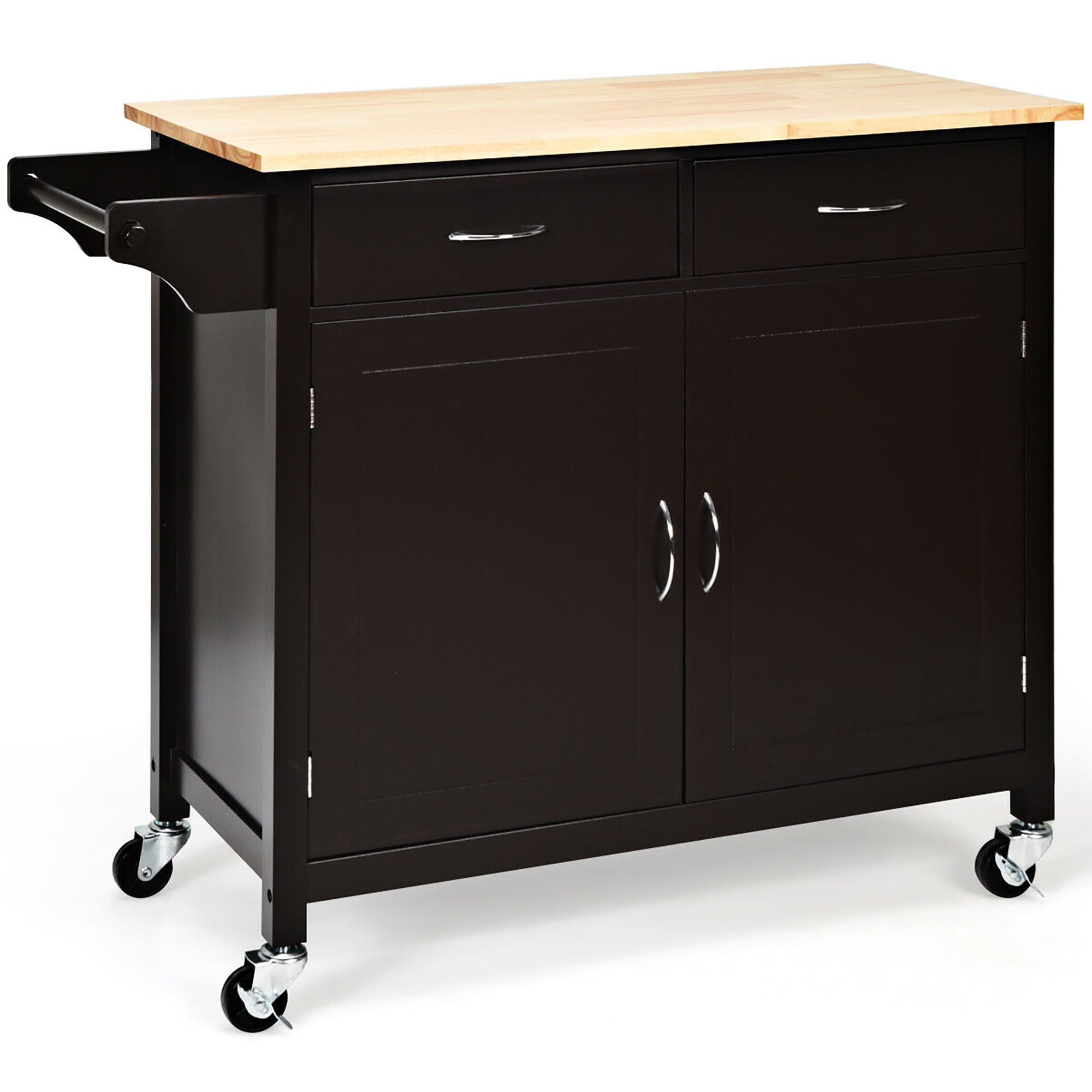 The well-organized rolling kitchen trolley is stylish and versatile to offer you much additional storage space. Providing extra storage space, the kitchen cart has two and a cabinet with adjustable shelf. The countertop is made of rubber wood, which measures 37.5″x19″ and can bear the weight of 80 lbs. You can keep the wine or some tableware on it. The kitchen cart comes with 4 smooth universal wheels to meet your desire of moving everywhere, and 2 lockable wheels help it stop anywhere at will by just stepping on the brake. In addition, the towel rack and handle on the drawer offer more convenience and make it an effortless way to use the kitchen cart. This kitchen cart also features stylish and modern design, and it will add elegance to your house definitely. It will be the best partner whether you’re cooking or treating guests. Feature Ample storage spaces keep the room more organized and tidy The cabinet with adjustable shelf is great for storage Sturdy wood frame, stable and durable for long time use Rubber wood countertops are waterproof and moistureproof 4 universal wheels (2 of them are lockable) offer flexible moving and stopping Simply design with elegant appearance to be widely used in many occasions 2 drawers and 2-tier large cabinet for storage and display Perfect kitchen addition to any apartment or home Considerately equipped with the towel rack Assembly video: Specification Material: MDF + Pine + Rubber Wood Net Weight: 68 lbs Overall Dimension: 43″ x 19″ x 35.5″ (L x W x H) Load capacity of Tabletop: 80 lbs Load capacity of Shelf: 22 lbs Package includes: 1 X Kitchen Cart 1 X User Guide