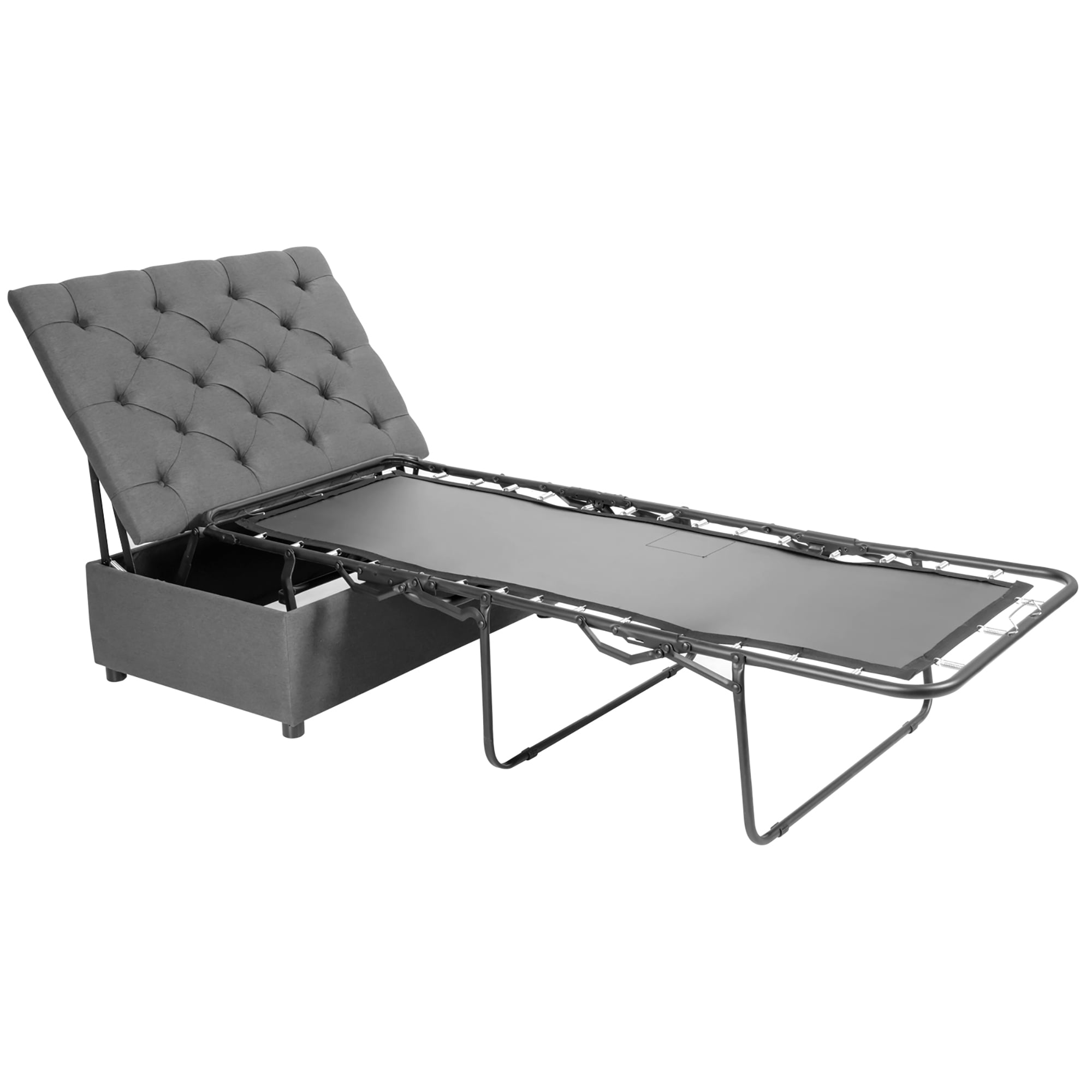 Costway Modern Solid Wood Folding Beds with Ottoman, Grey Versatile use as a bed, ottoman, or footstool Unique folding design allows easy transition between functions Stable and solid construction with a strong steel frame High-strength springs under the mattress for shock absorption Anti-skid foot pads enhance safety and protect floors
