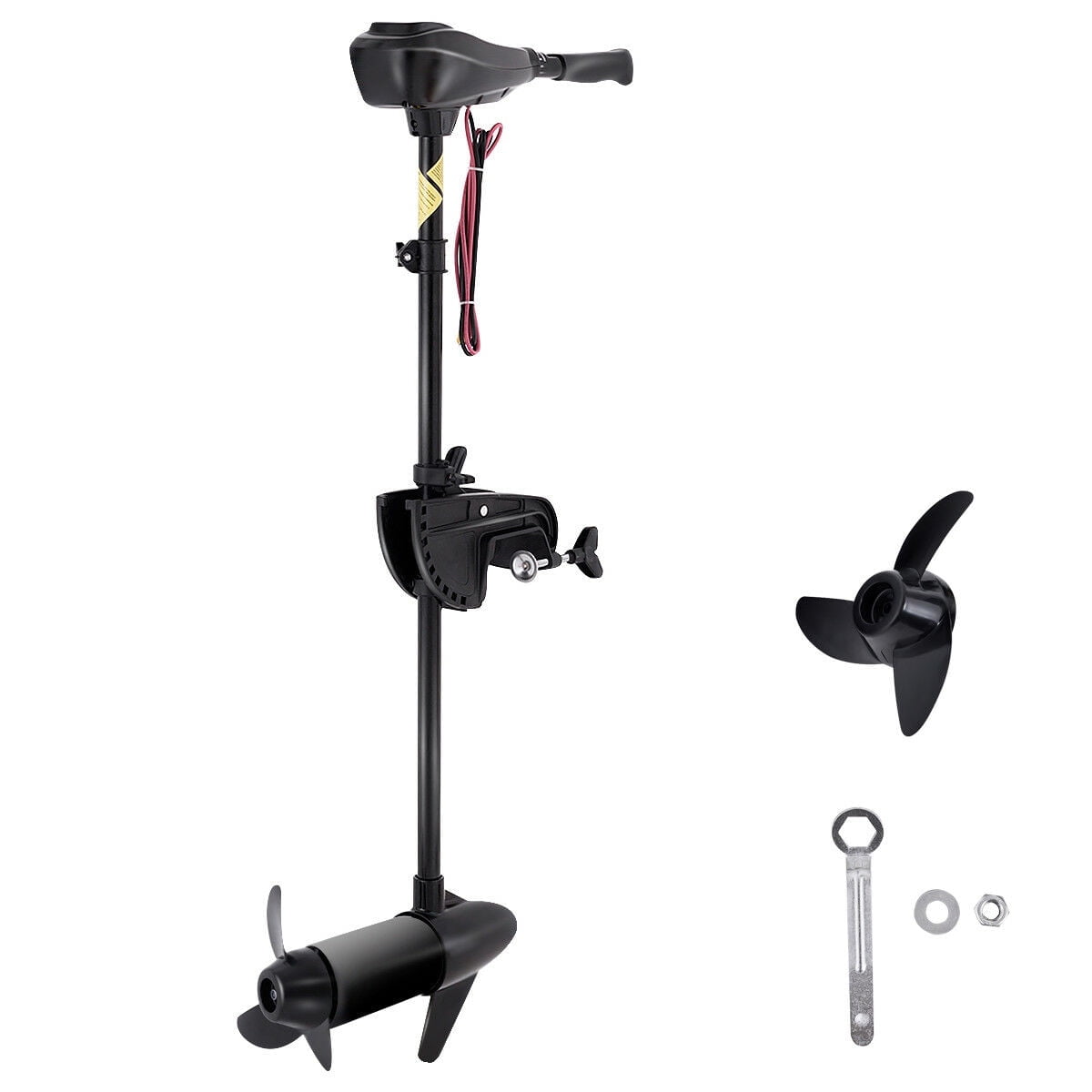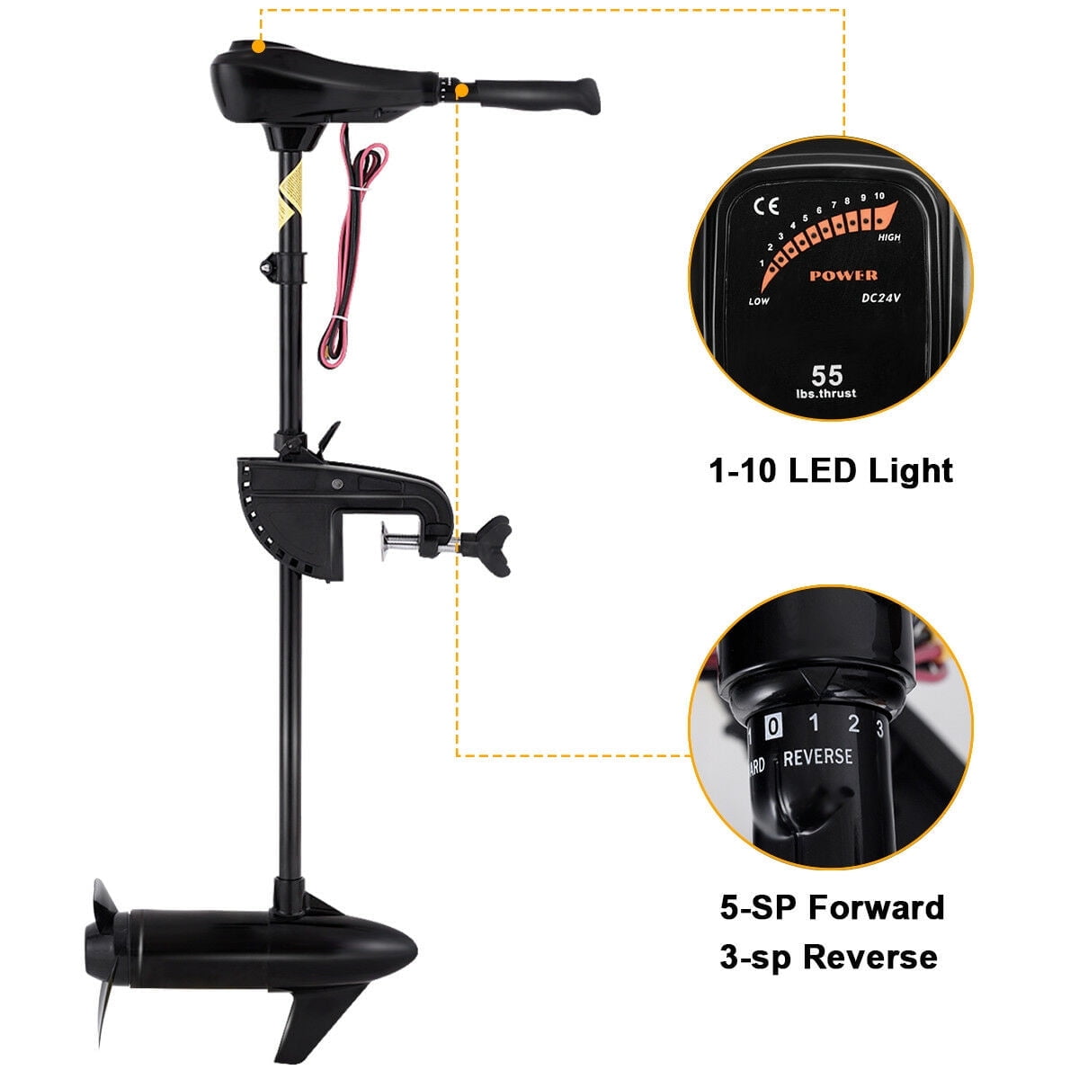Feature: 6” telescoping adjustable handle Durable multi-position angle adjustment aluminum mount 3 blades 10 points LED lights battery indicator CE and ROHS certificate Specification: Speeds: 5 forward/3 reverse Maximum Thrust: 55 lbs Shaft Length: 36” Volts: 12 V Propeller: 3 blades propeller Package includes: 1 x trolling motor and 1 x operation manual