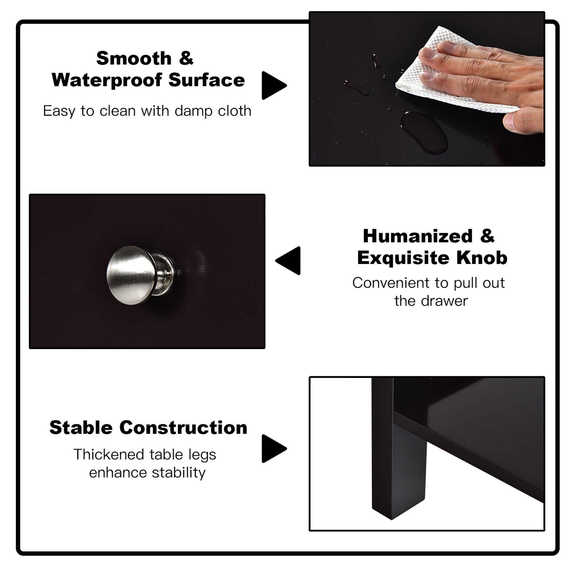 Sufficient Storage Space: Equipped with 1 sliding drawer and 1 lower open storage shelf, this 2-tier nightstand provides ample space for storing your bedside essentials or other sundries. Besides, the spacious tabletop allows you to place cups, glasses, family photos, lamps, alarm clocks and more. Versatile Use & Handy Details: Depending on your needs, you can use this table as a nightstand in the bedroom, a sofa table in the living room or a display cabinet in the hallway. The compact and lightweight design makes it easy to move to any ideal place. In addition, the drawer is easy to pull out with the tiny and practical knob. Modern & Simple Charm: This modern and simple end table is a perfect combination of practical storage and home decoration. With elegant appearance and concise lines, this 2-tier nightstand can blend into any home decor and add a sense of delicacy to your room. Sturdy Frame & Durable Material: The entire bedside table is made of high quality MDF together with engineered wood, which ensures strong stability and durability for long lasting use. The tabletop can support weights up to 66 lbs/30 kg while the drawer and shelf can hold up to 11 lbs/ 5 kg. Easy to Assemble & Clean: Coming with detailed instruction and necessary hardware, it is easy to assemble this nightstand. Simply tighten the screws and push the drawer in, then the nightstand is by your side. Besides, the surface of this side table is sprayed with waterproof paint for easy wipe cleaning.