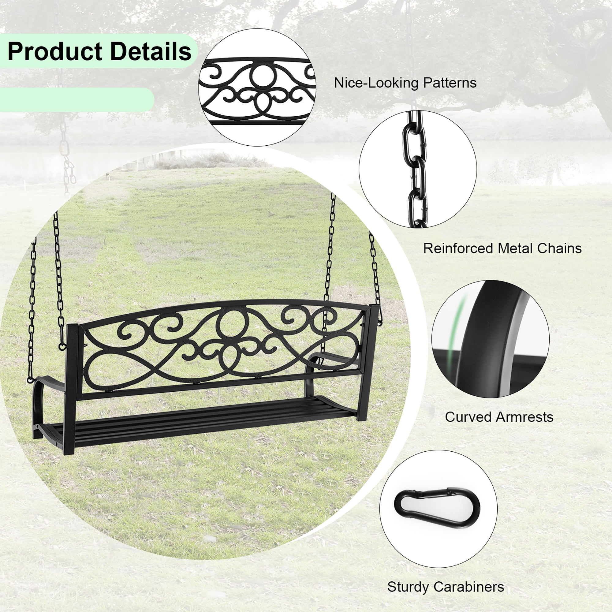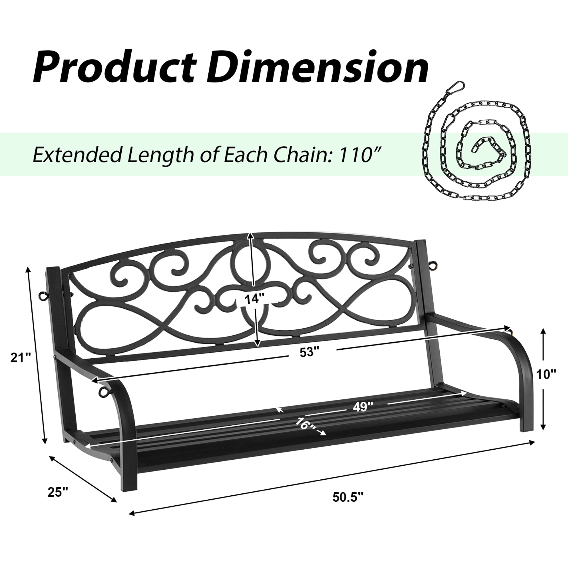 This is our retro swing bench for two people. It will allow you and your family to enjoy outdoor leisure time! This beautifully designed swing chair will perfectly go with your outdoor furniture. You can enjoy sunny days or cool summer nights on this elegant bench swing. Featuring strengthened metal frame, this swing bench is not only rustproof but also resistant to damage. Curved armrests and hollowed backrest make you sit with more coziness. The extra wide seat allows you and your beloved one to swing back and forth together. And if you want further comfort, you can also place a cushion on the seat. Feature Sturdy and rustproof metal frame ensures high stability and durability 49” spacious seat allows 2 people to swing together Curved armrests and breathable backrest provide much comfort Retro and stylish appearance makes the swing bench quite eye-catching 110” extra-long hanging chains make it suitable for more places Ideal for porch, park, balcony and backyard Simple to assemble with complete hardware and the clear instruction Specification Color: Black Material: Metal Overall Dimension: 53” x 25” x 21” (L x W x H) Dimension of Sitting Area: 49” x 16” (L x W) Extended Length of Each Chain: 110” Net Weight: 38.5 lbs Weight Capacity: 485 lbs Package Includes: 1 x Porch Swing Bench 1 x Instruction