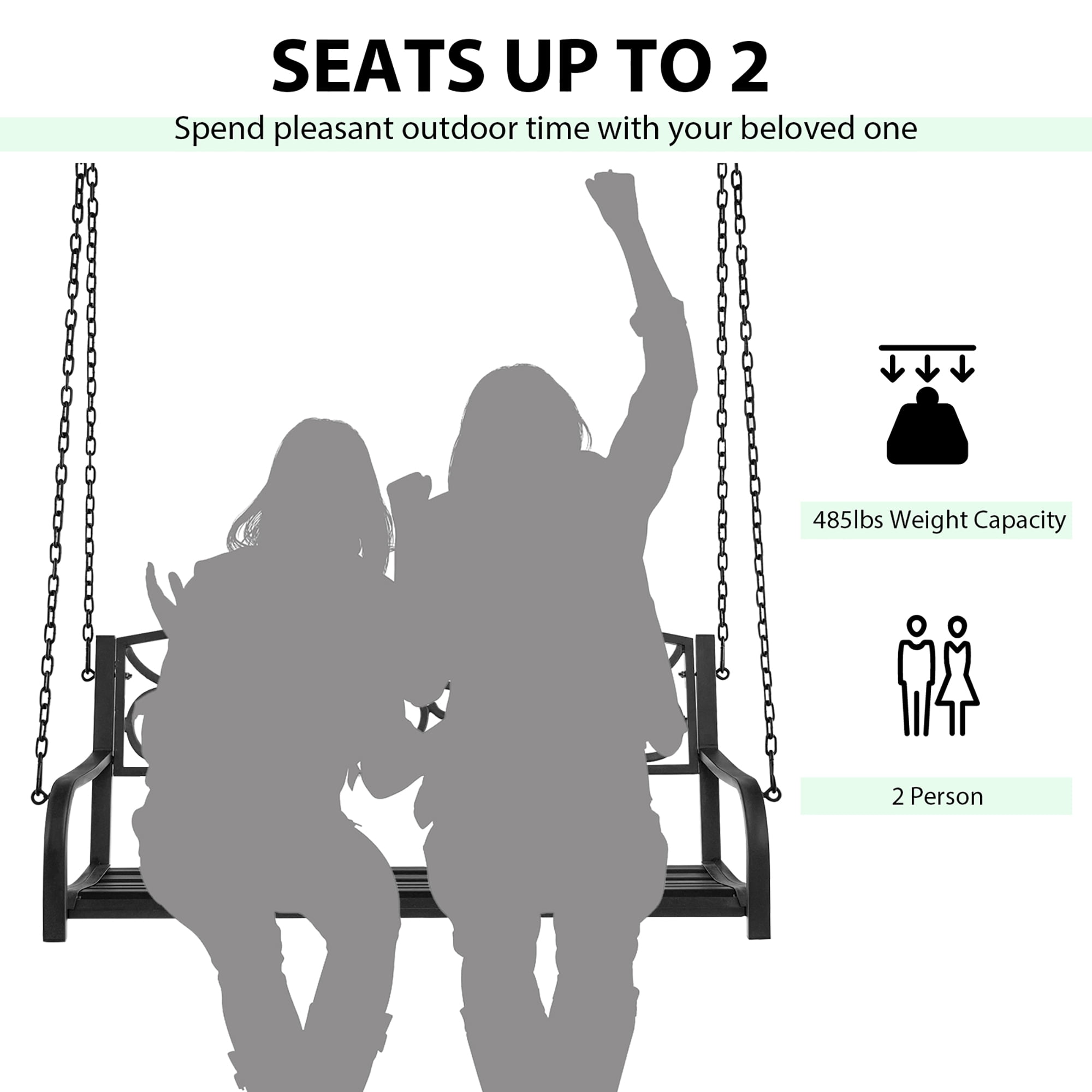 Heavy-Duty Metal Structure: This 2-seat porch swing is made of high-grade and super sturdy metal pipes, which resist to deformation and bending. The plastic sprayed surface effectively prevents the metal pipes from rust, making it weather resistance and ideal for long-time outdoor use. Wide & Comfortable Seat: The 49” wide sitting area is perfect for 2 people to swing together, allowing you to spend pleasant outdoor time with your beloved one. Also, the porch swing bench is quite comfortable to sit, as its curved armrests well relax your arms and breathable backrest keeps you cool in hot weathers. Elegant Appearance: Our hanging porch swing bench adopts retro style. Its classic appearance is very attractive and has a strong decorative effect. The nice-looking patterns on the backrest adds a piece of elegance to the surroundings. It is a great ornament to the outside occasions, and can add joy and comfort to you. Multiple Hanging Places: The swing bench is equipped with 2 metal chains, each of which is 110” long, much longer than others. Therefore, you can hang the porch swing to multiple places in your wanted height. And you can swing anywhere you want, such as front porch, park, balcony and backyard. Simple Installation: Coming with a detailed instruction and all necessary accessories, the swing bench will be assembled in a correct and high-efficiency way. And sturdy carabiners are also included in the package. The swing bench is able to withstand 485 heavy weight, satisfying the demands of both you and your friend.
