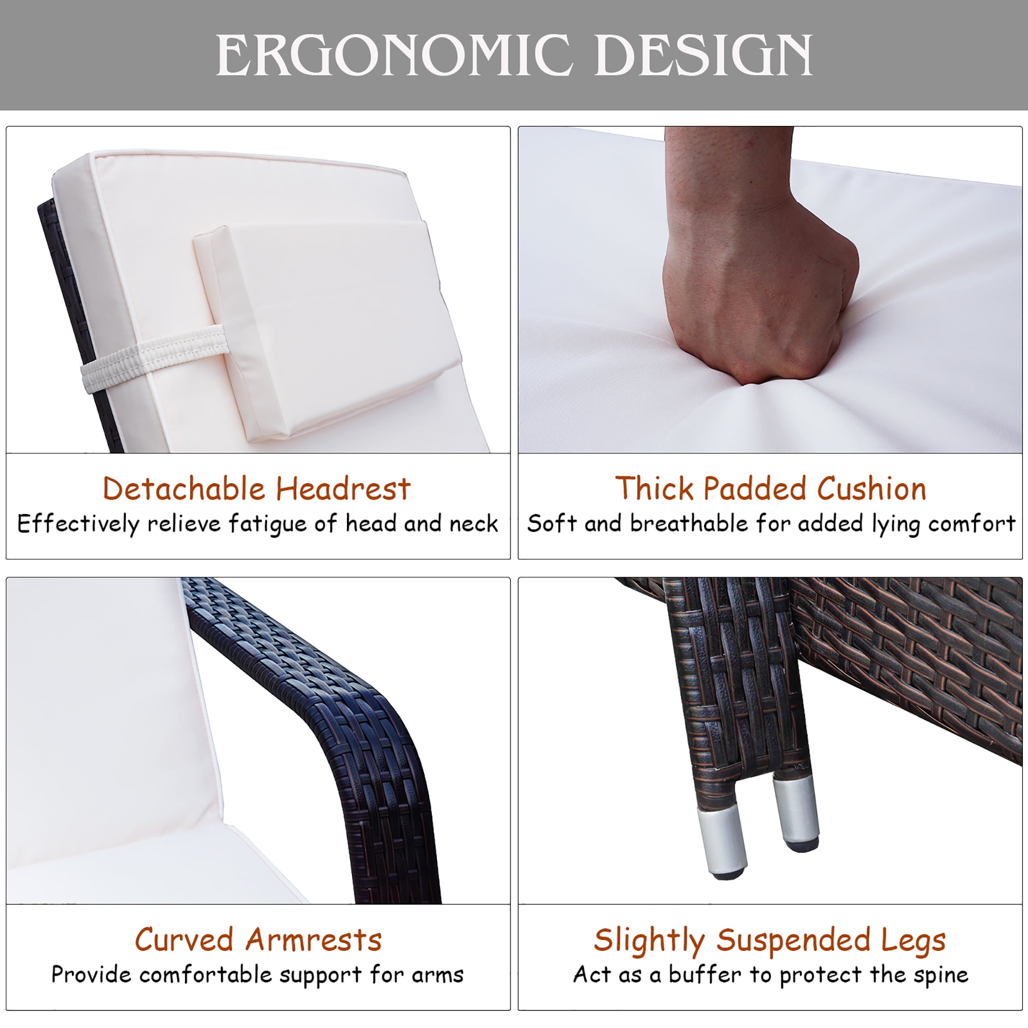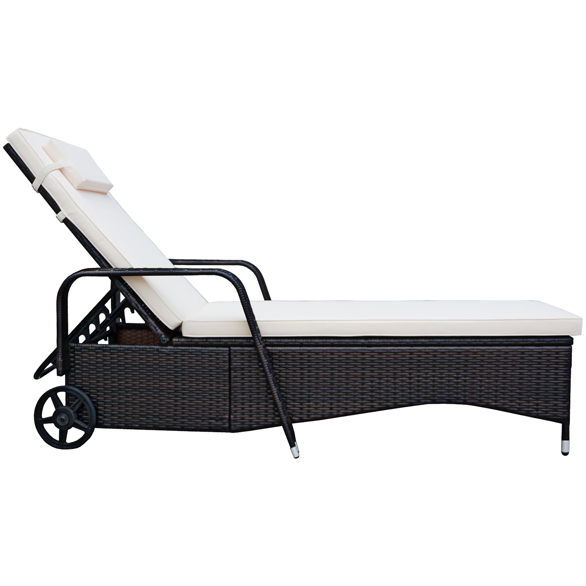 This is our new rattan chaise lounge which is a great addition for your outdoor living room. Made of galvanized steel pipe and rattan ,it will be sturdy and have long lifespan. Thick and soft cushion provide comfortable feeling when laying, additional headrest pillow comes with it .The backrest is adjustable to six angles ,you can adjust it as you like. Two wheels equipped make you easy to move to anywhere. It is suitable for various occasions,which is your best choice for your living room ,garden, poolside, yard, balcony, beach and veranda etc. Feature galvanized steel pipe and rattan construction provide lasting durability The backrest is adjustable to six angle as you like Ergonomic backrest for unexpected comfort Two wheels design for you to conveniently move It can be used for your living room, office, veranda ,swimming pool etc Thick and soft cushion with a pillow provide comfortable feeling Classic appearance design make your home elegant Assemble requirement Specification Color: Brown Material: PE Rattan + Iron + Sponge + Polyester Fabric Product Dimension: 79” x 27.5” x 14” ~ 40.5” (L x W x H) Adjustable Height: 14”~21” ~27.5” ~32.5” ~37” ~40.5” Armrest Height:22″ Cushion Thickness: 2” Net Weight: 34 lbs Weight Capacity: 400 lbs Package includes: 1 x Rattan Lounge Chair 1 x Instruction