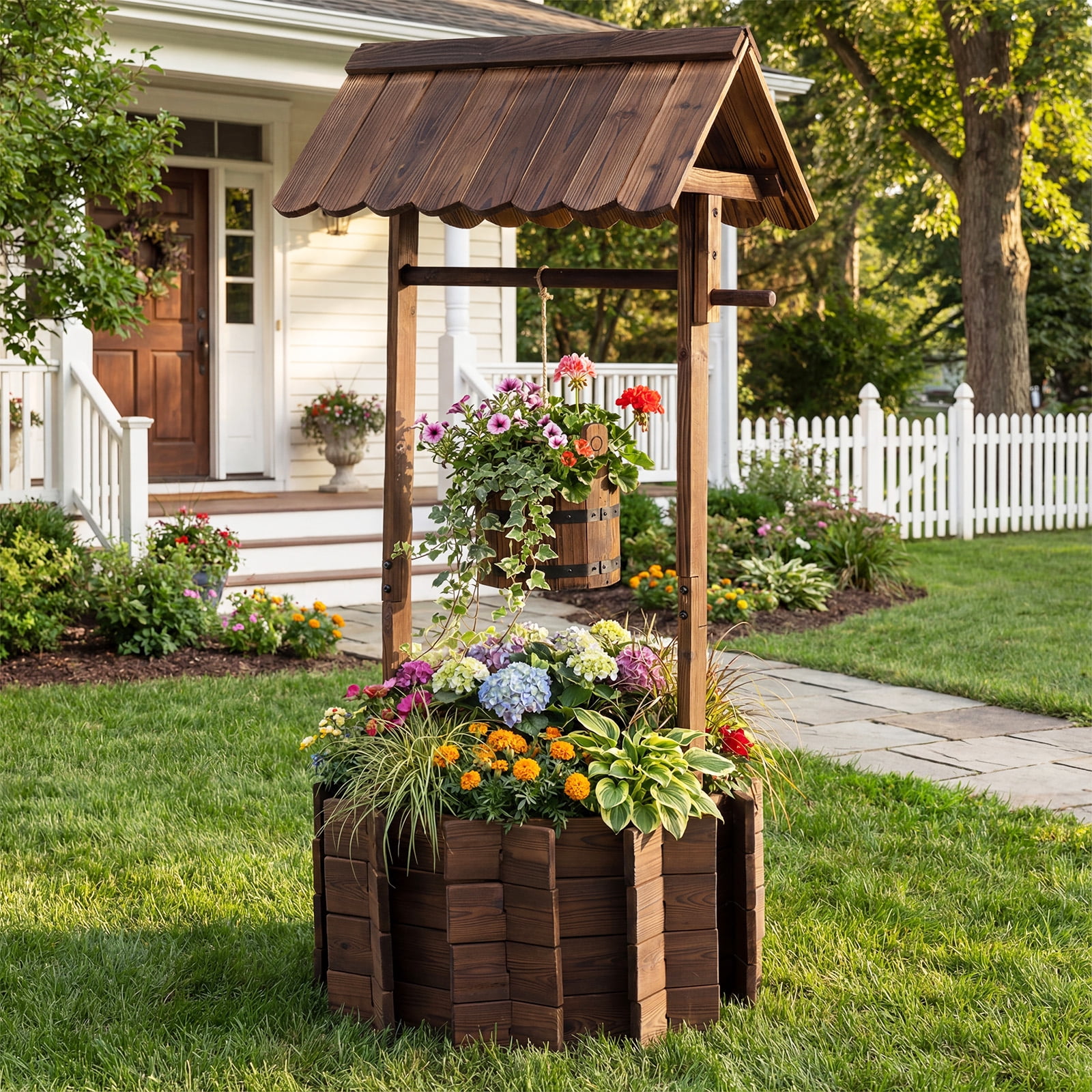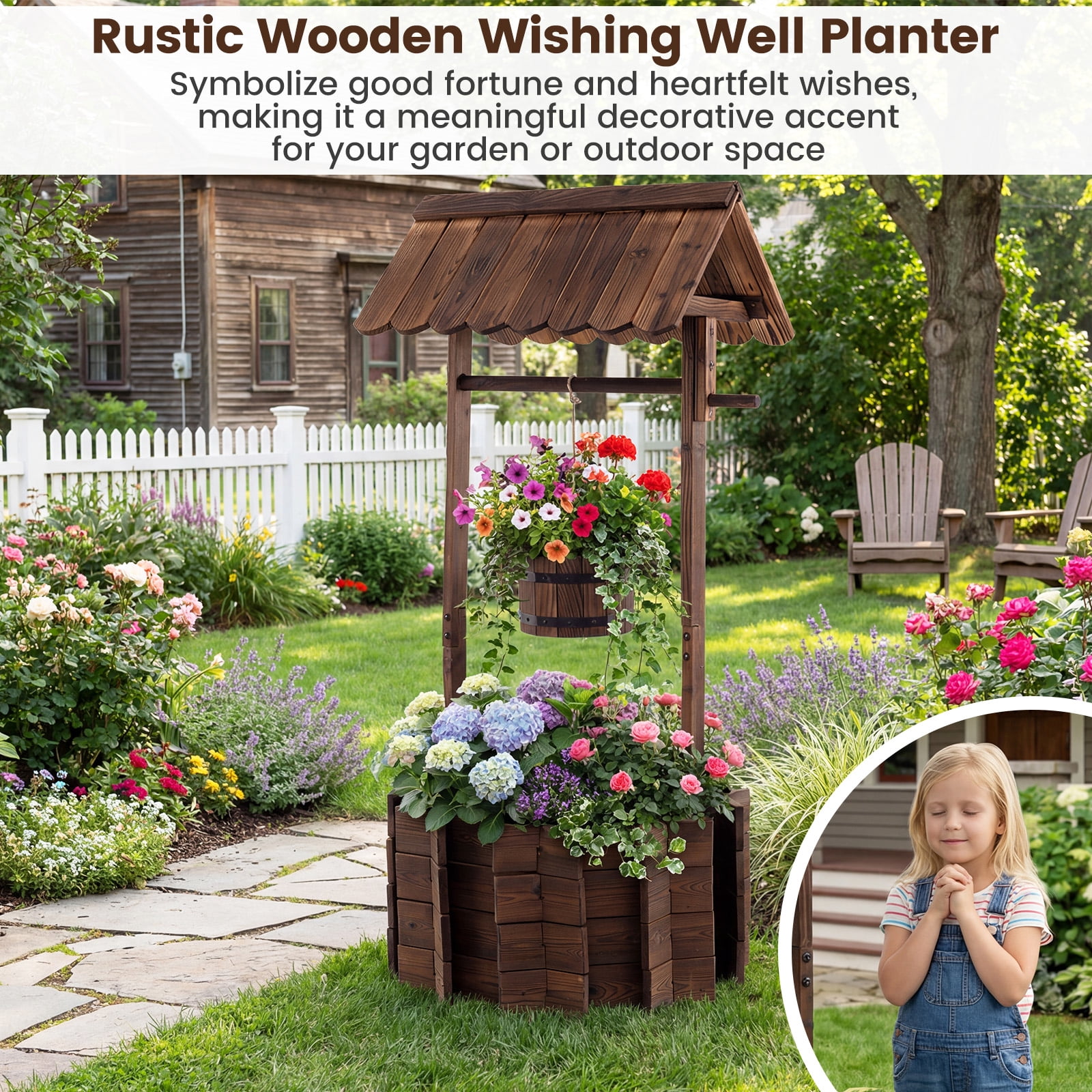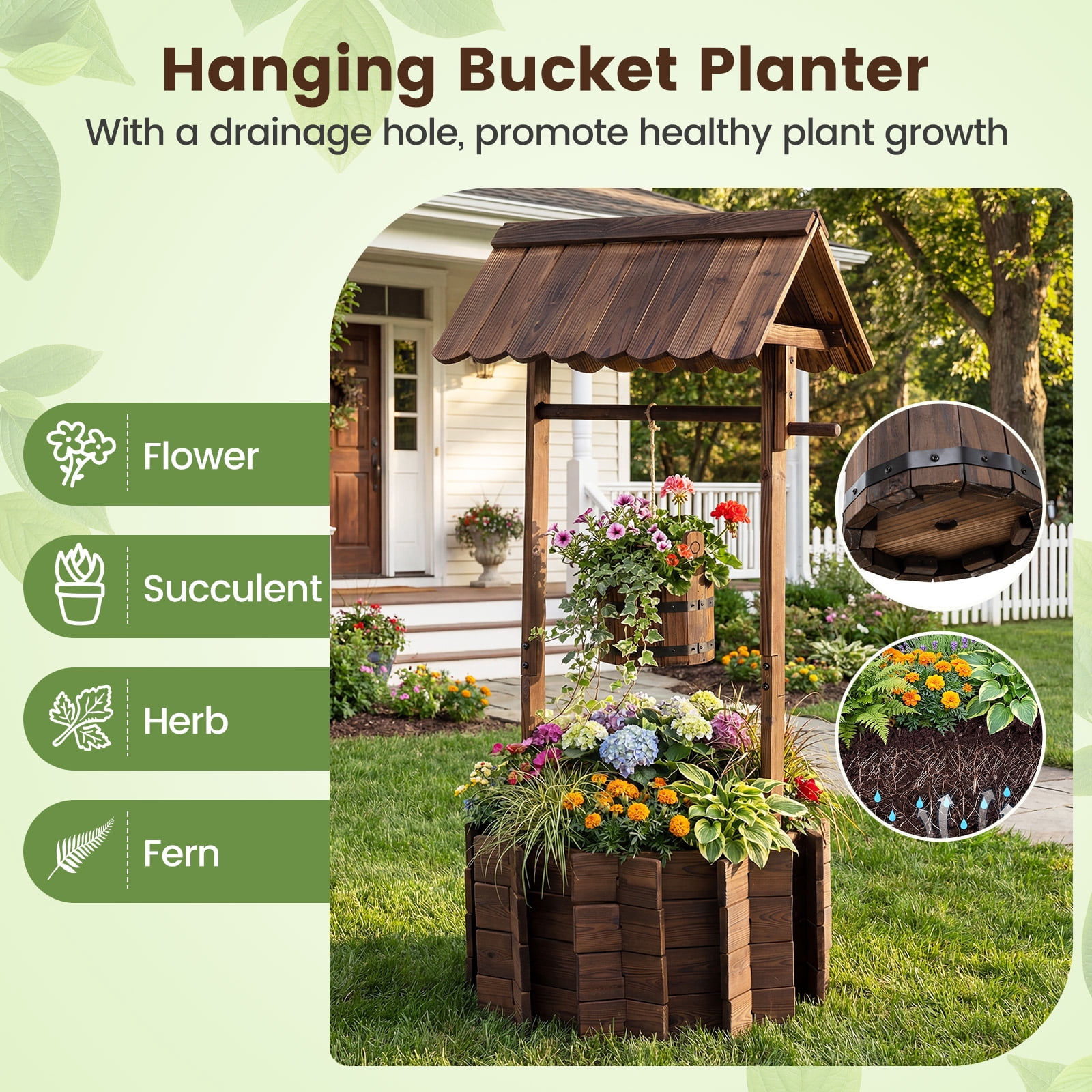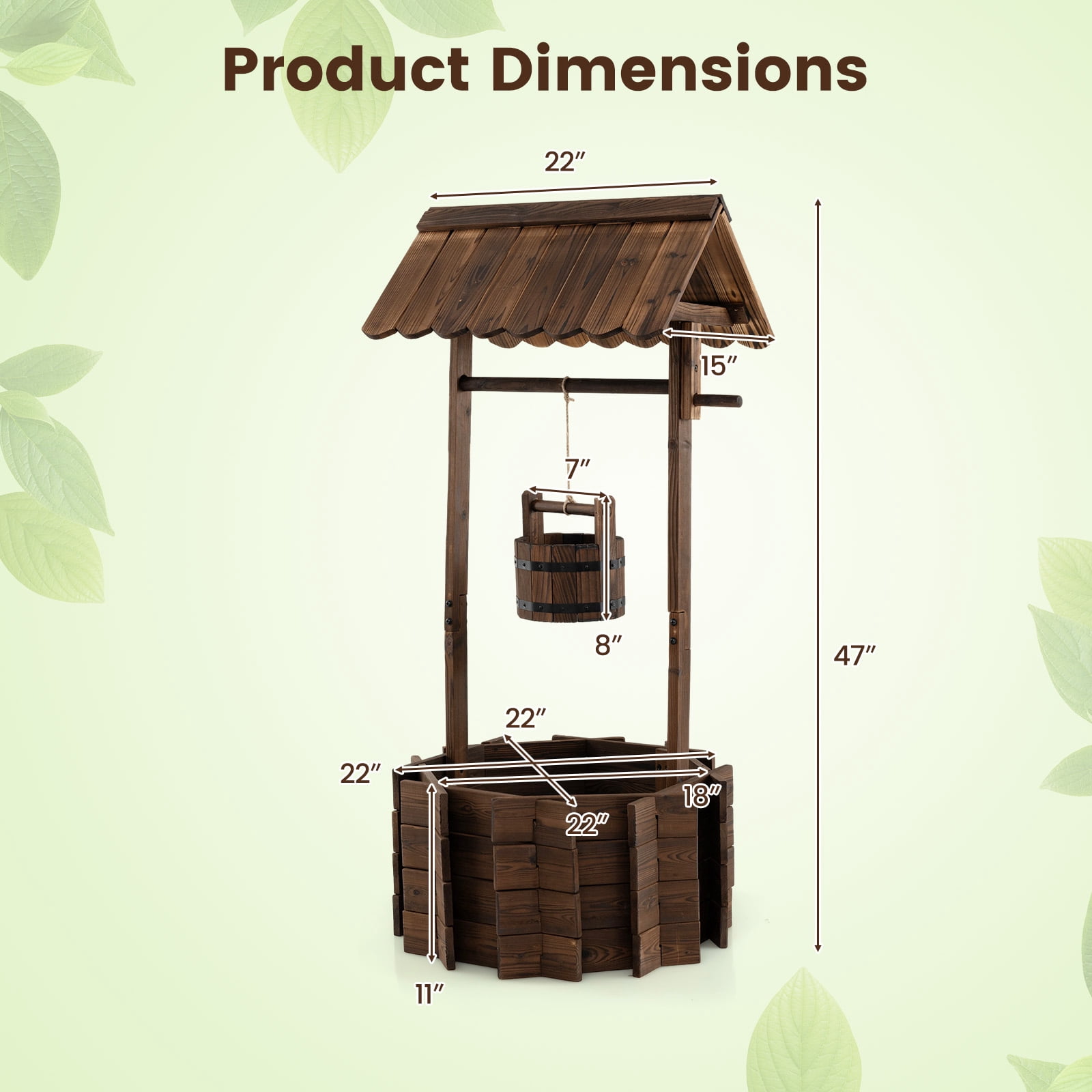 Look at this stylish and beautiful wooden wishing well bucket planter. It will be a excellent decoration to your lawn, backyard, garden and other outdoor living space. This big well allows you to plant your favorite plants and flowers in it, and the bucket is also designed for planting. The wishing well is constructed of solid fir wood that will keep this planter lasting through the season for many years, and it has a burn wood finish for a rustic appearance. Do not hesitate to buy a one to add beauty to your garden. Feature Burnt-like wood finish gives a rustic and stylish appearance to the planter Constructed of solid fir wood that will keep this ready to assembly planter sturdy and long-lasting The 16.5” diameter of the well will allow it to hold multiple plants at once. The bucket can be used to plant smaller plants as well Included string allows you to hang the bucket as low or as high as you’d like Simple assemble need. High quality wooden wishing well: Adjustable & Sturdy rope, Decorative handle, Natural & Exquisite wood grain, Protective roof . Specification Material:fir wood Overall Dimensions:22.0”x22.0”x44.9”(LXWXH) Top Hut Dimensions:21.6”X16.1”X7.4”(LXWXH) Bucket Dimensions:8.5”X7.5”X6.5”(LXWXH) Well Dimensions:22.0”X22.0”X11.8”(LXWXH) Rope Length:37.8”; Weight:23 lbs.
